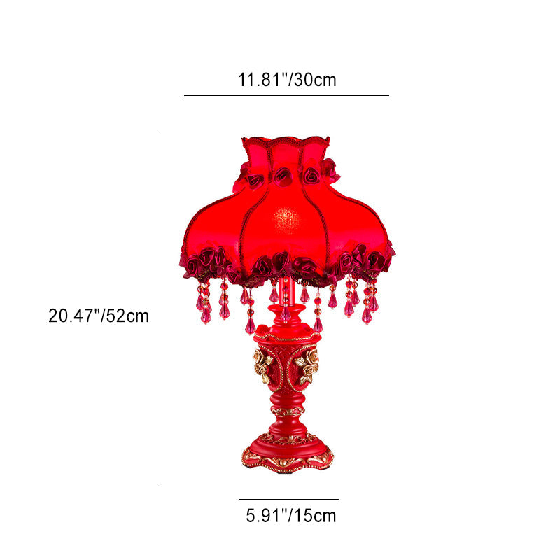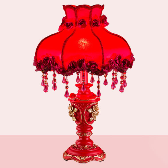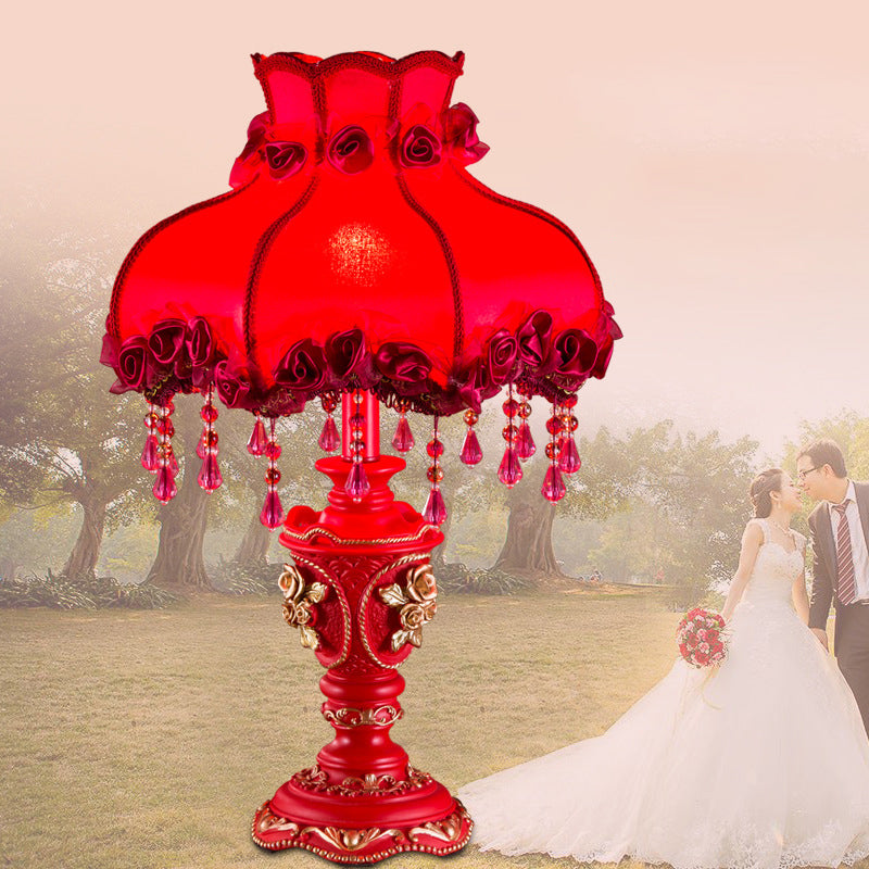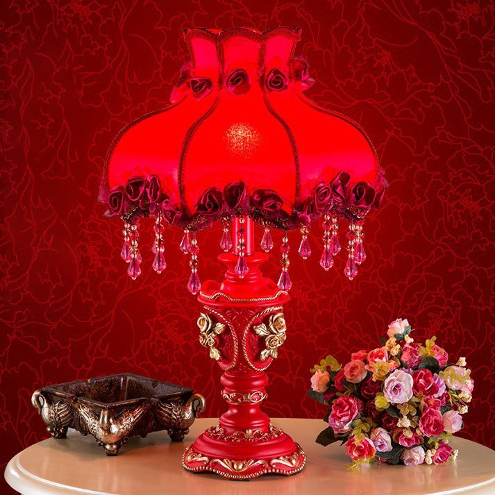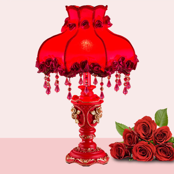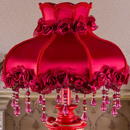 Traditional European Fabric Resin Rose Carved Column Beads Wedding Decoration 1-Light Table Lamp For Bedside