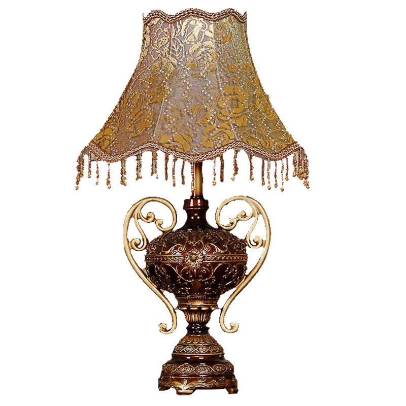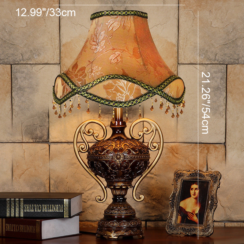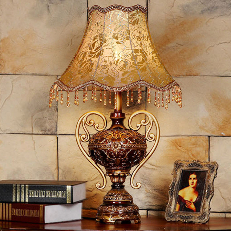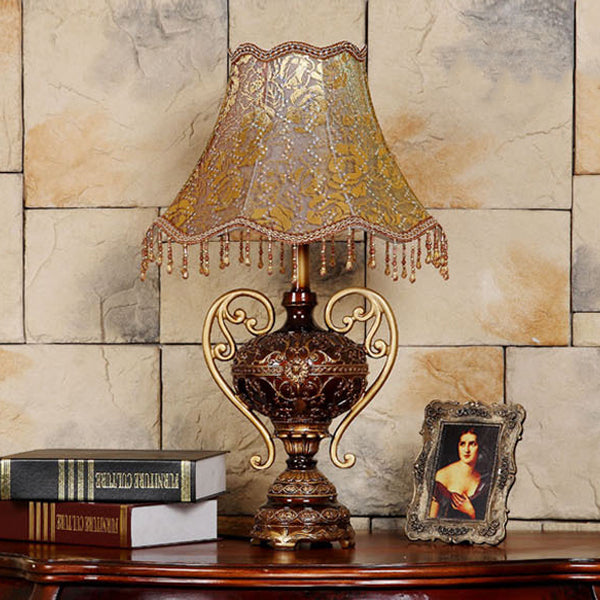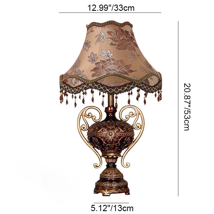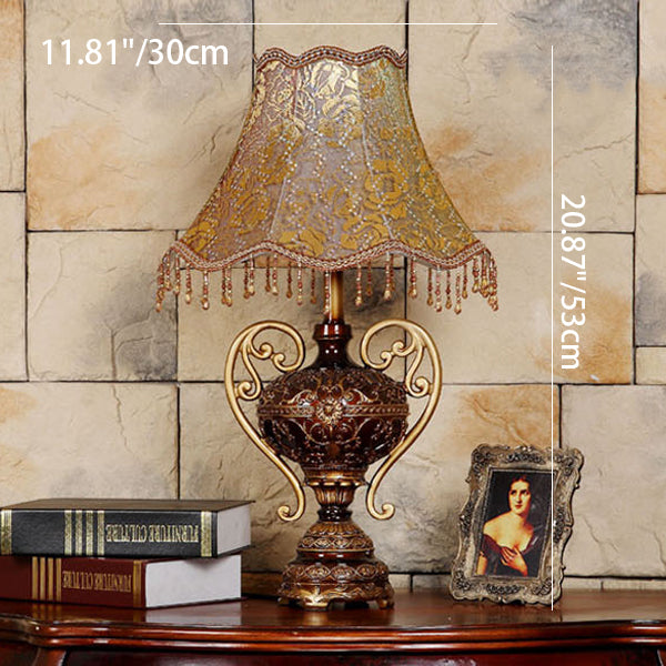 Traditional European Palace Lace Fabric Tassel Shade Carved Resin Base 1-Light Table Lamp For Study