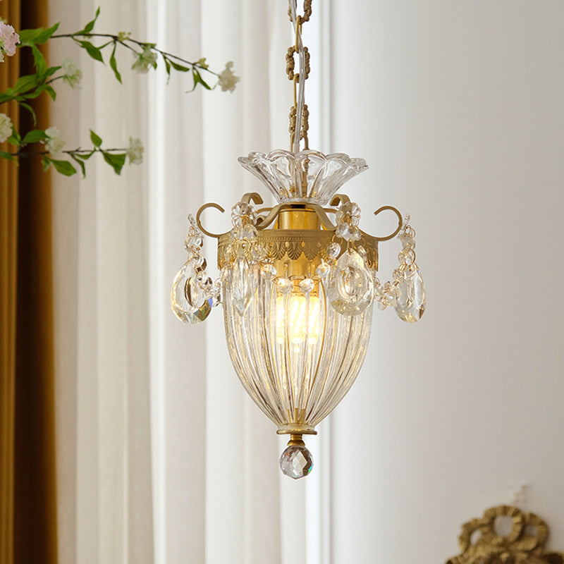 Traditional French Lantern Carved Copper Crystal 1-Light Pendant Light For Living Room