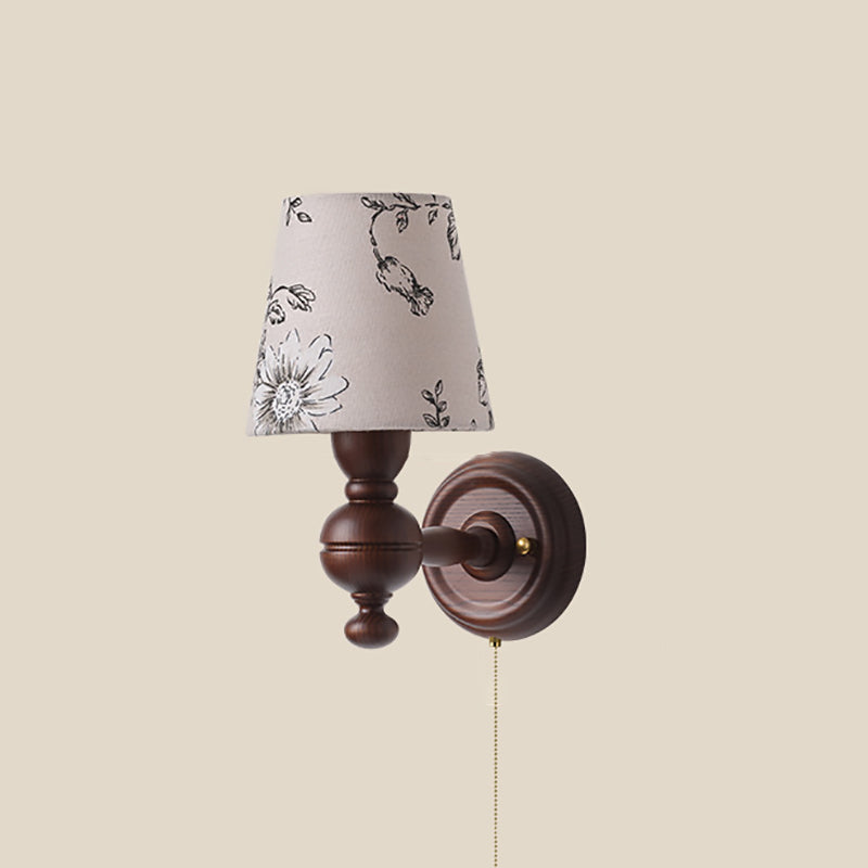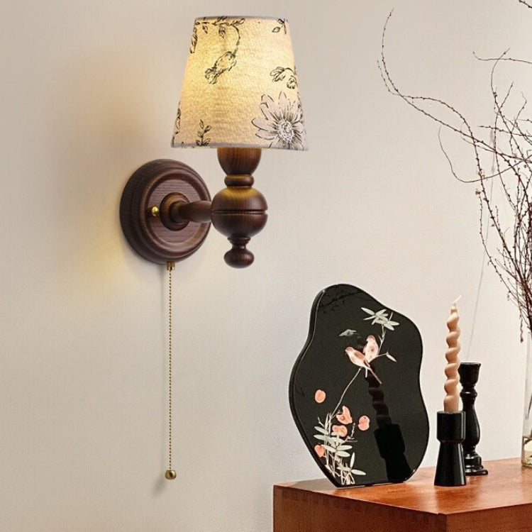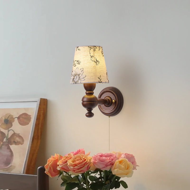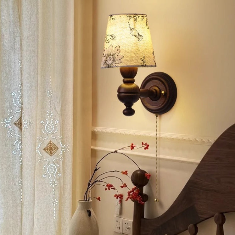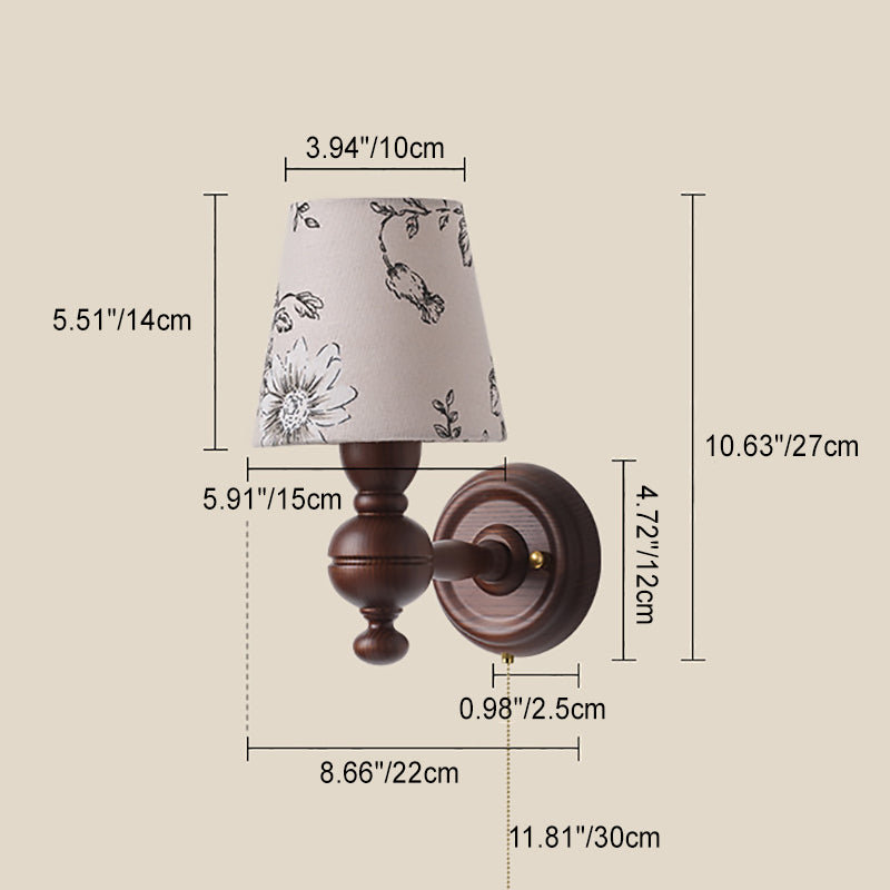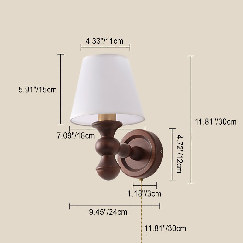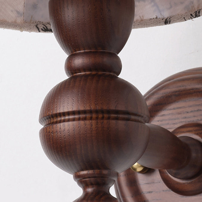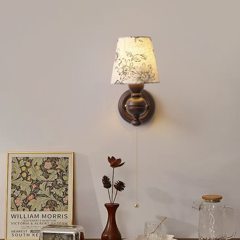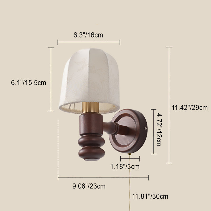 Traditional French Round Trapezoidal Orb Wood Iron Frame Fabric Shade 1-Light Wall Sconce Lamp For Living Room
