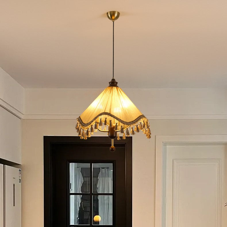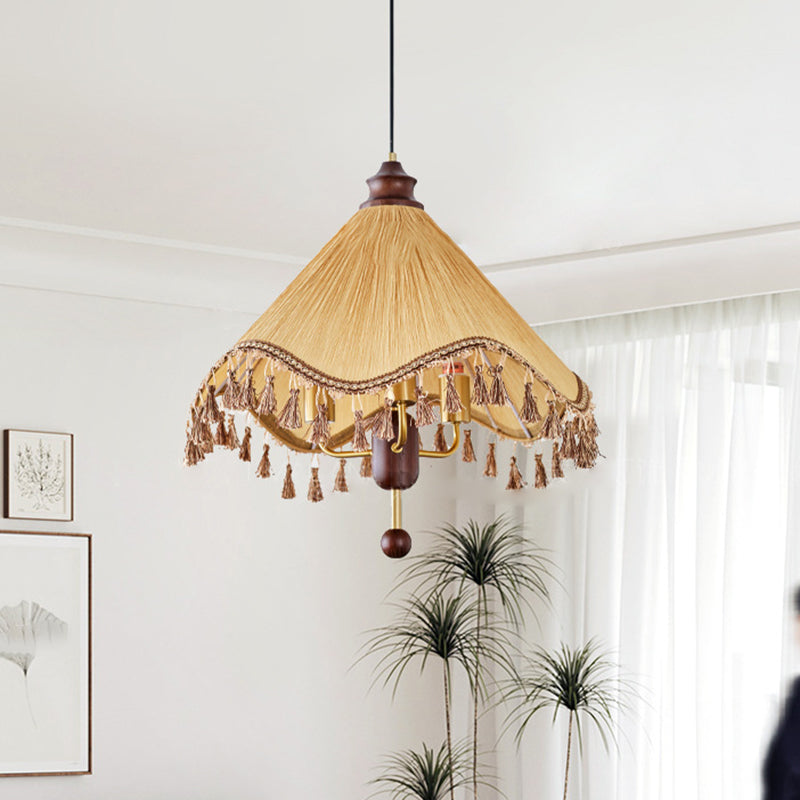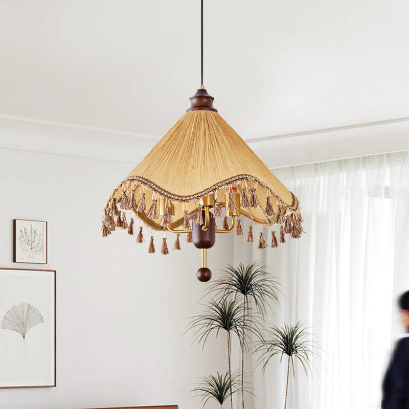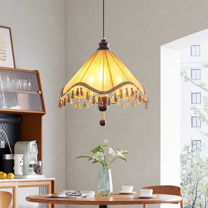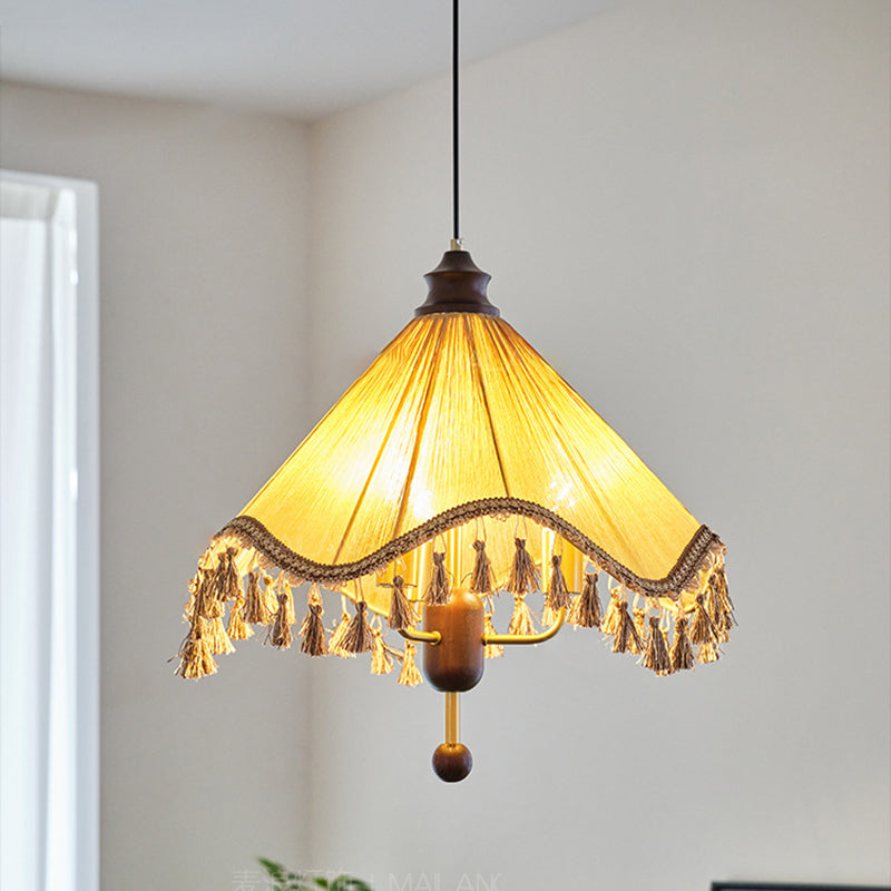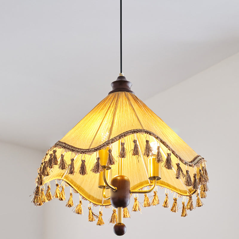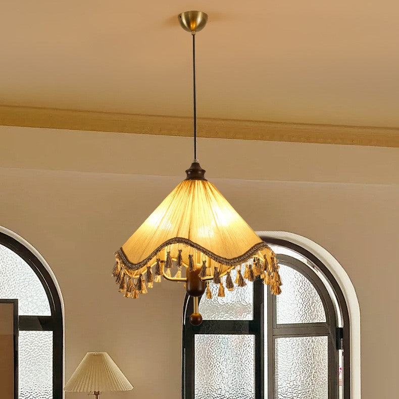 Traditional French Triangle Tassel Fabric Shade Wood Iron Frame 3-Light Pendant Light For Living Room
