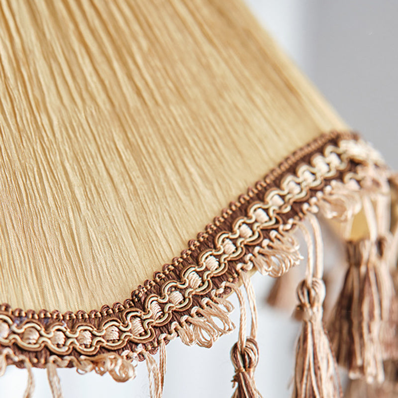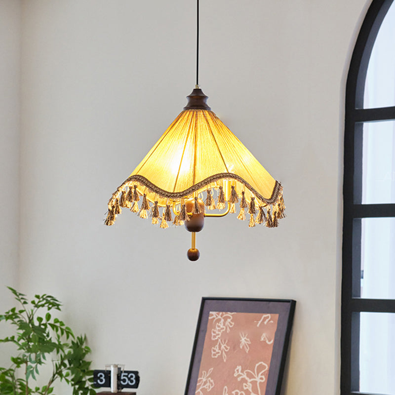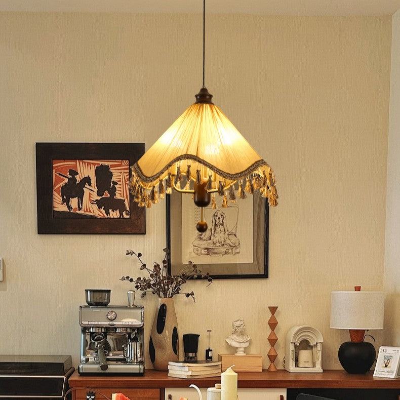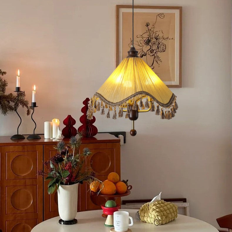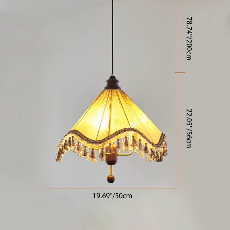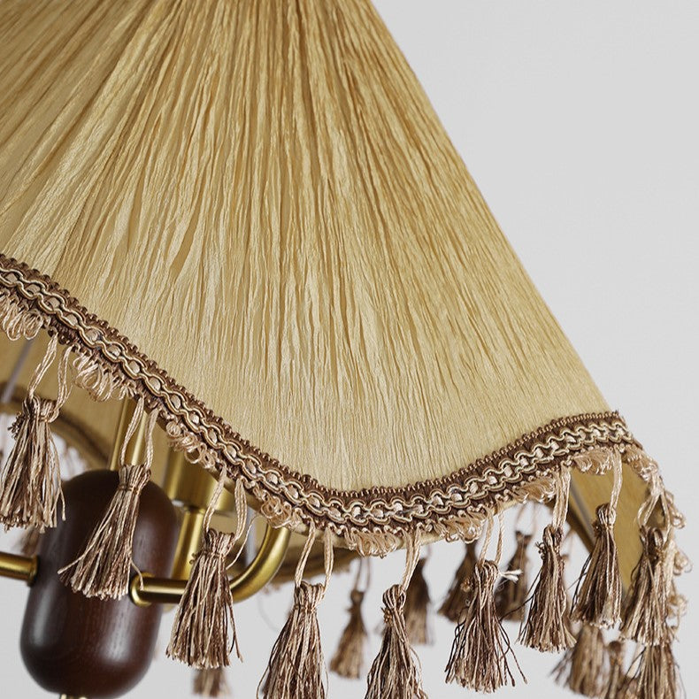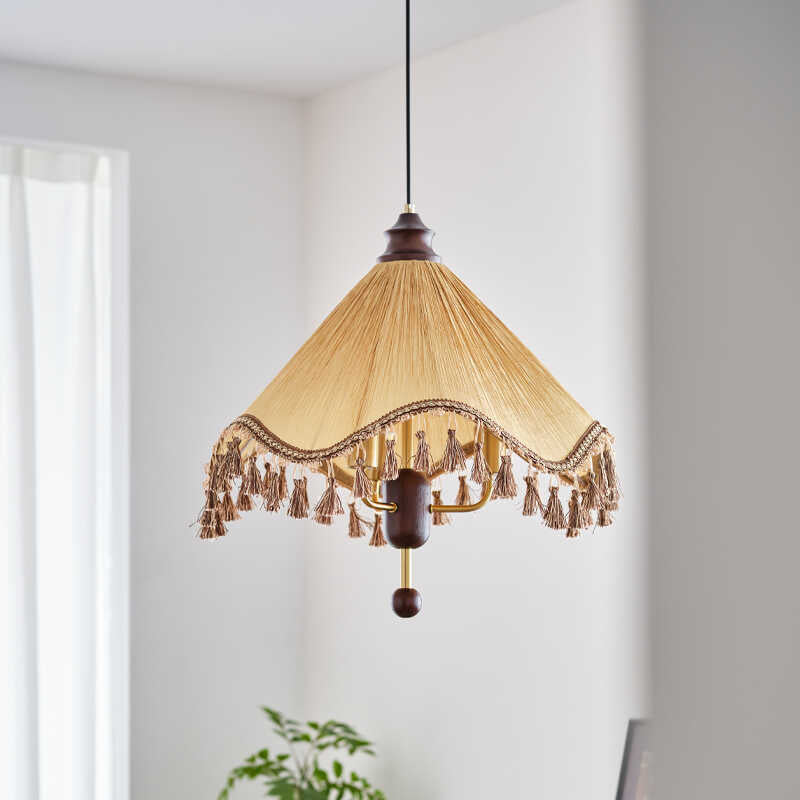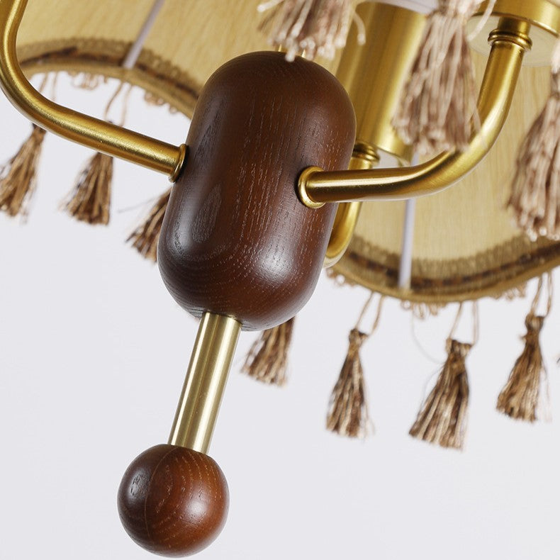 Traditional French Triangle Tassel Fabric Shade Wood Iron Frame 3-Light Pendant Light For Living Room