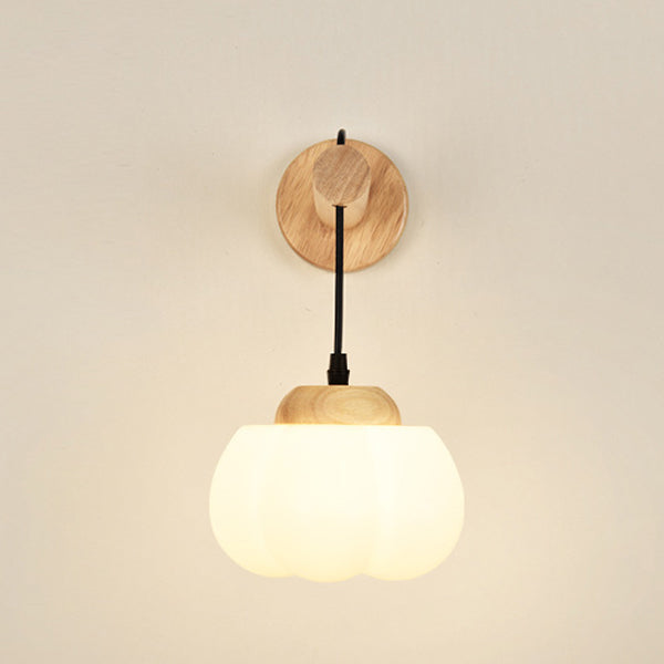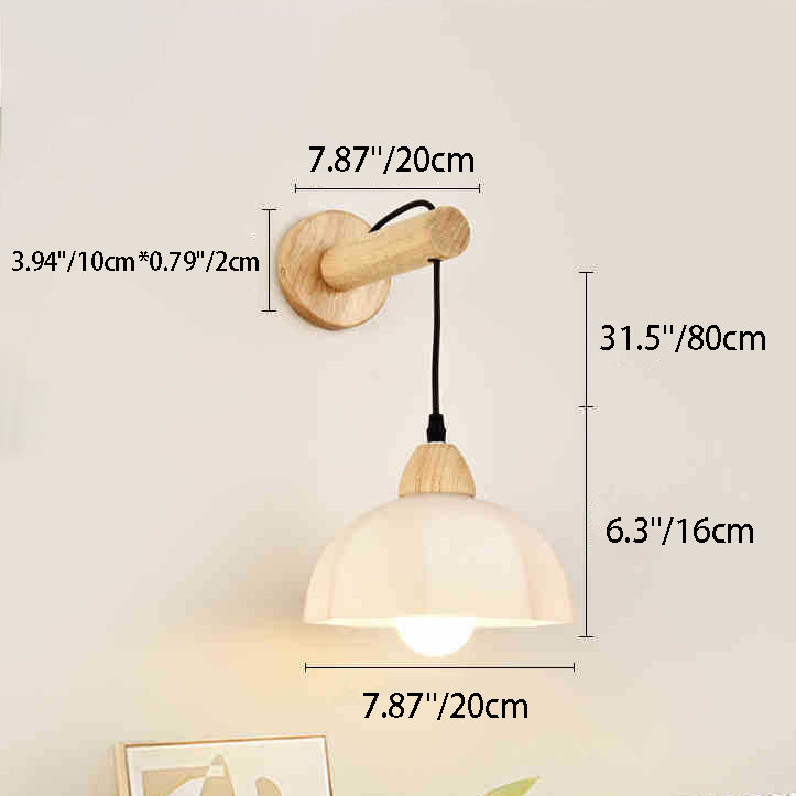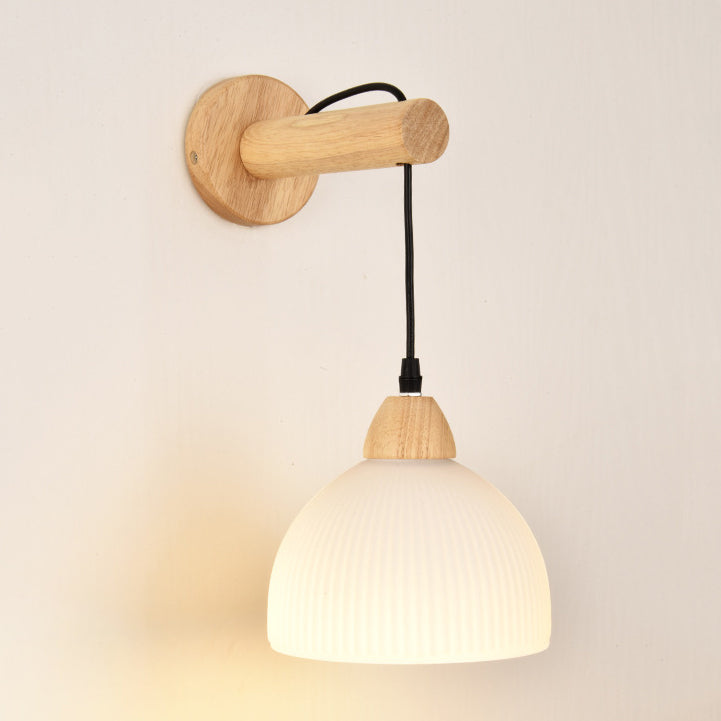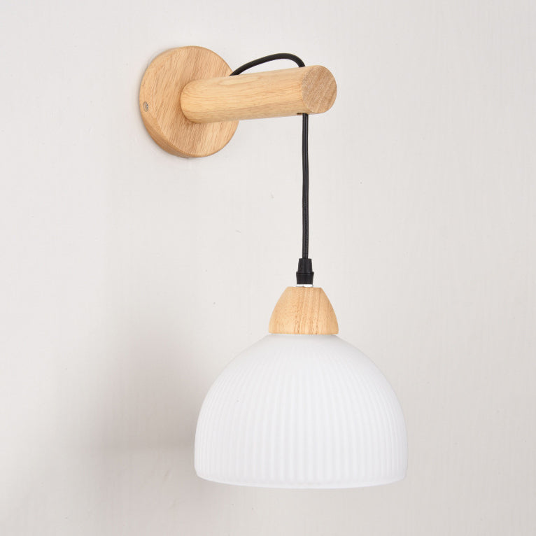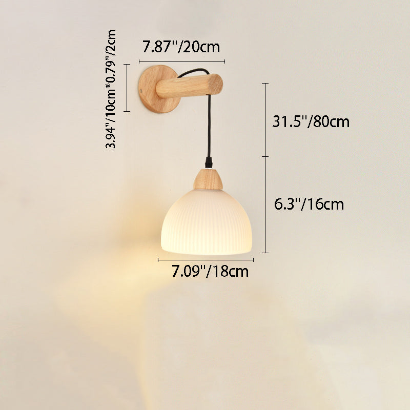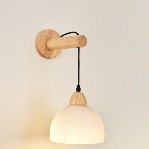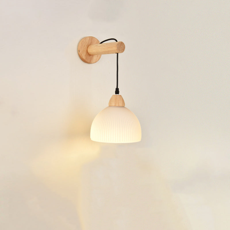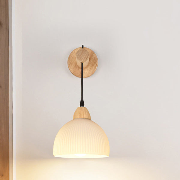 Traditional Japanese Cotton Dome Ribbed Glass PE Shade Wood 1-Light Wall Sconce Lamp For Living Room