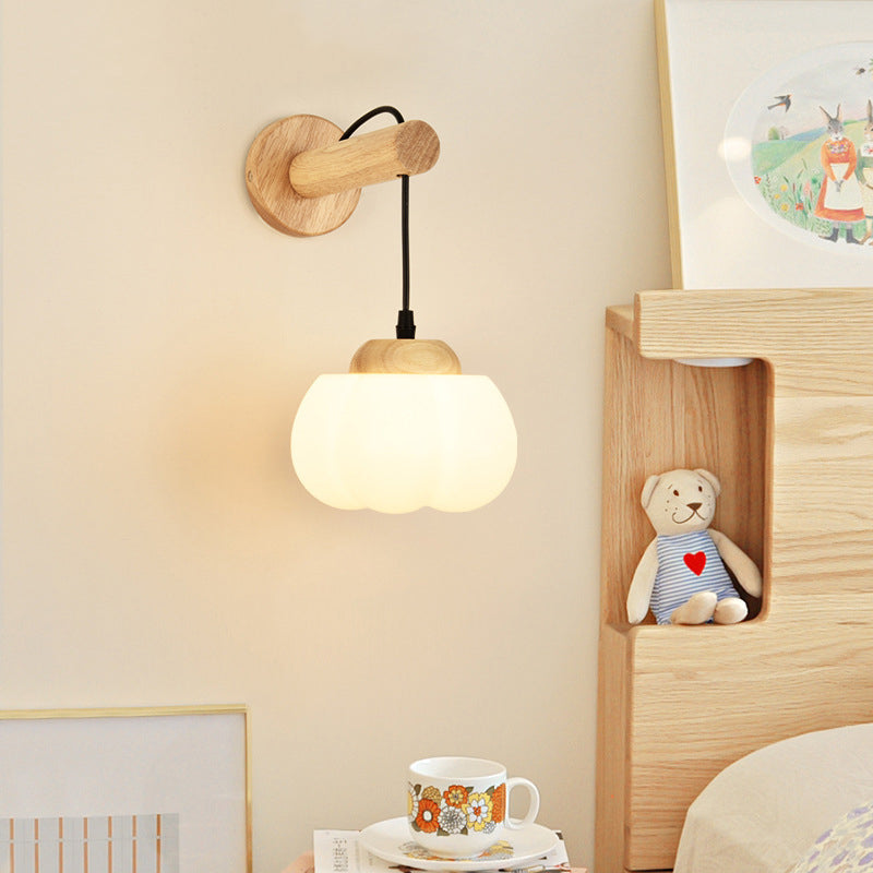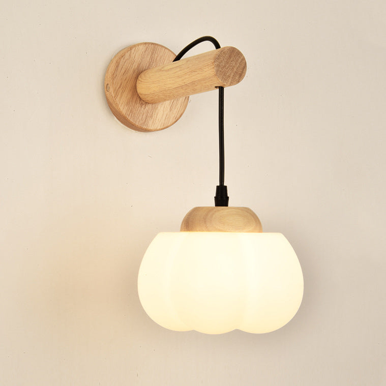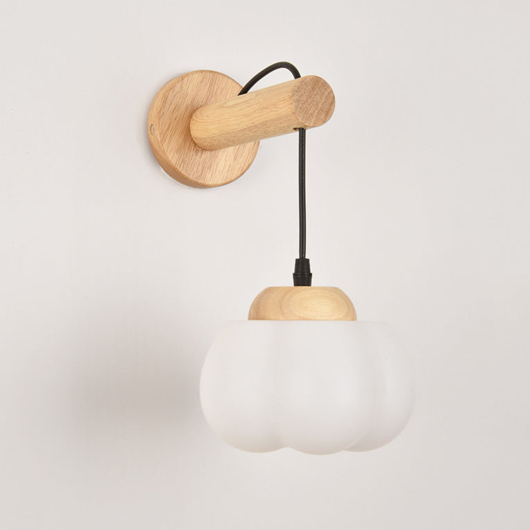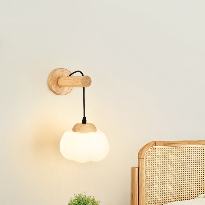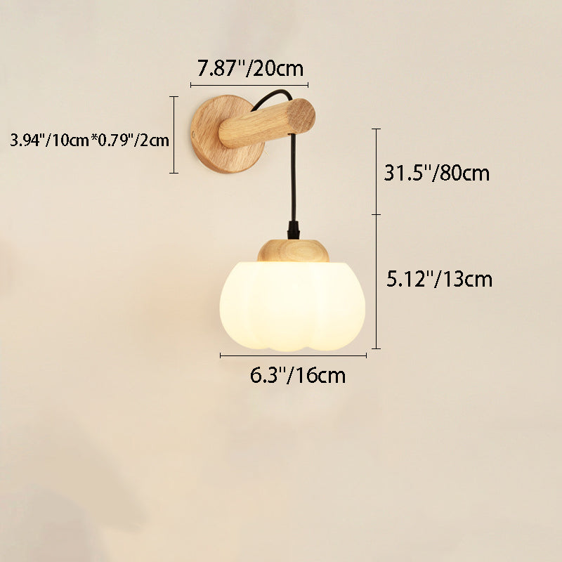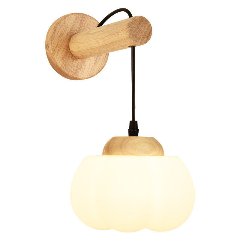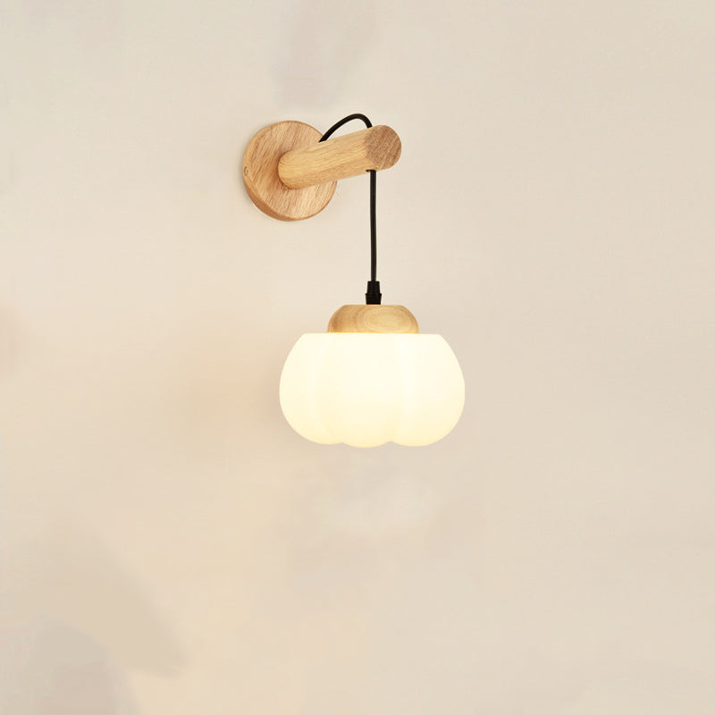 Traditional Japanese Cotton Dome Ribbed Glass PE Shade Wood 1-Light Wall Sconce Lamp For Living Room