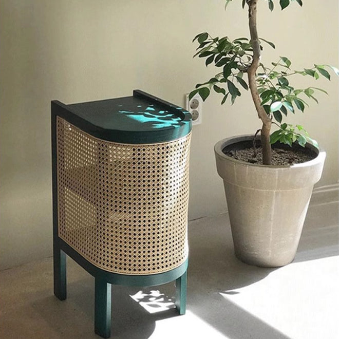Traditional Japanese Oval Tabletop Solid Wood Rattan Nightstand 2-Cabinet For Bedroom