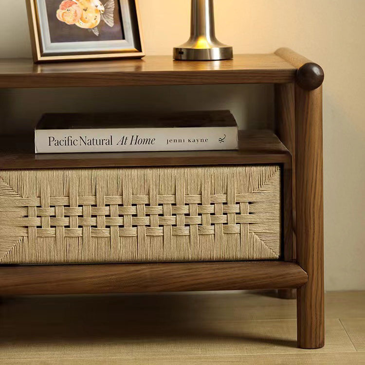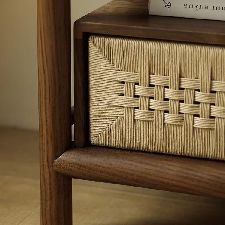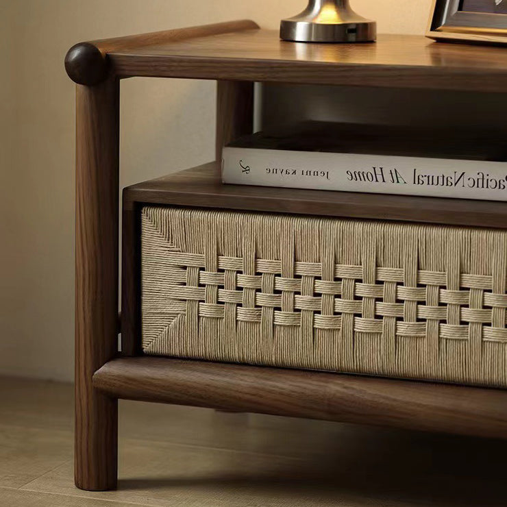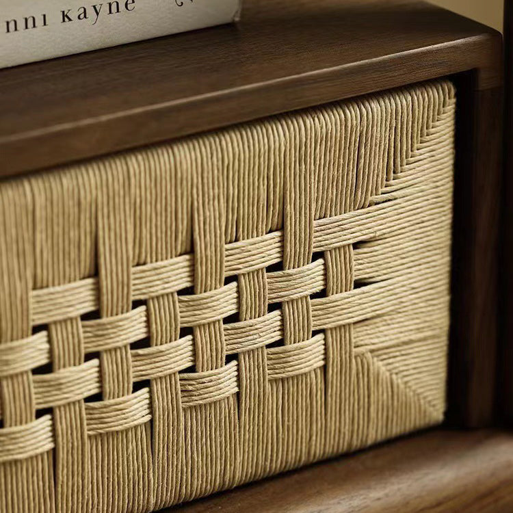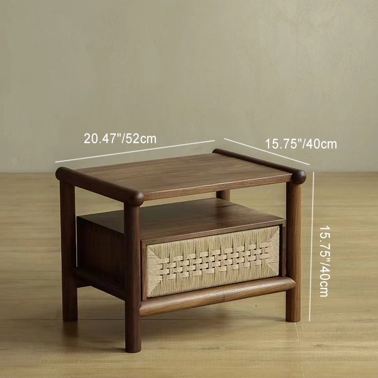 Traditional Japanese Rectangular Black Walnut Rattan Nightstand 1-Drawer For Bedroom