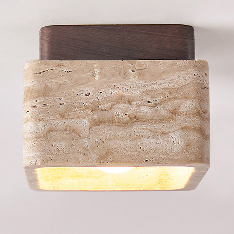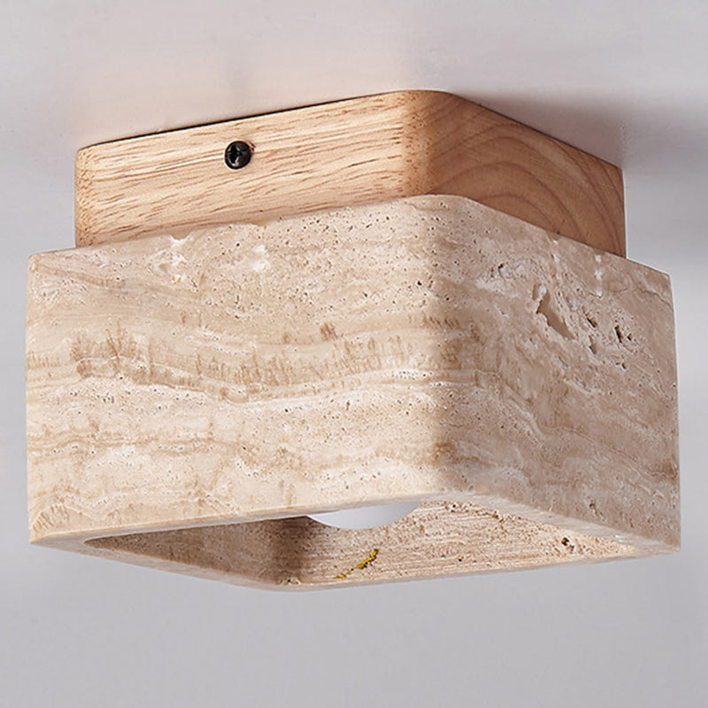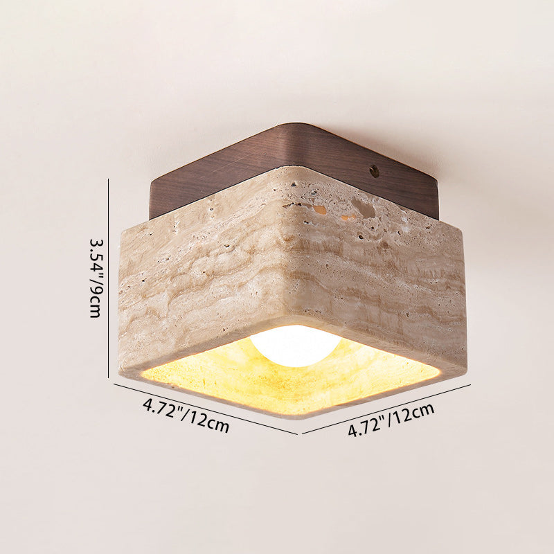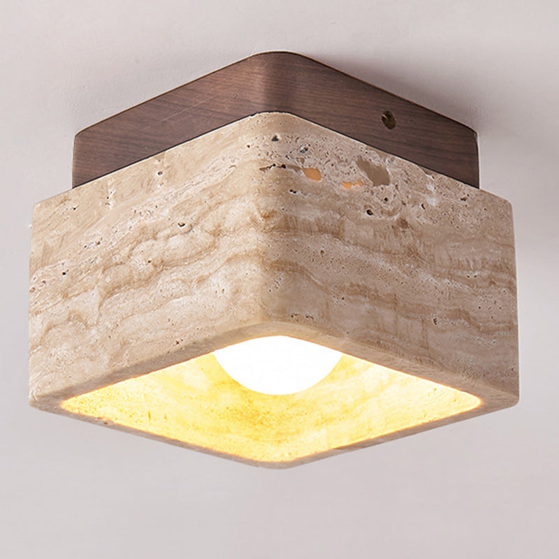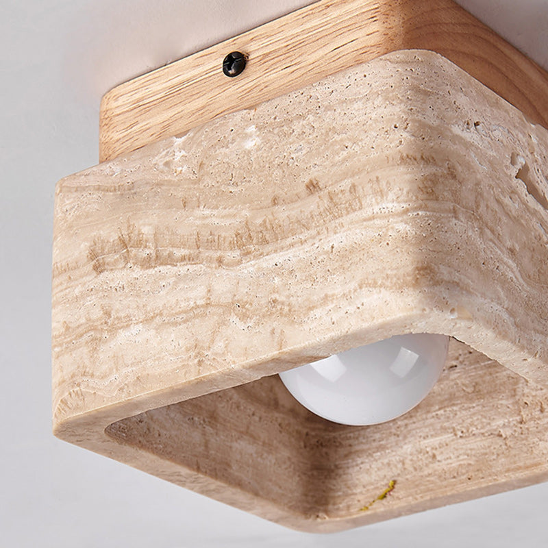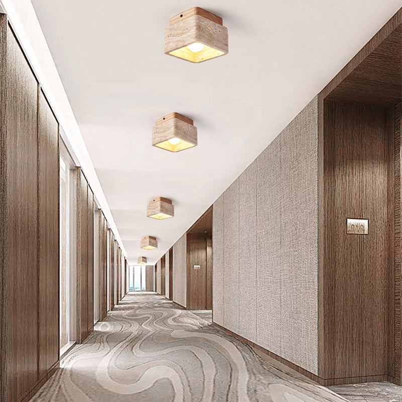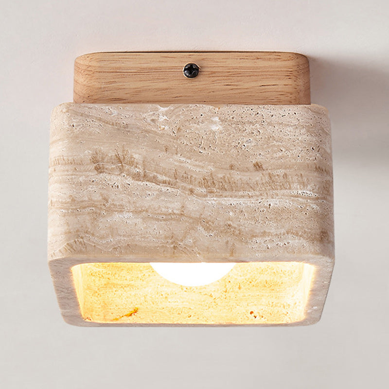 Traditional Japanese Square Wood Stone 1-Light Flush Mount Ceiling Light For Living Room