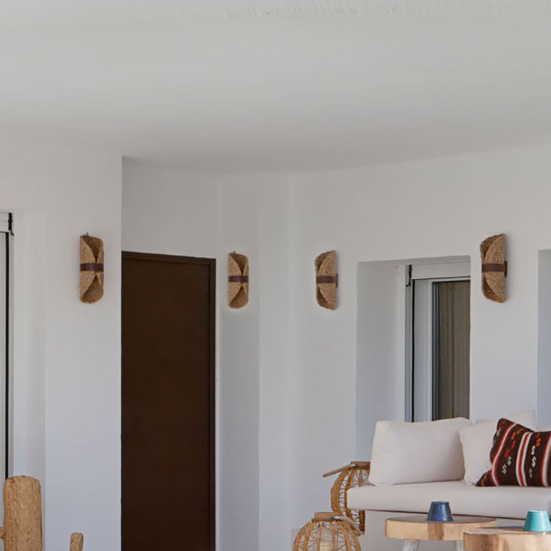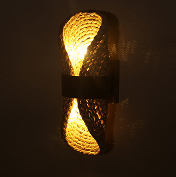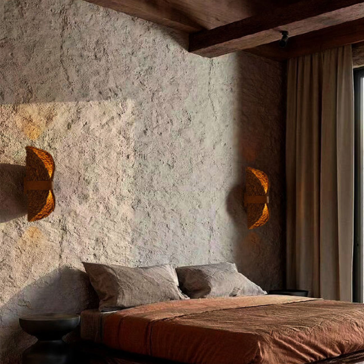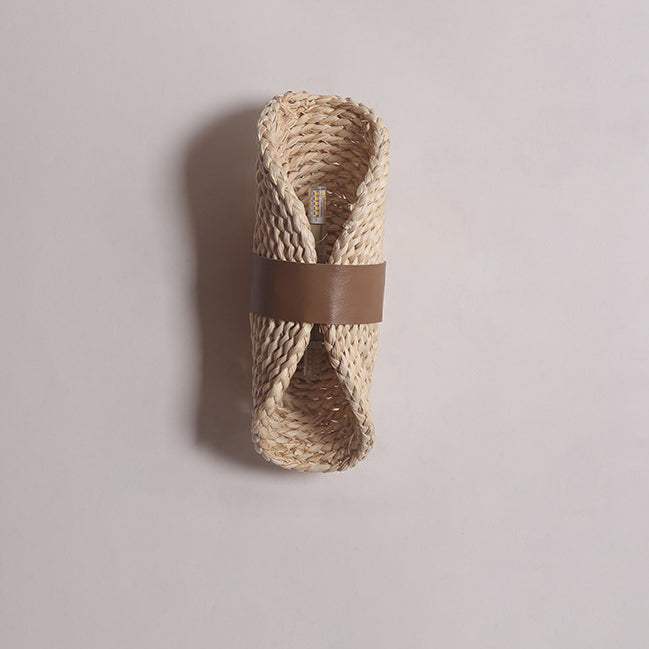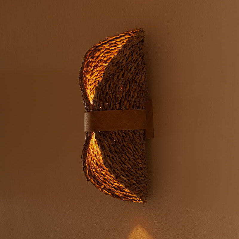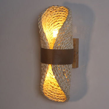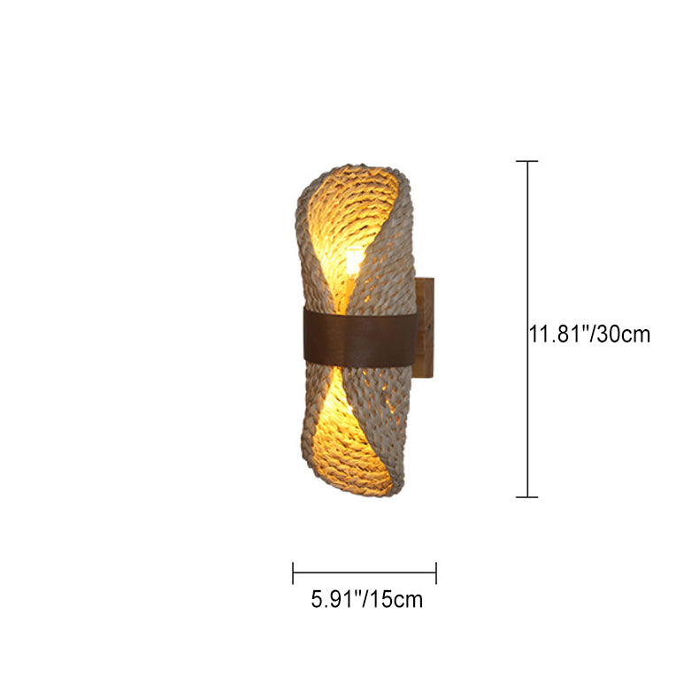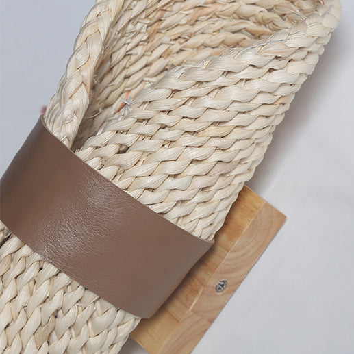 Traditional Japanese Straw Woven Cattail Leather Wrapping Round 1-Light Wall Sconce Lamp For Living Room