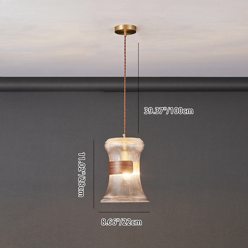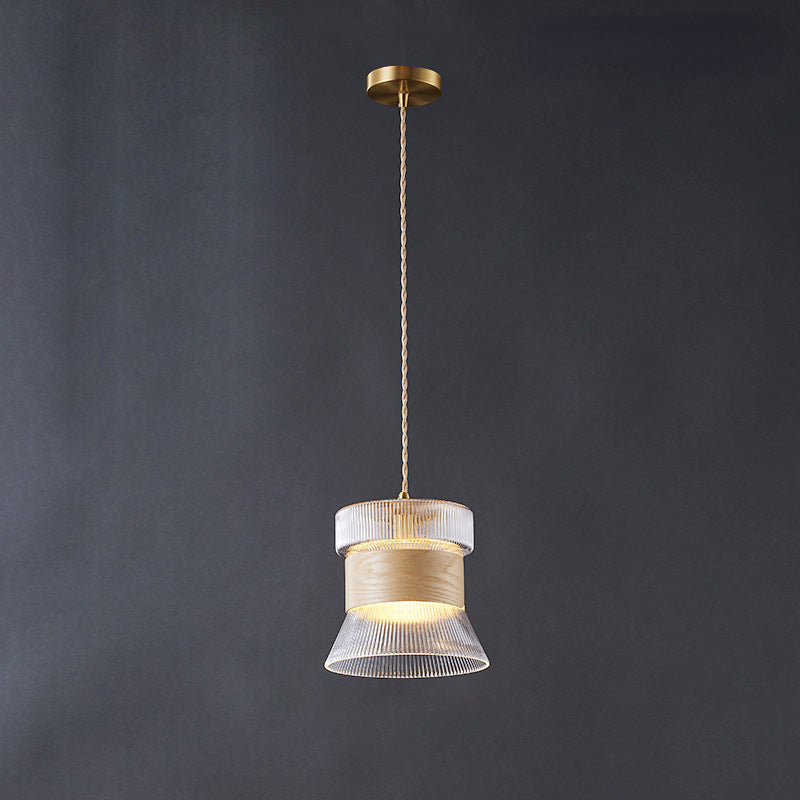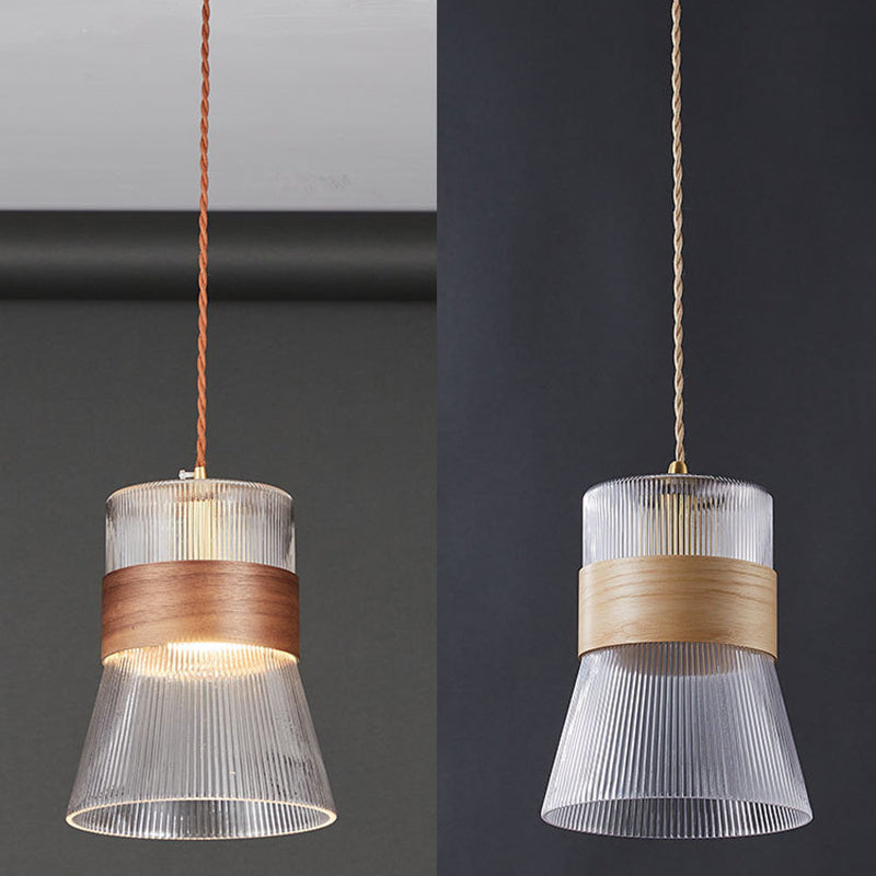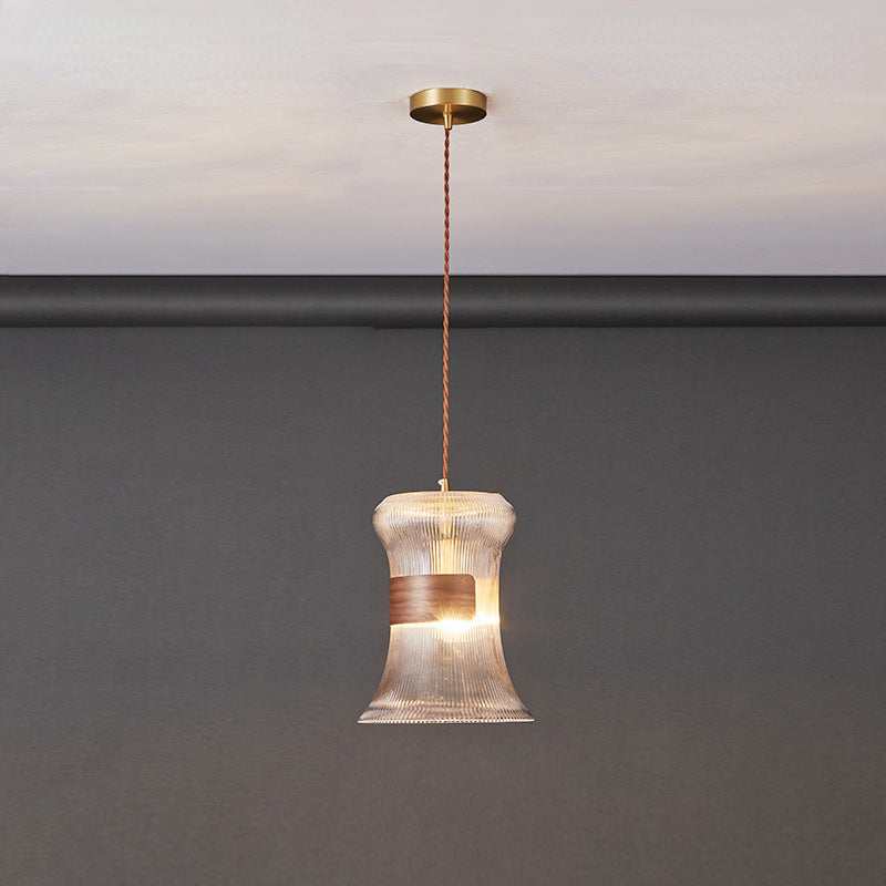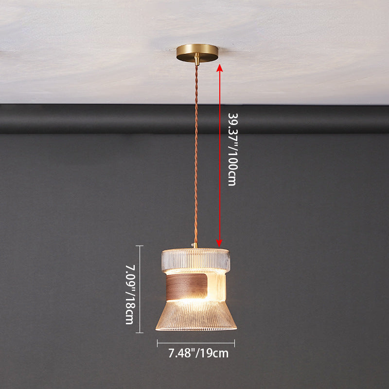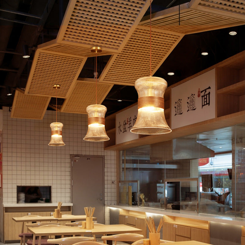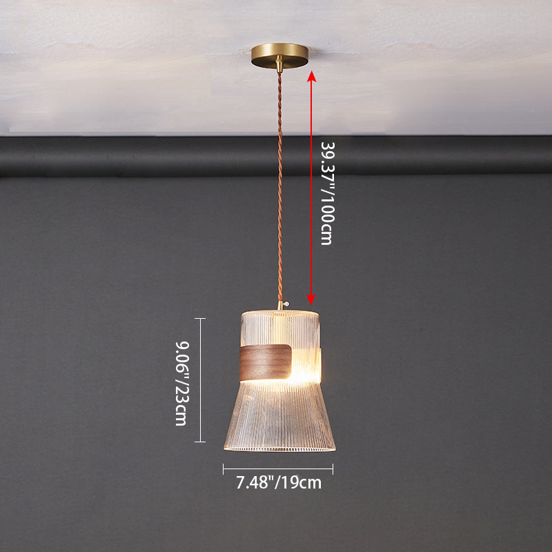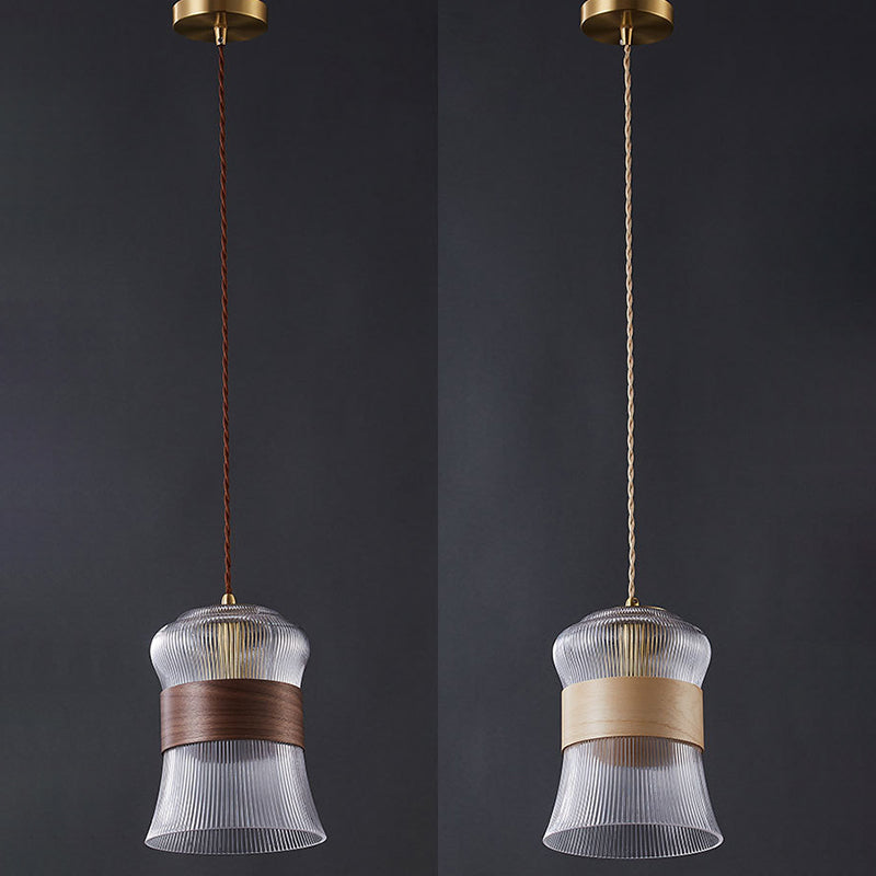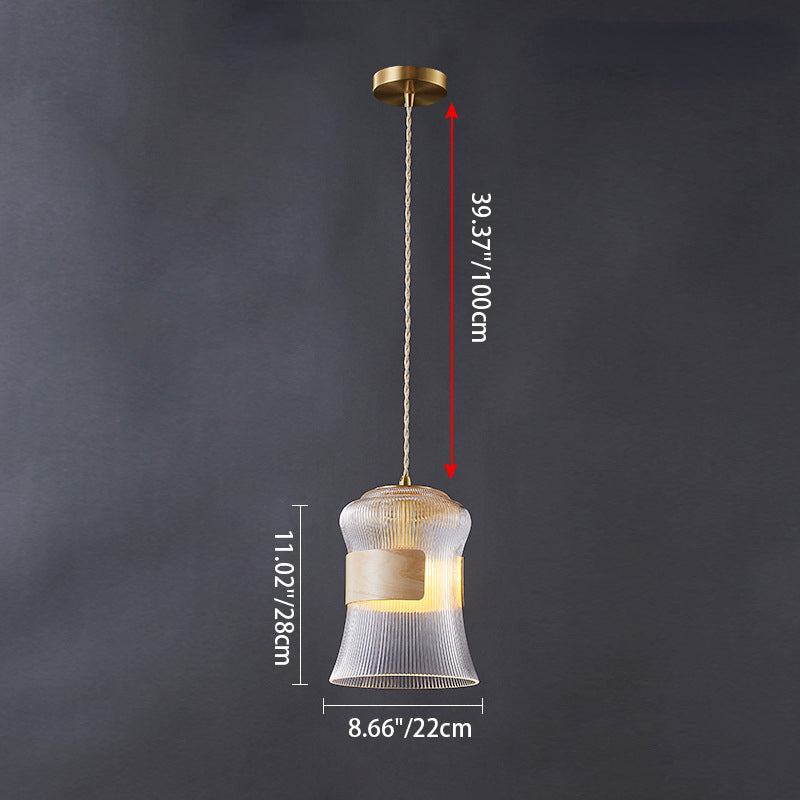 Traditional Japanese Transparent Ribbed Glass Shade Wood Copper 1 Light Pendant Light For Dining Room