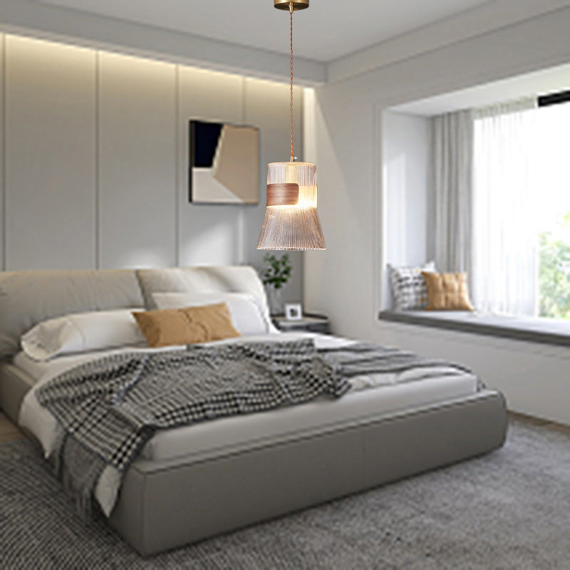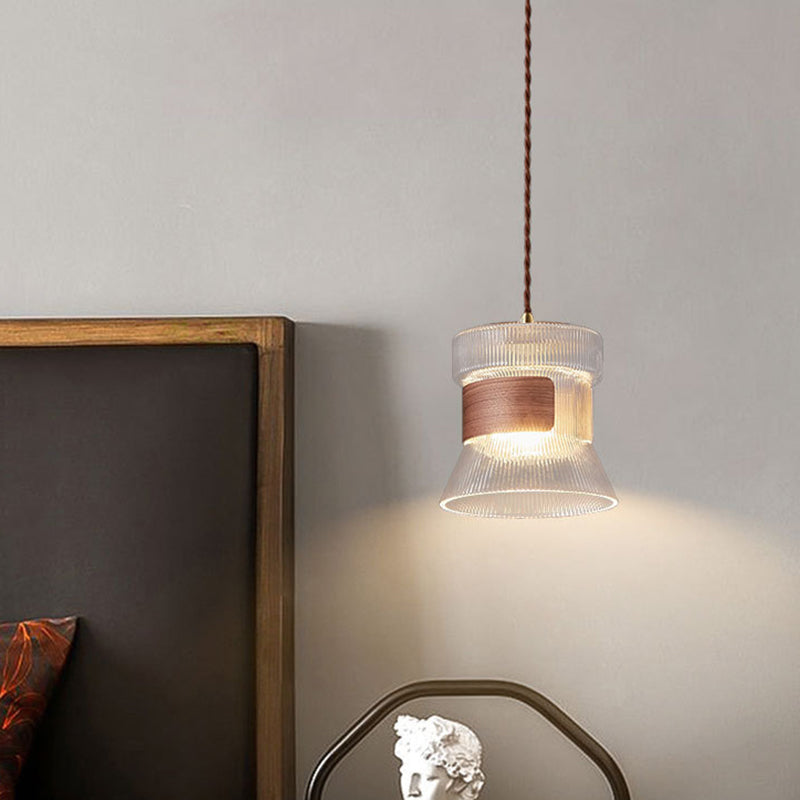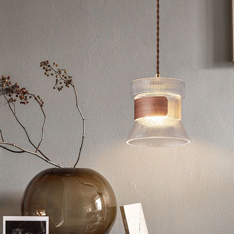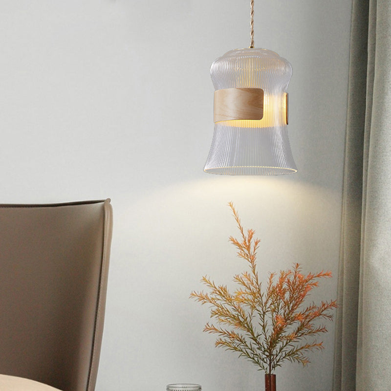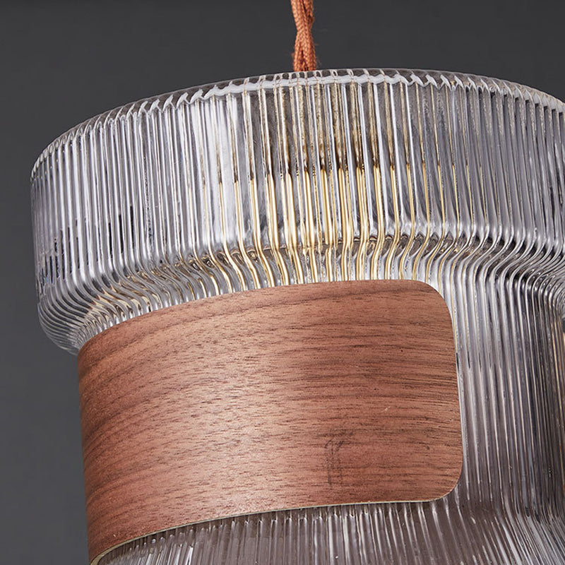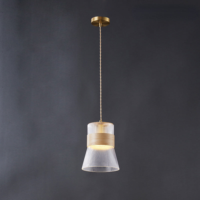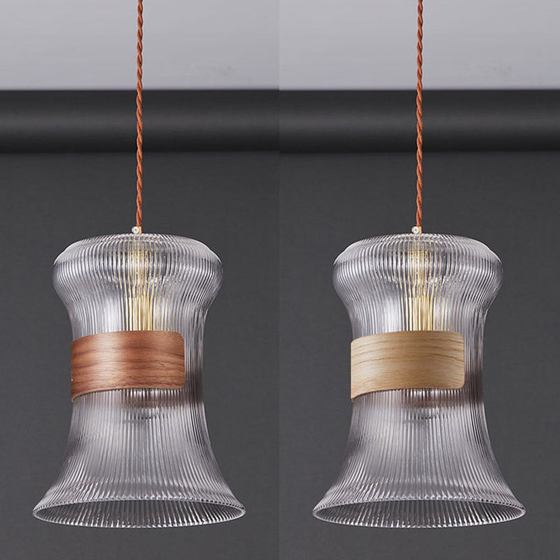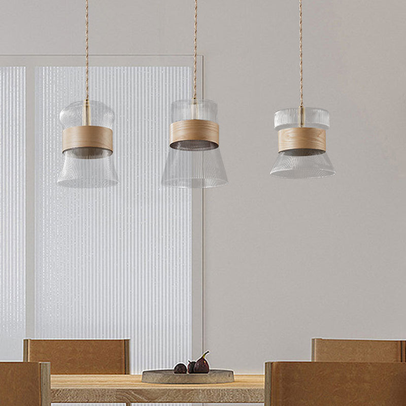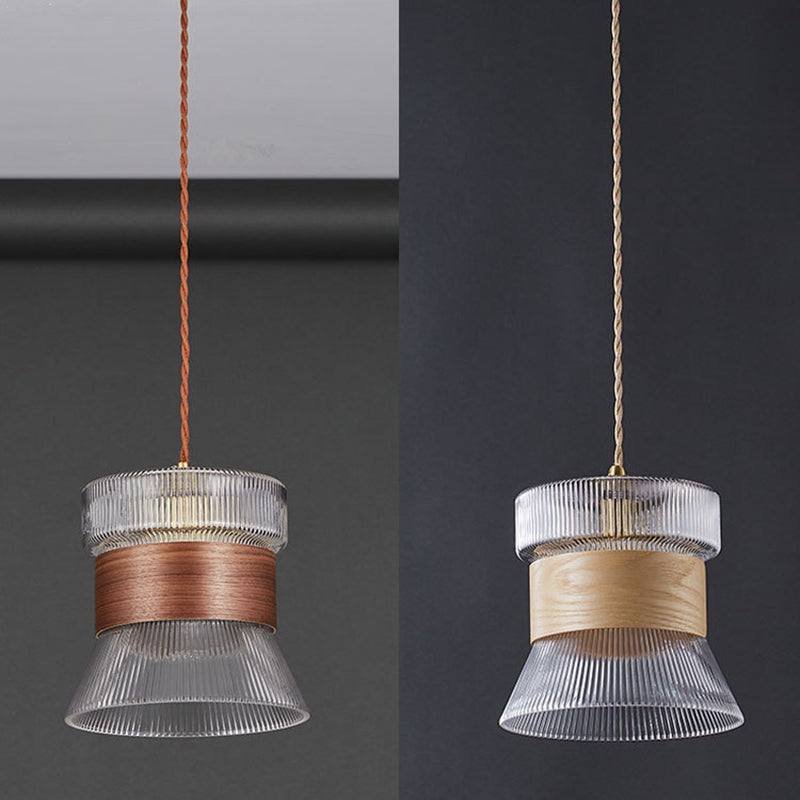 Traditional Japanese Transparent Ribbed Glass Shade Wood Copper 1 Light Pendant Light For Dining Room