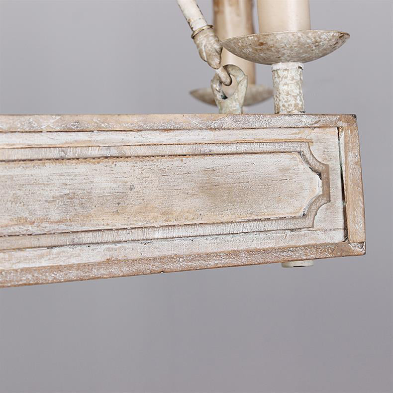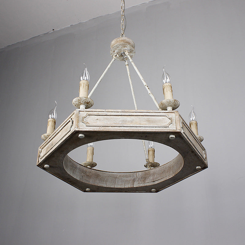 Traditional Rustic Distressed White Carving Wood Beam Hexagon Iron 6-Light Chandelier For Living Room