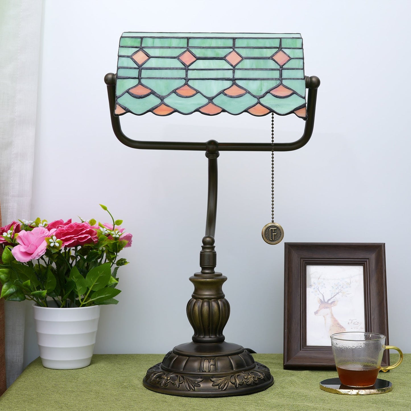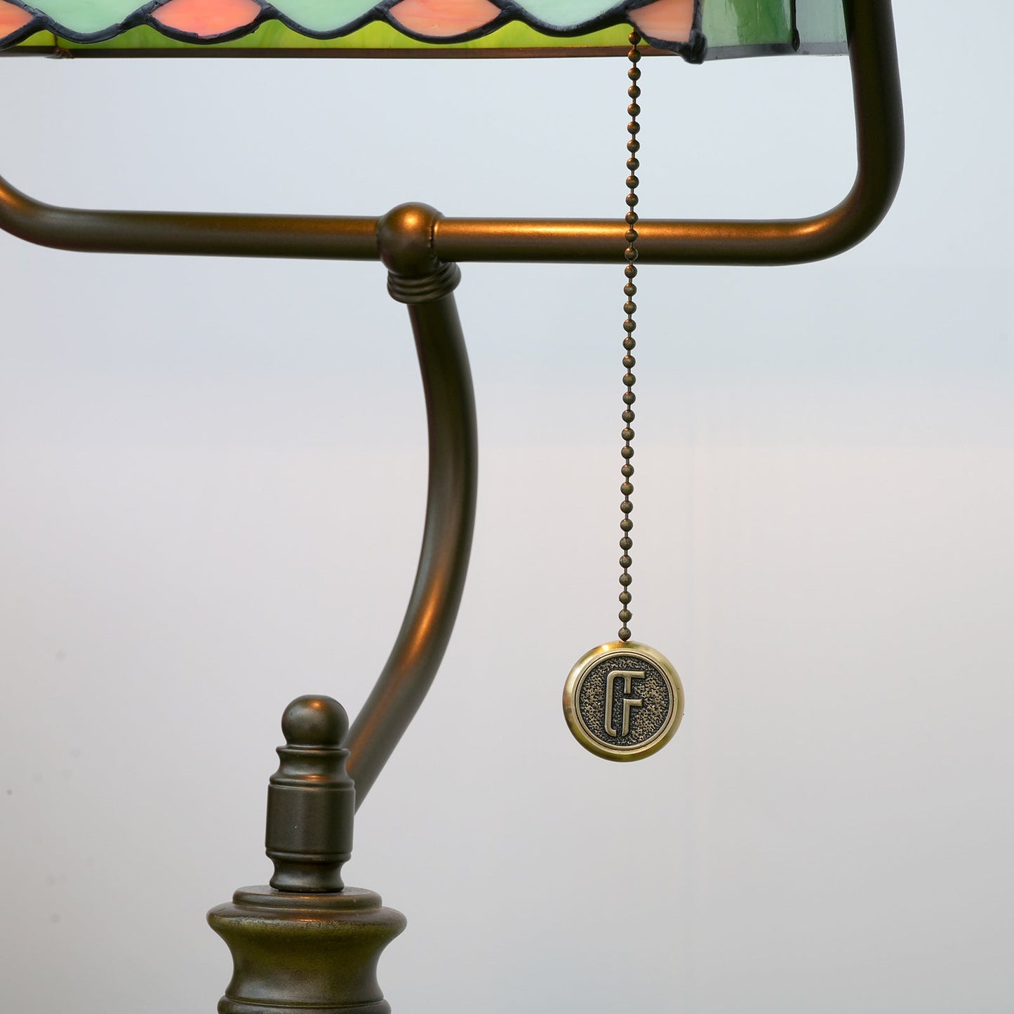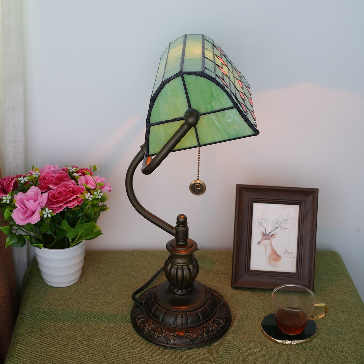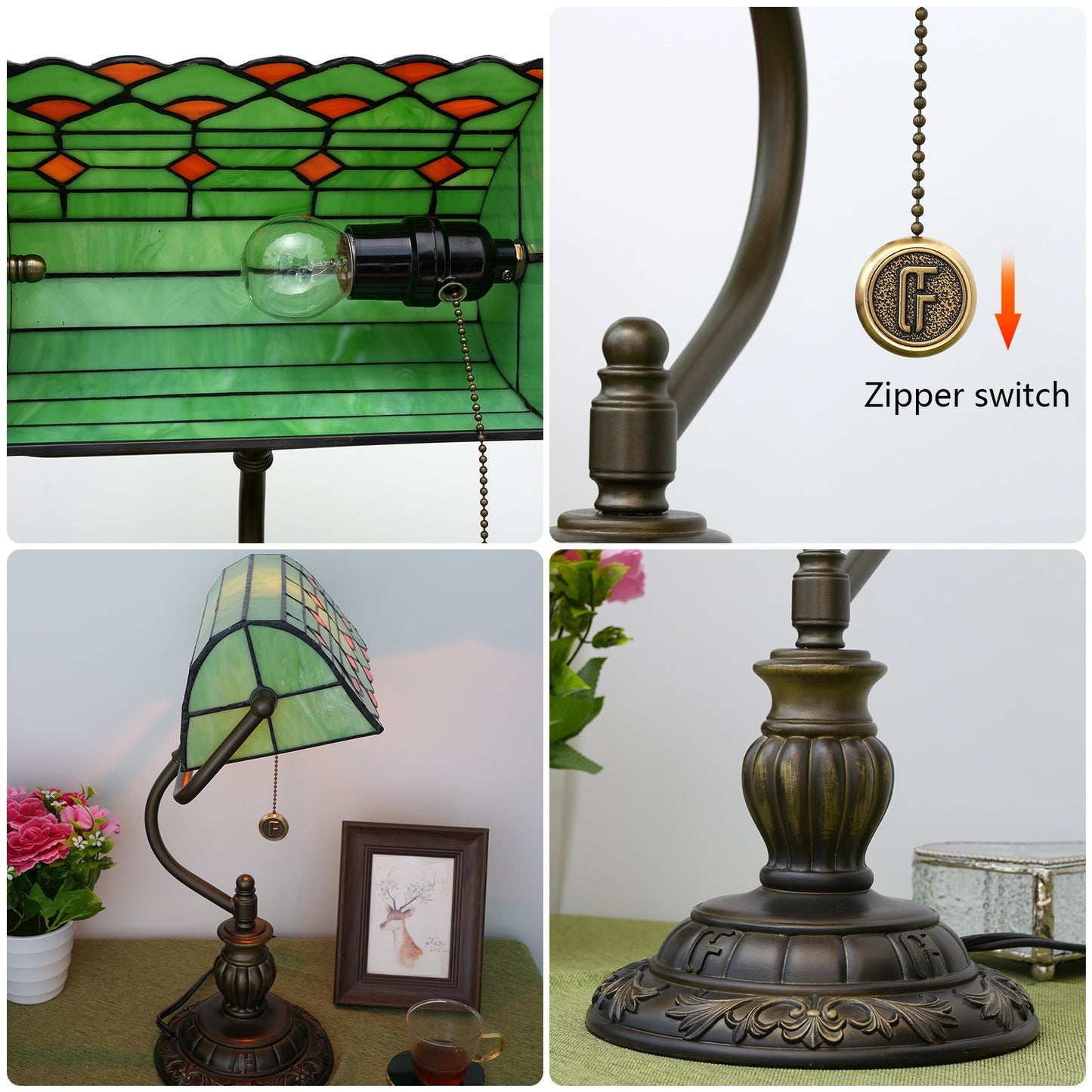 Traditional Tiffany Green Leaf Red Spot Trapezoidal Iron Resin Glass 1-Light Zipper Table Lamp For Bedside