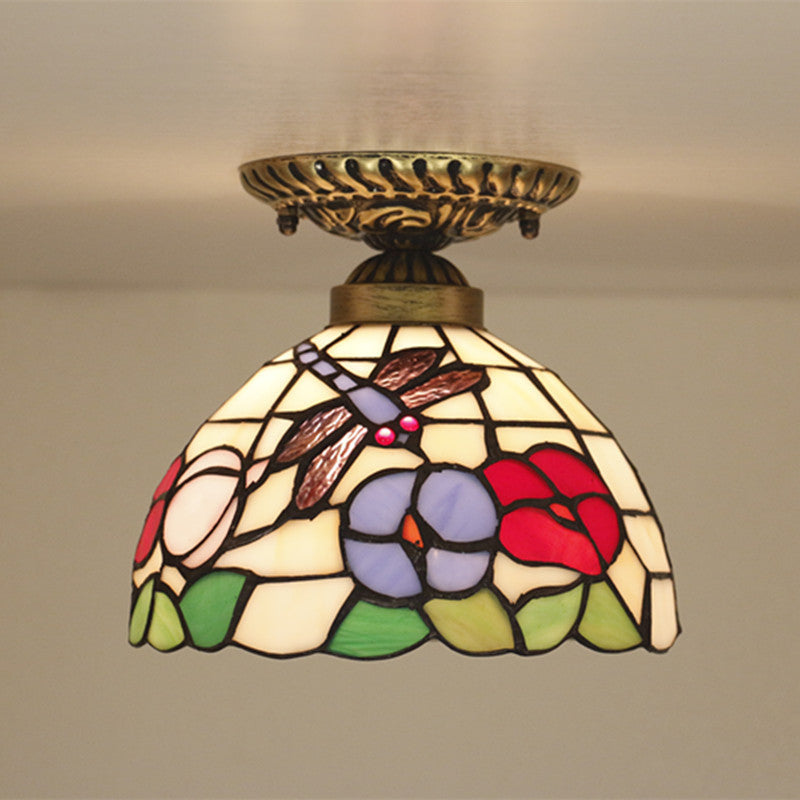 Traditional Tiffany Round Cone Flower Dragonfly Iron Stained Glass 1-Light Semi-Flush Mount Ceiling Light For Living Room