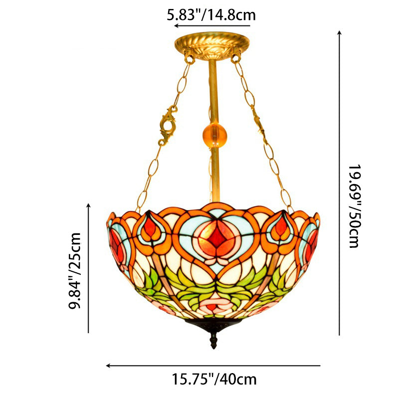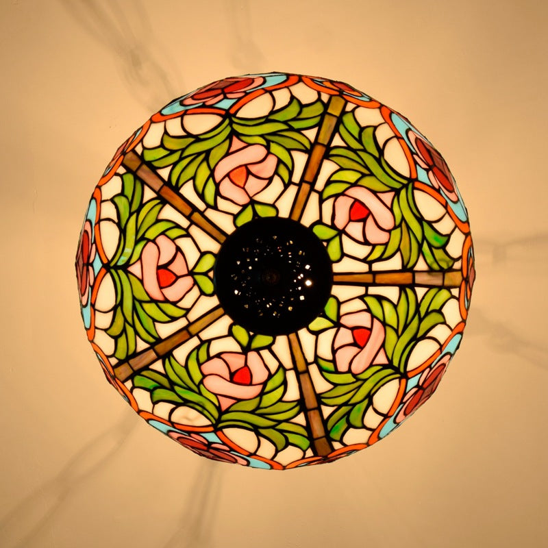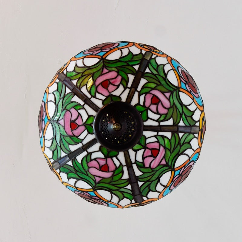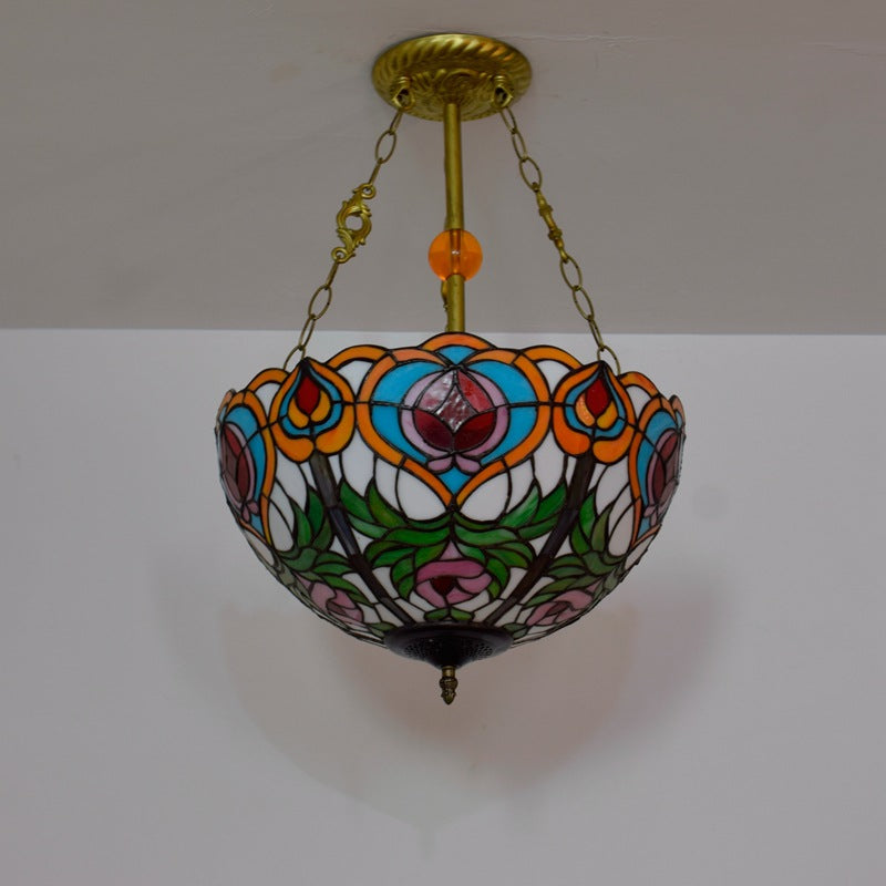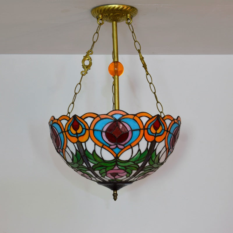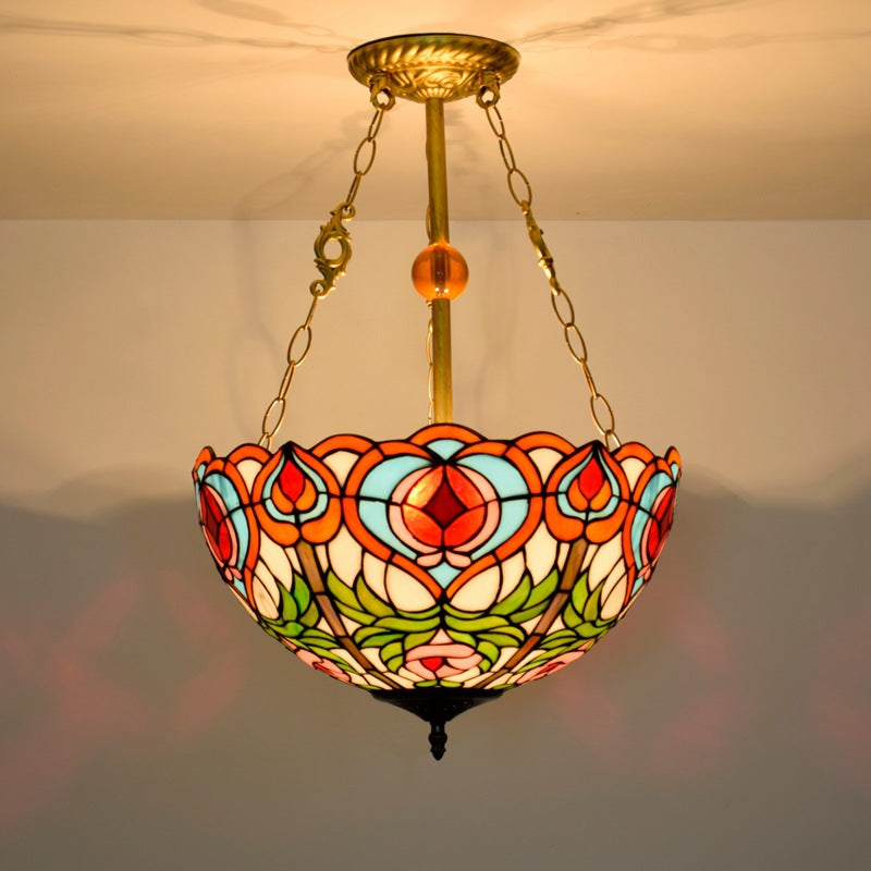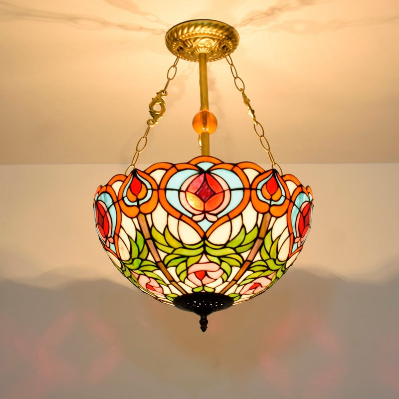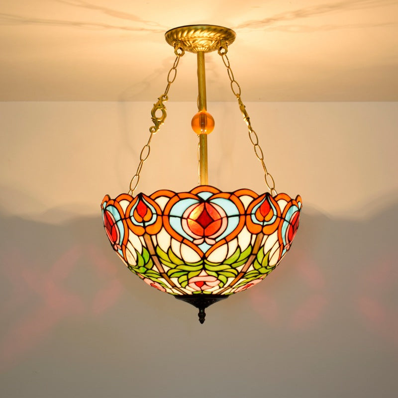 Traditional Tiffany Round Dome Peach Iron Stained Glass Shade 3-Light Chandelier For Living Room
