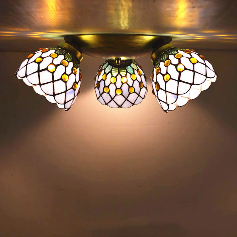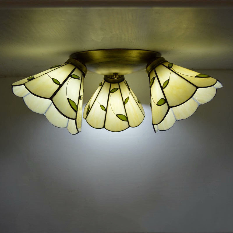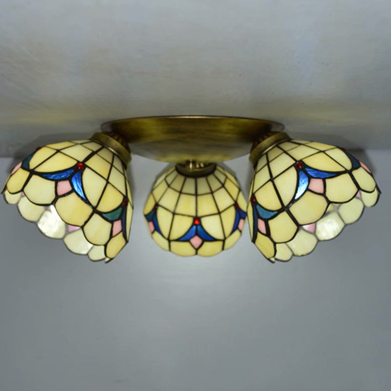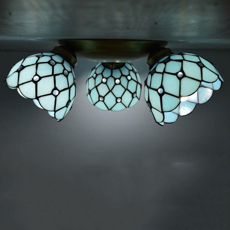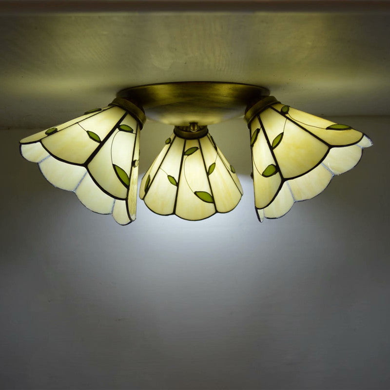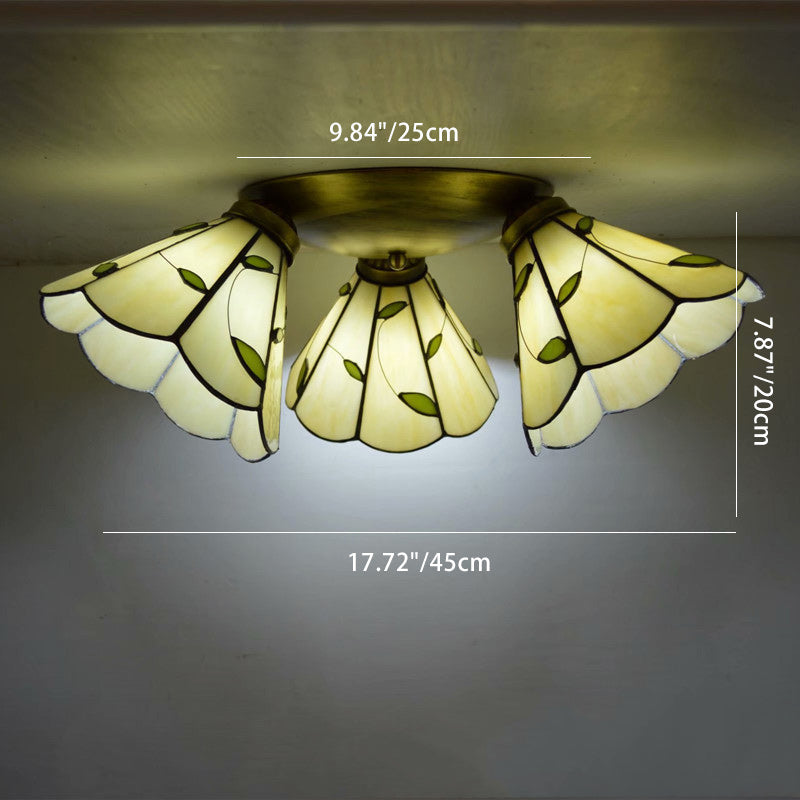 Traditional Tiffany Round Irregular Square Branch Glass Iron 3-Light Semi-Flush Mount Ceiling Light For Living Room