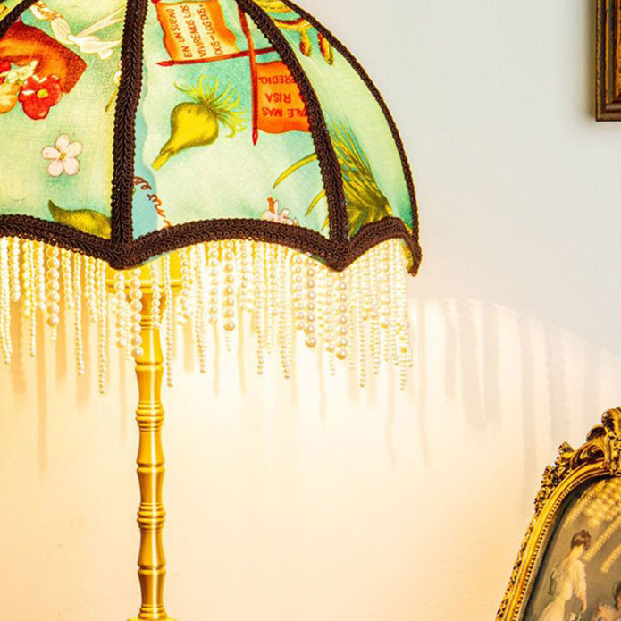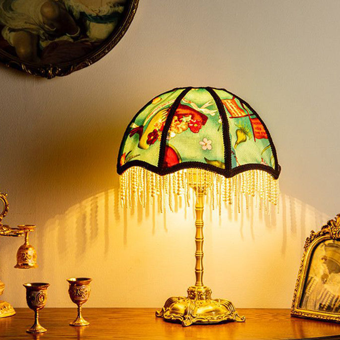 Traditional Vintage Dome Half Round Pearl Tassel Full Copper Fabric 1-Light Table Lamp For Bedroom