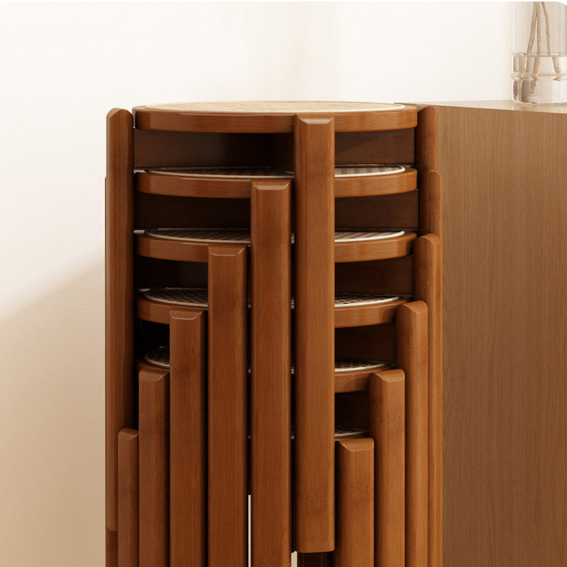 This tea-colored round and elongated dining stool combines rattan weaving with sturdy bamboo for a warm, vintage aesthetic. Designed for small spaces, its stackable form makes it perfect for compact dining rooms while adding rustic charm and functionality.