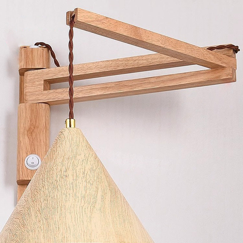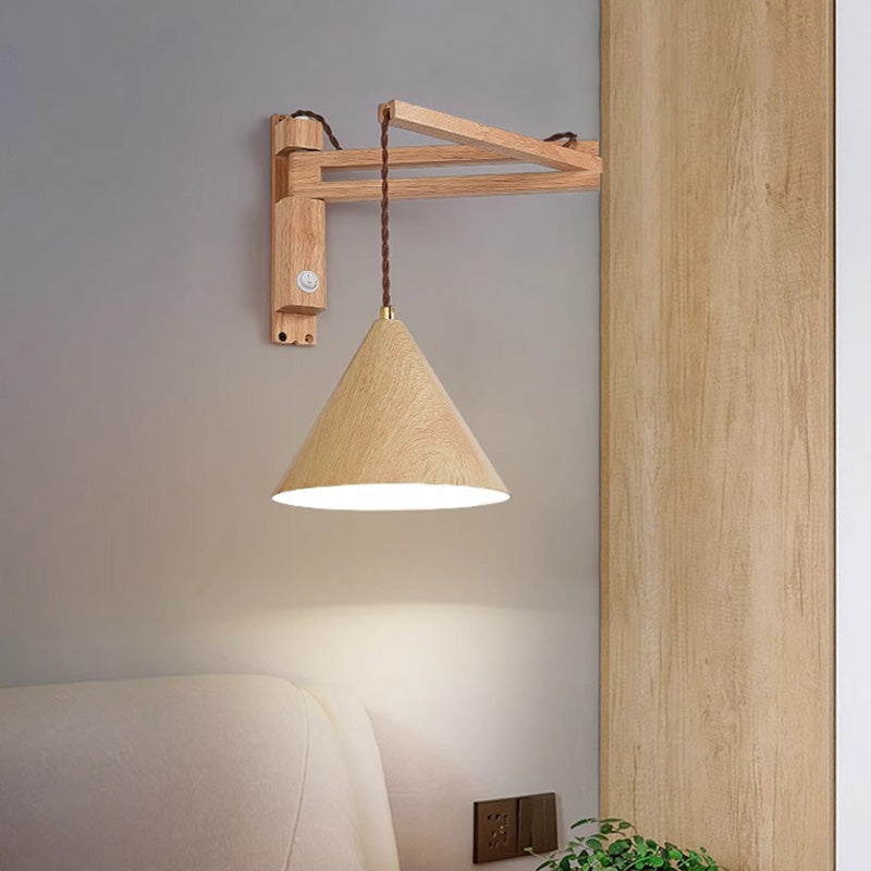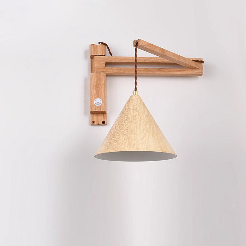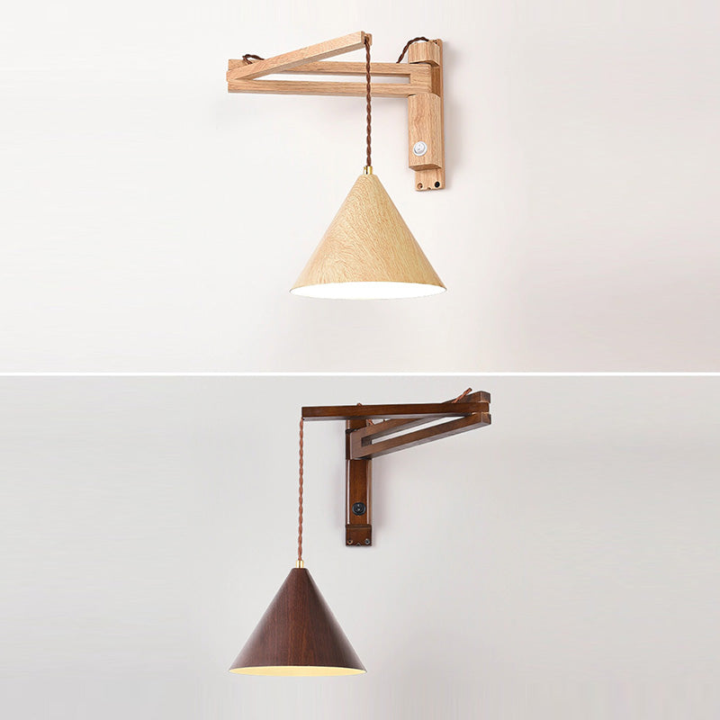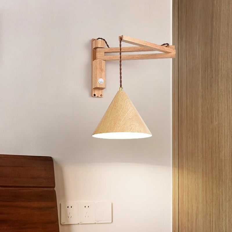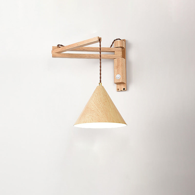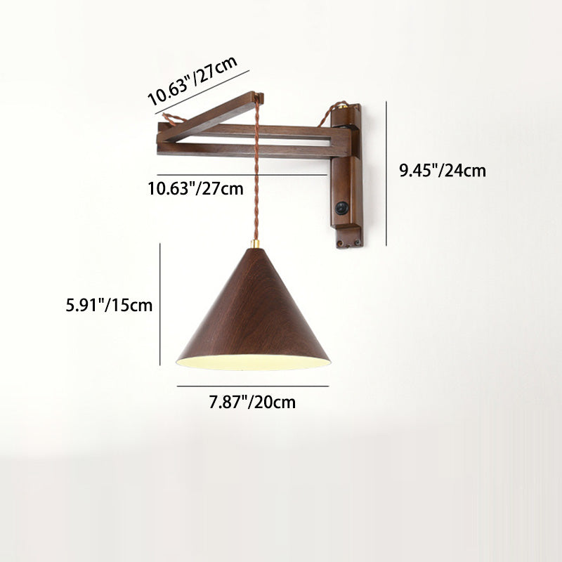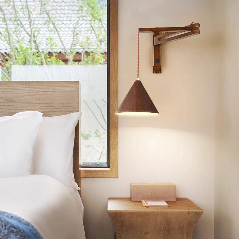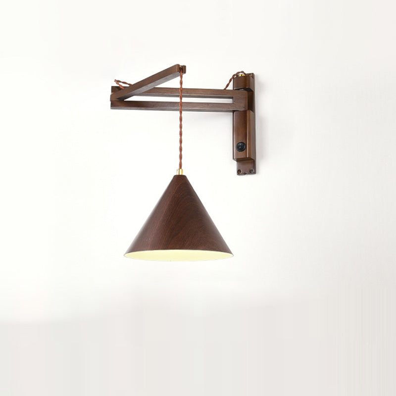 Traditional Vintage Swing Arm Cone Wood Iron 1-Light Wall Sconce Lamp For Bedroom