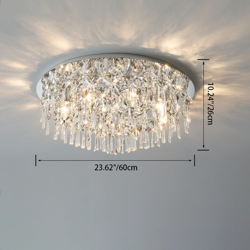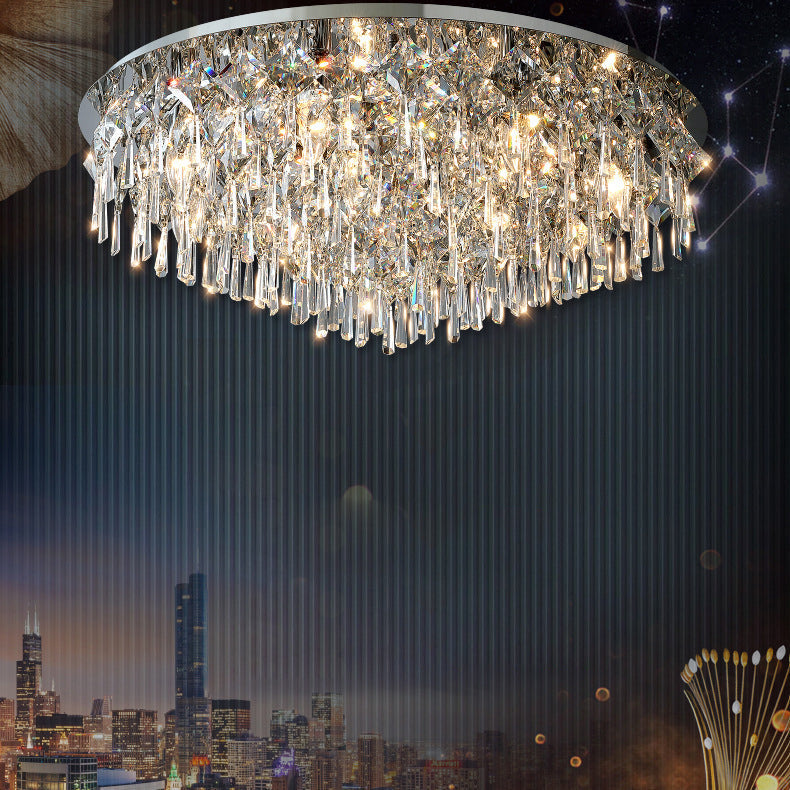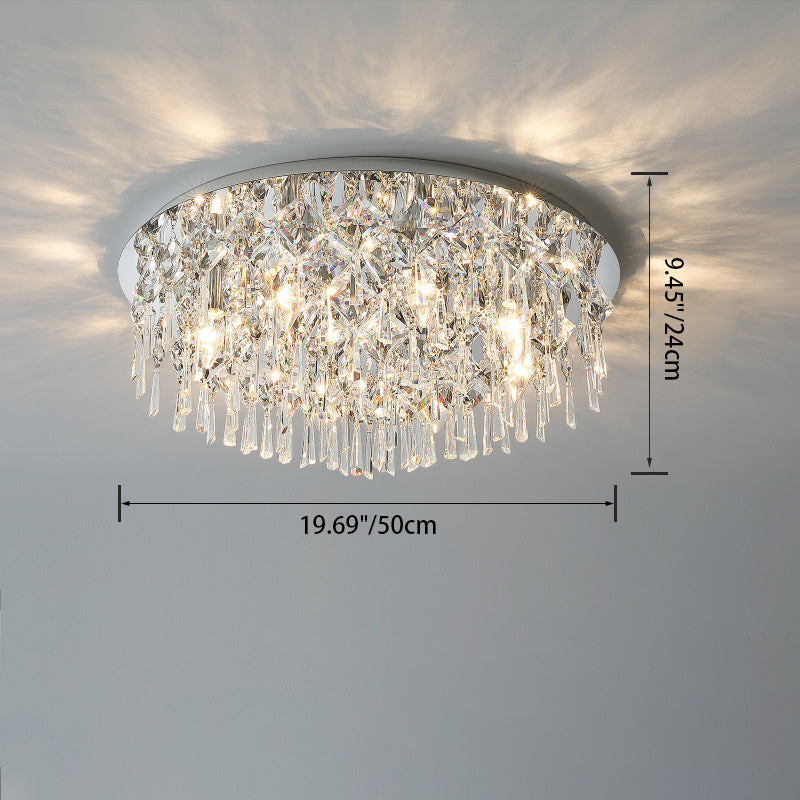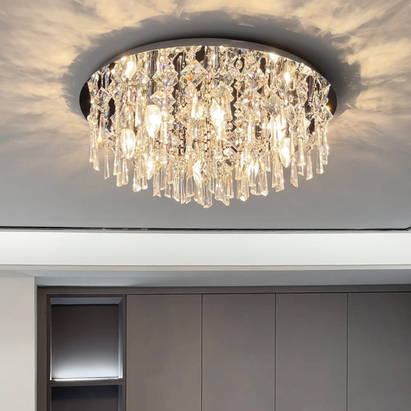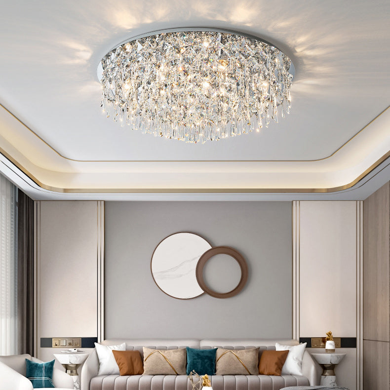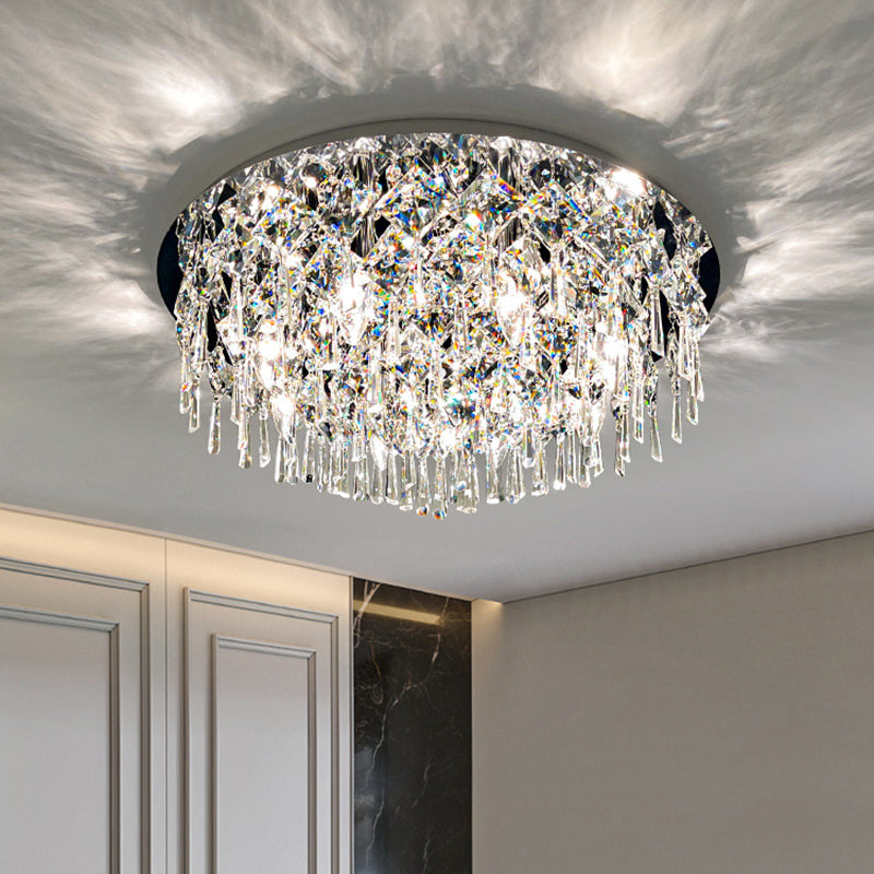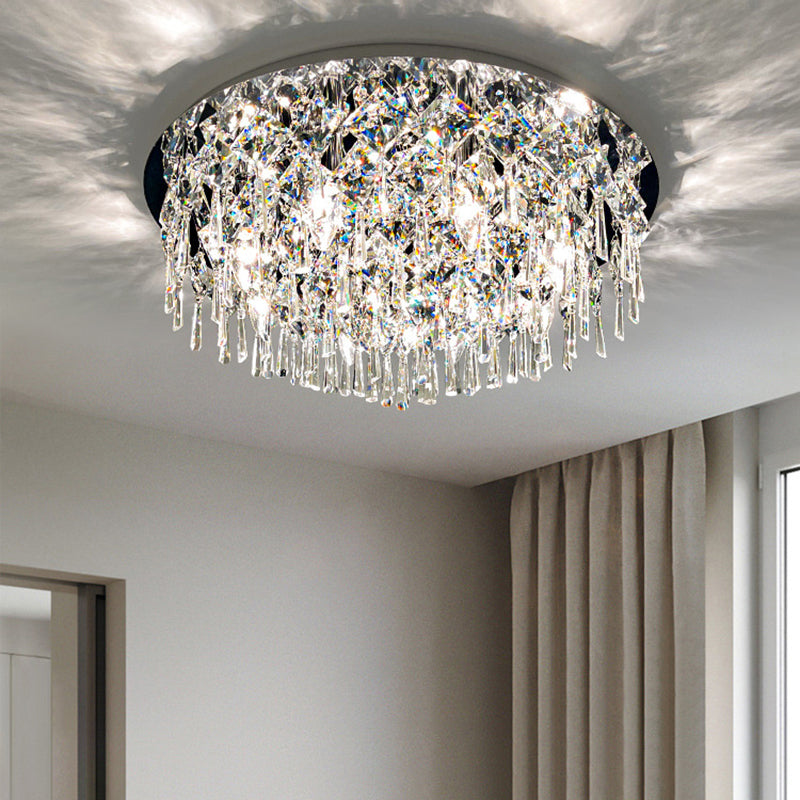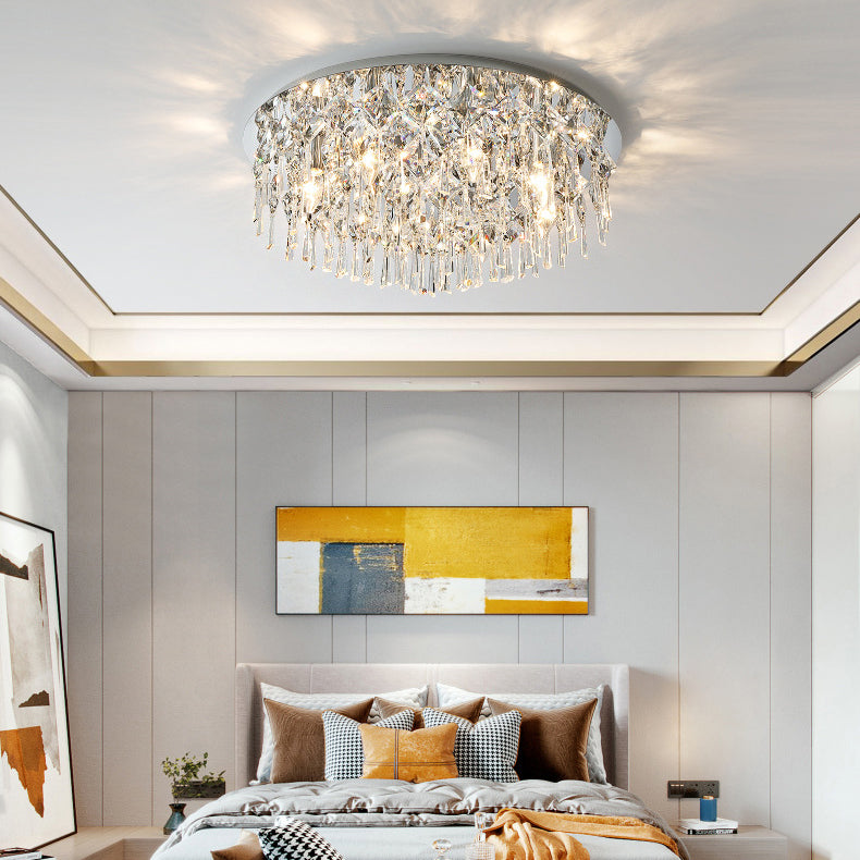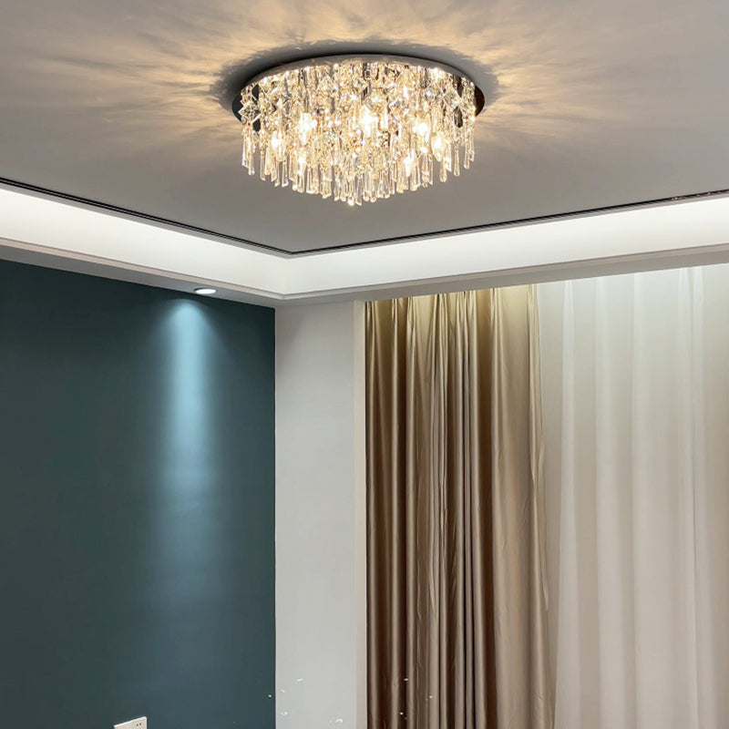 現代的な高級なまばゆいばかりのプリズマティッククリスタルストリングス、ステンレススチール製ラウンドフレーム、2/6/8灯フラッシュマウントシーリングライト、リビングルーム用
