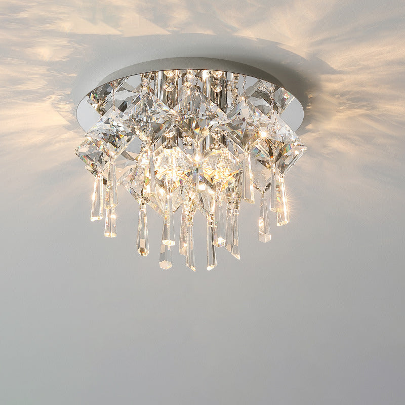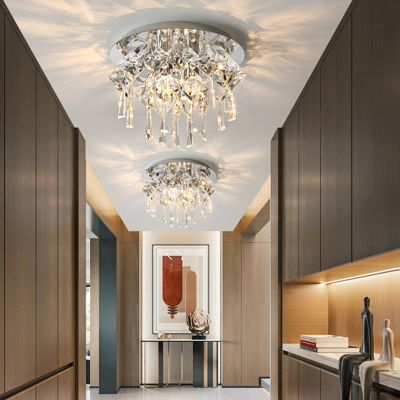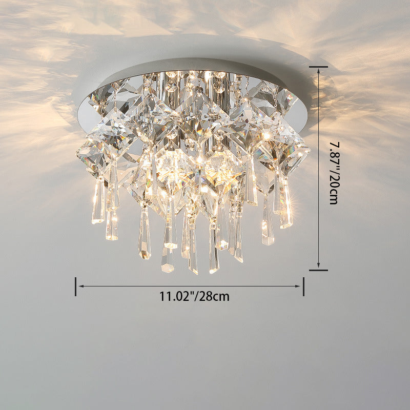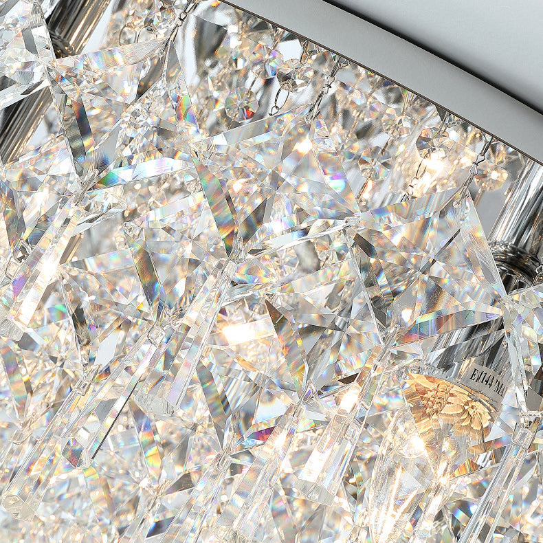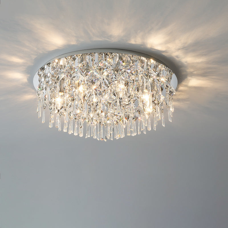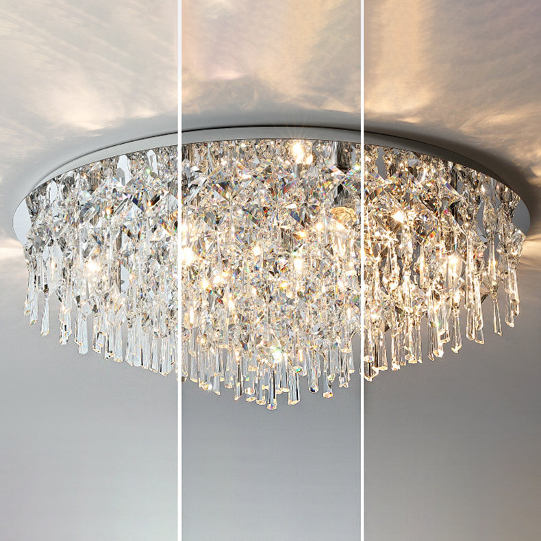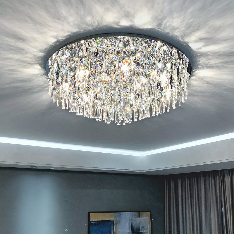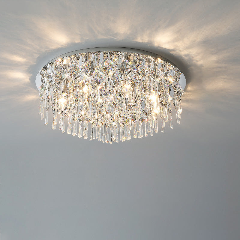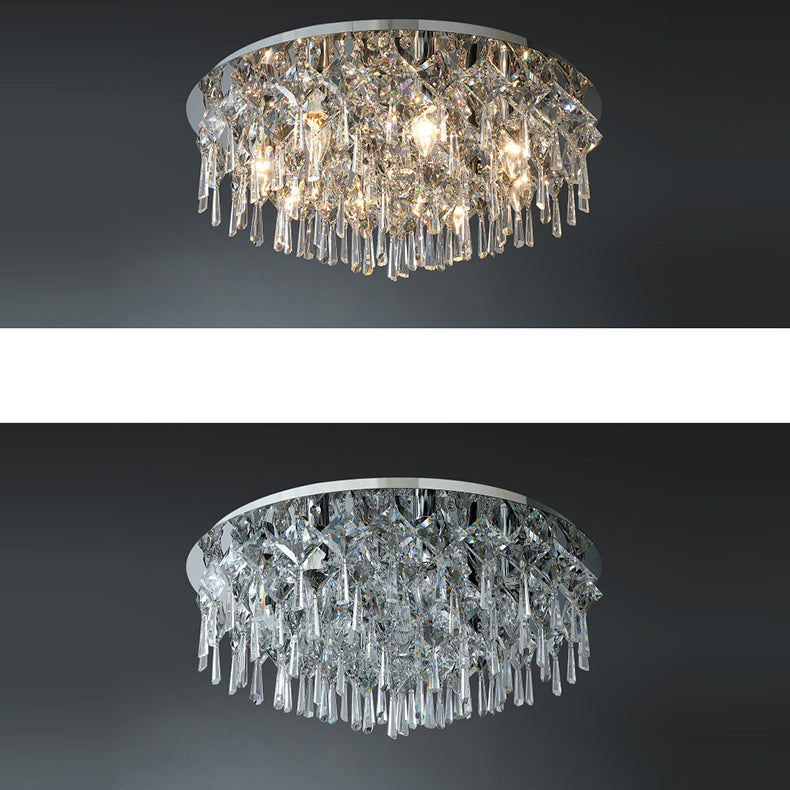 現代的な高級なまばゆいばかりのプリズマティッククリスタルストリングス、ステンレススチール製ラウンドフレーム、2/6/8灯フラッシュマウントシーリングライト、リビングルーム用