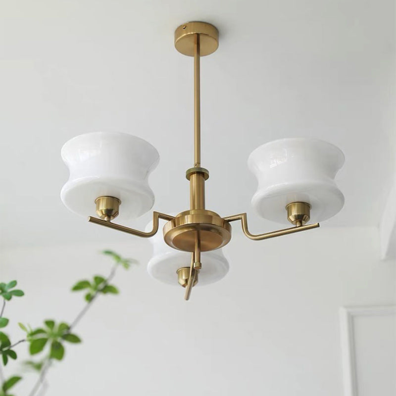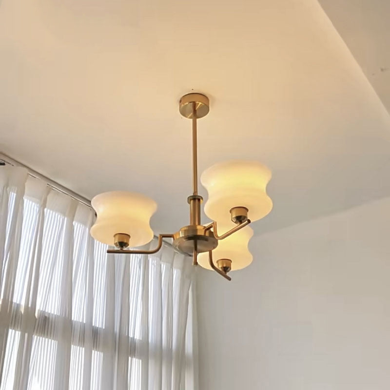 ミッドセンチュリーモダンデザインを体現したこの丸型シャンデリアは、透明度の高いガラスとクロームまたはゴールドのメタルアクセント、そして乳白色と白のランプシェードが特徴です。寝室やリビングルームに最適で、ヴィンテージ感漂うスタイリッシュな輝きを放ちます。