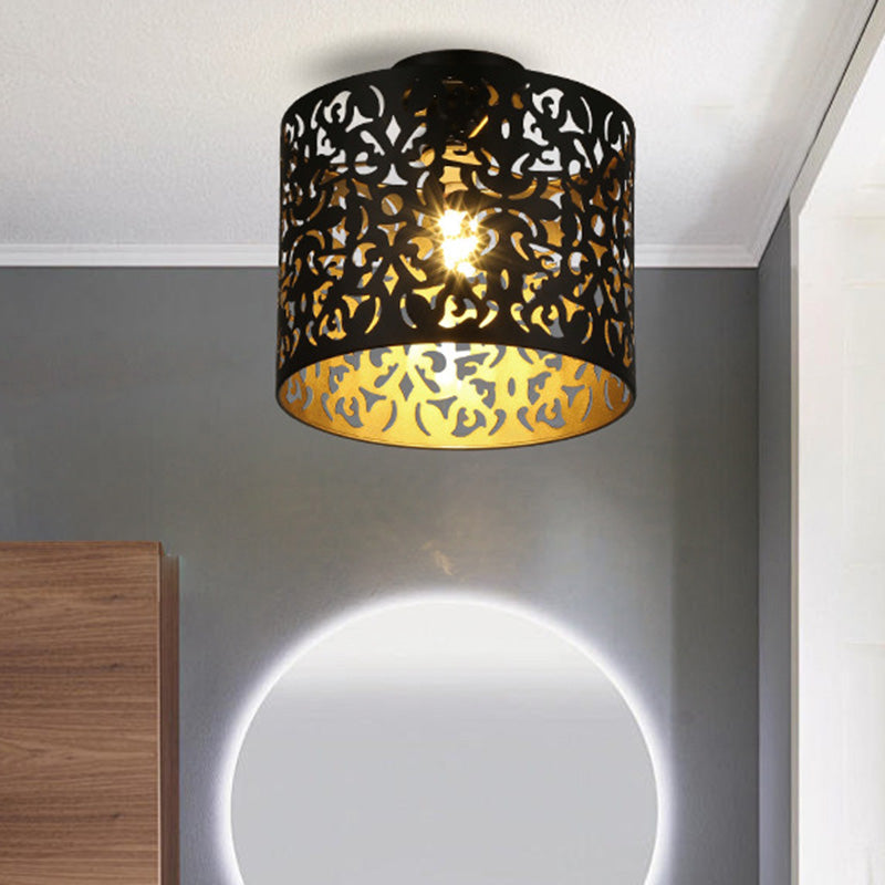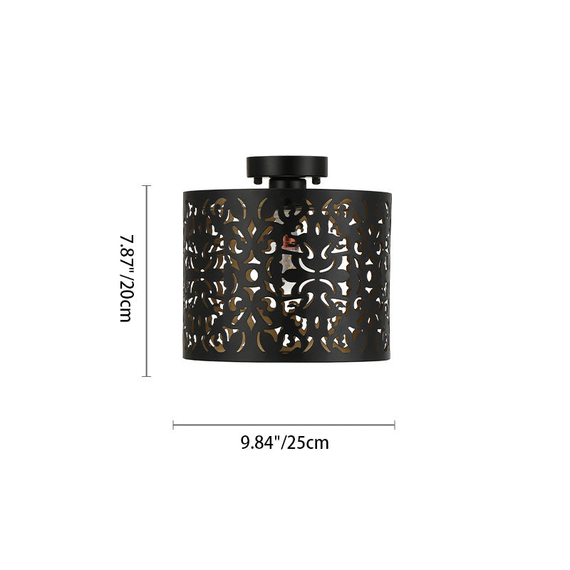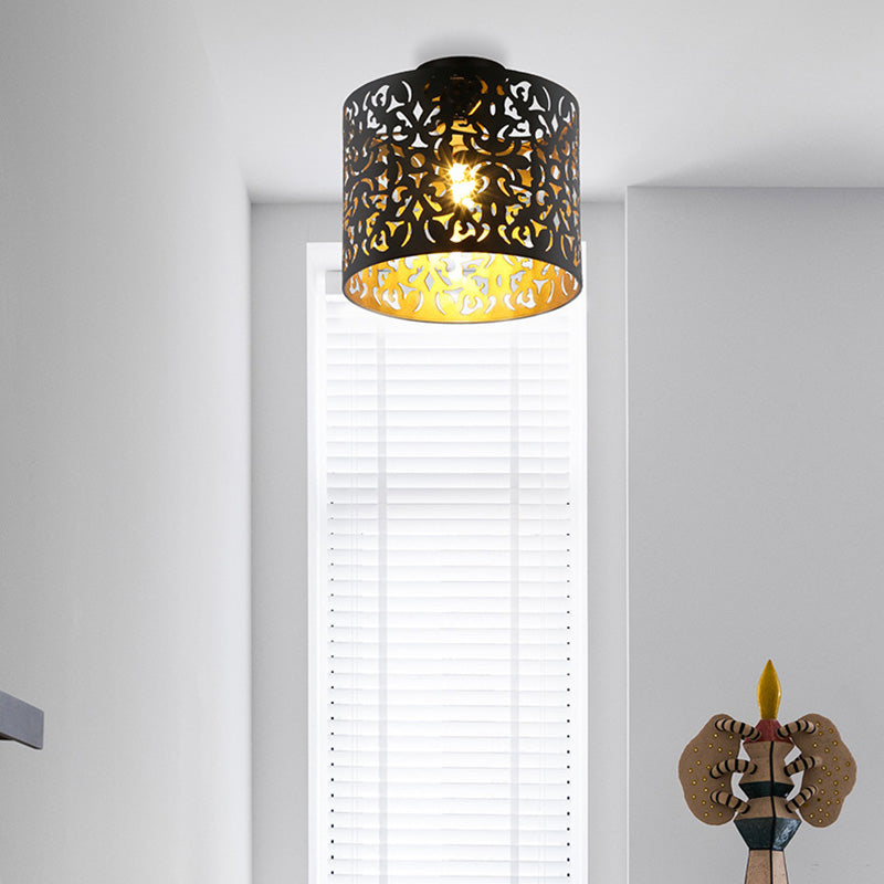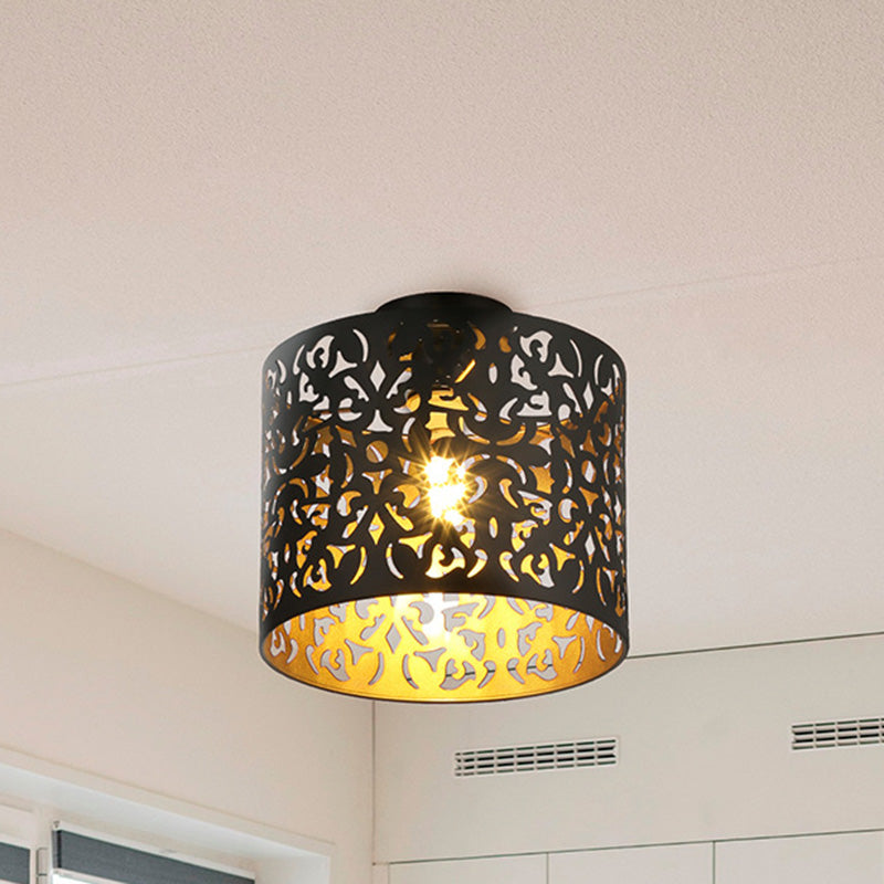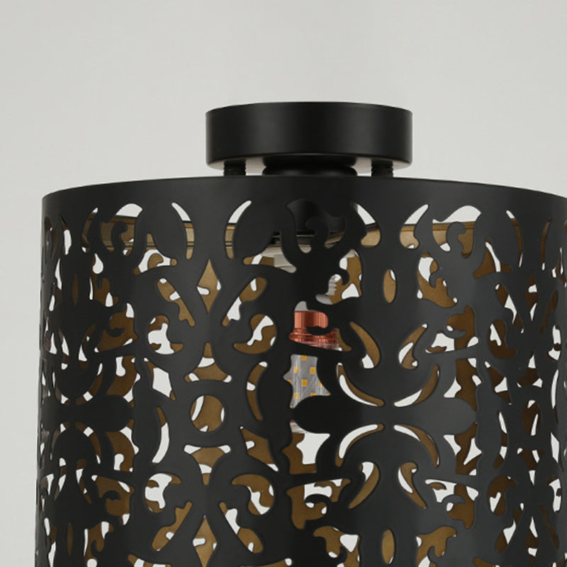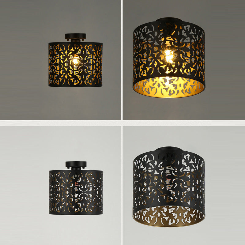 モダンでミニマリストなラウンドシリンダー型中空彫刻アイアン1灯セミフラッシュマウントシーリングライト(リビングルーム用)