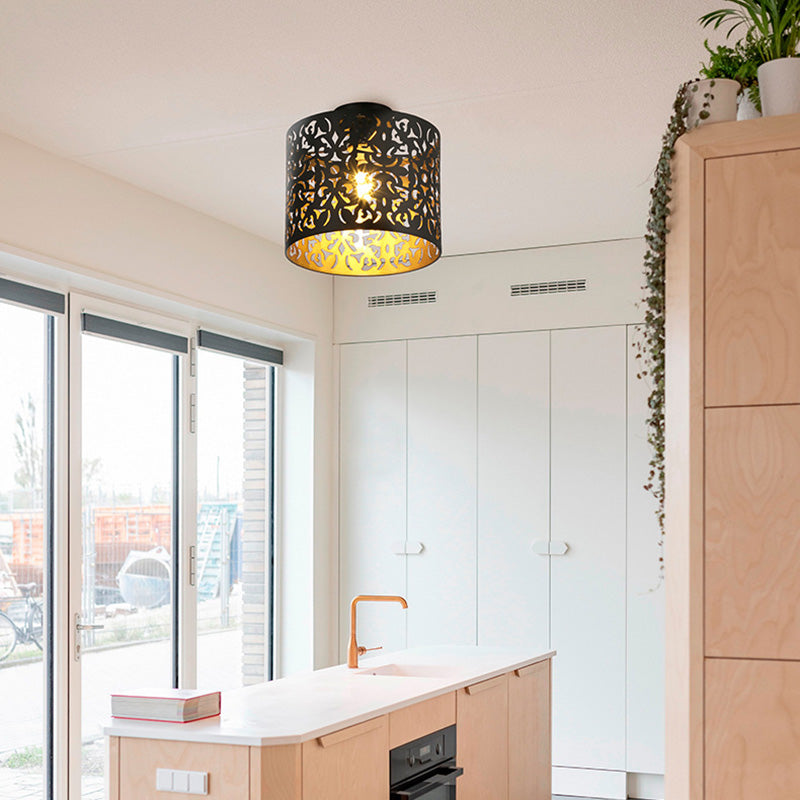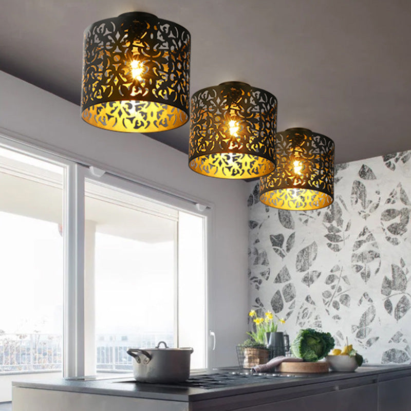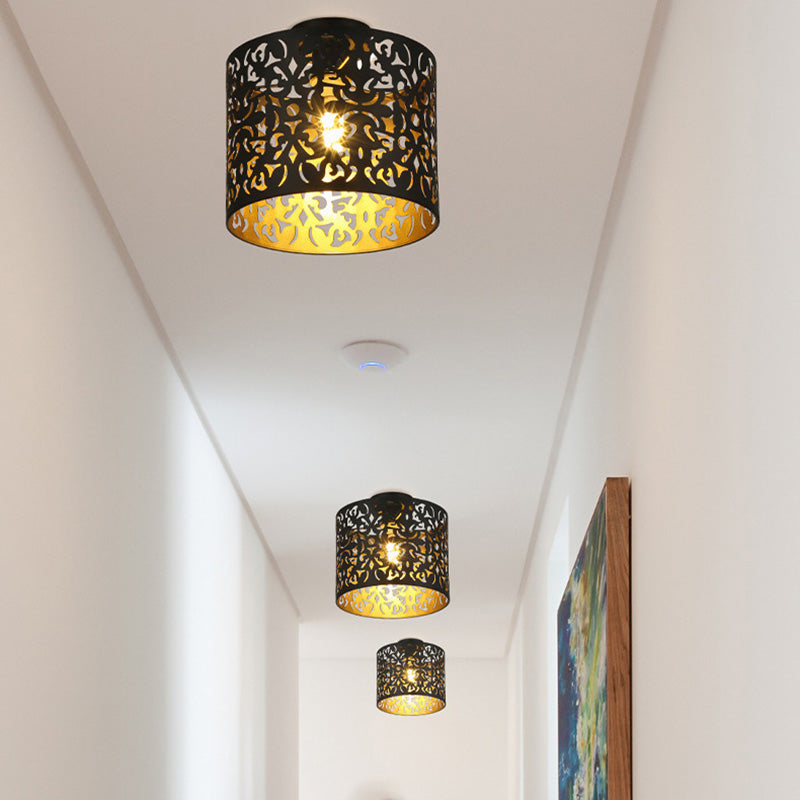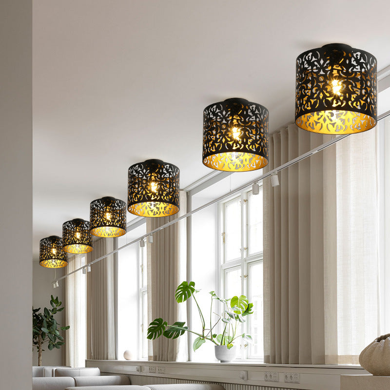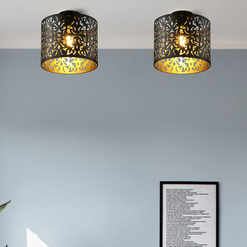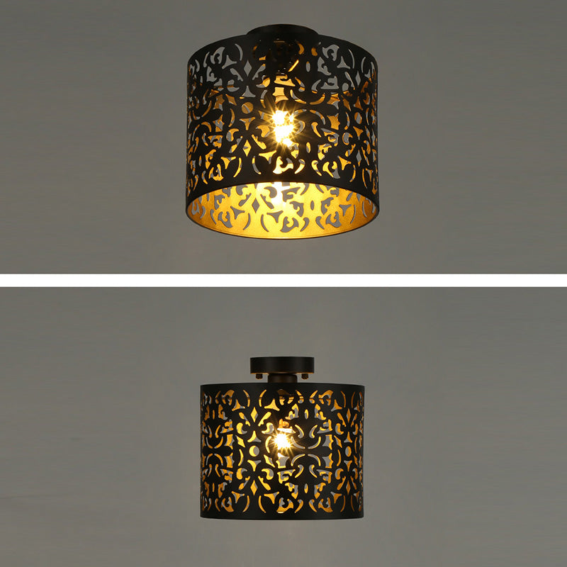 モダンでミニマリストなラウンドシリンダー型中空彫刻アイアン1灯セミフラッシュマウントシーリングライト(リビングルーム用)