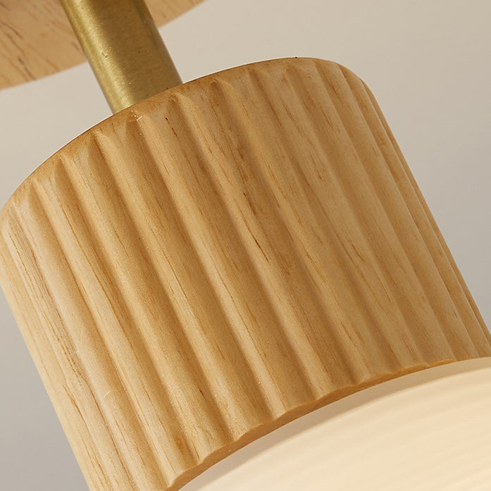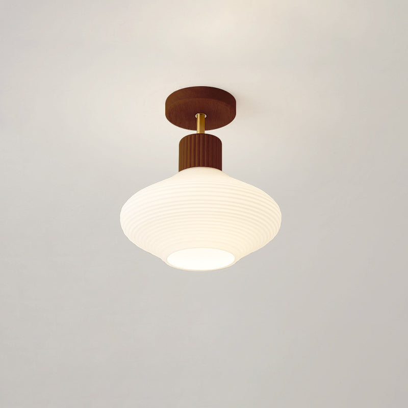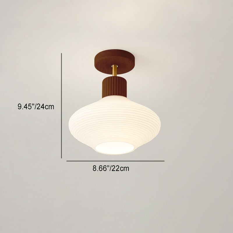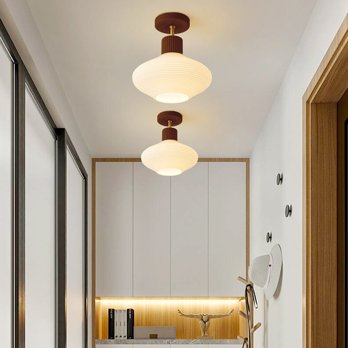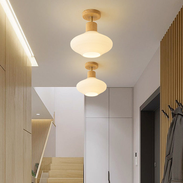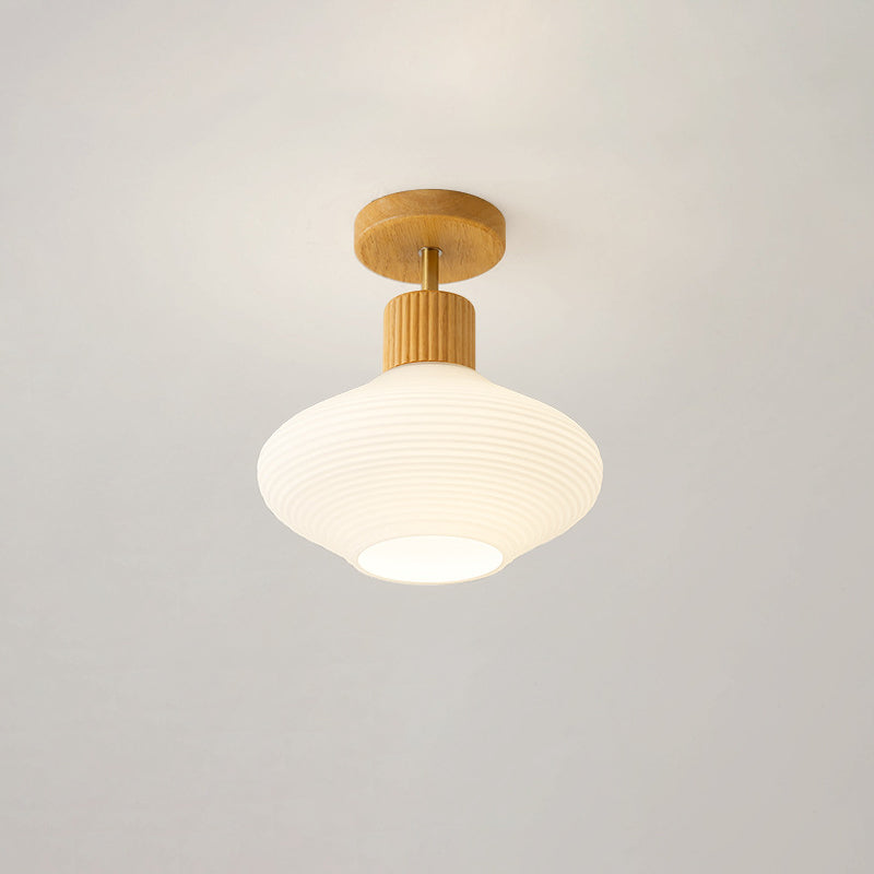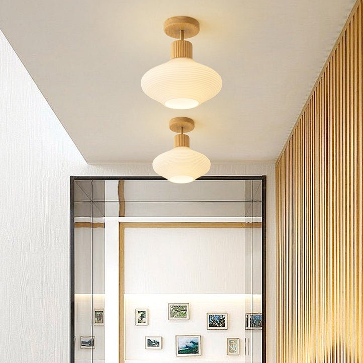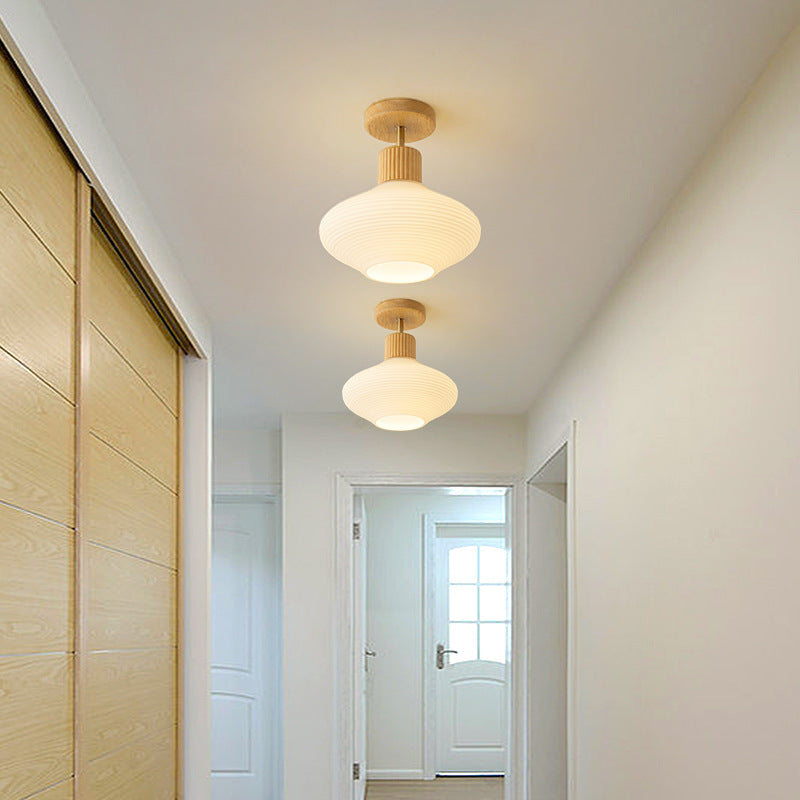 モダンミニマリストラウンドオーバルストライプガラスシェード木製フレーム1ライトセミフラッシュマウント廊下用シーリングライト