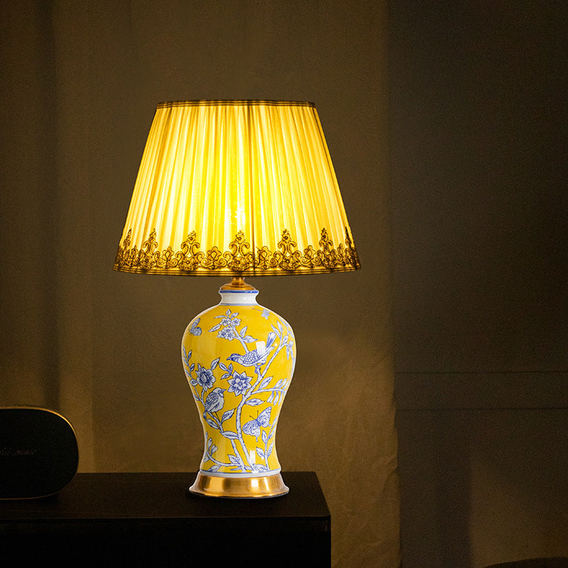 Traditional Chinese Frustum Cone Ceramic Metal Fabric 1-Light Table Lamp For Bedroom