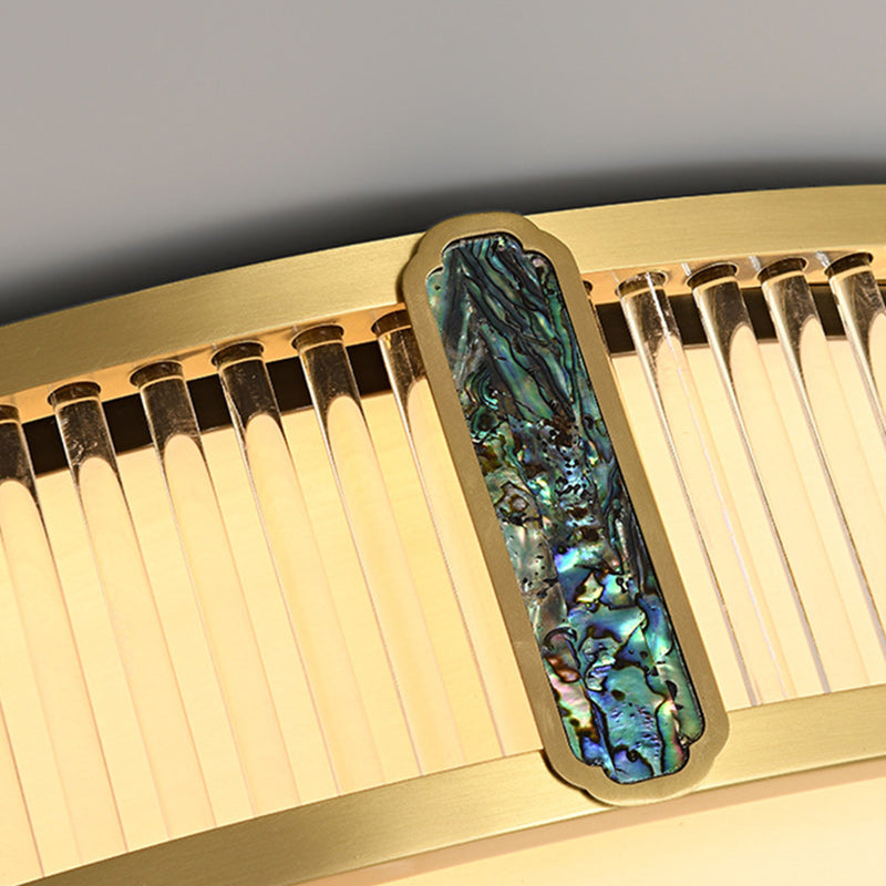 上質な真鍮、ストライプガラス、そして貝殻のアクセントで仕上げられた、伝統的な中国風の埋め込み式シーリングライト。寝室やリビングルームに落ち着いた優雅さをもたらします。丸型、正方形、長方形のデザインからお選びいただけます。細部までこだわった職人技と、時代を超越した黒と真鍮の仕上げが特徴です。