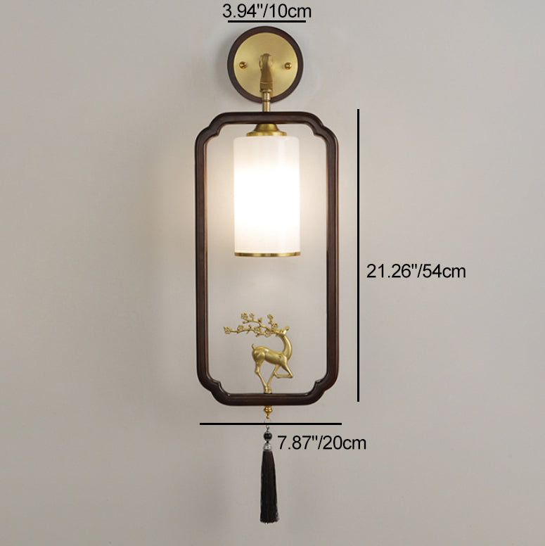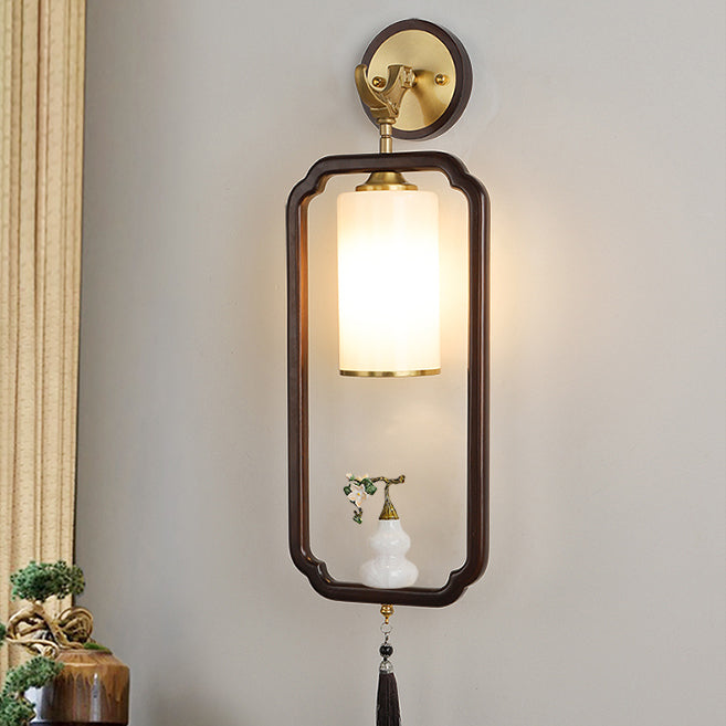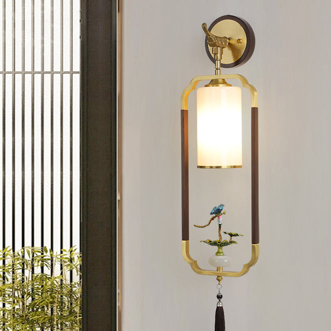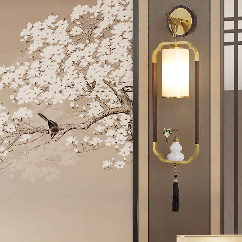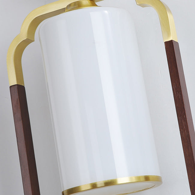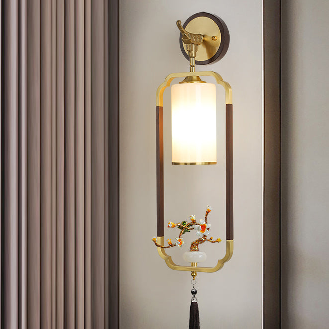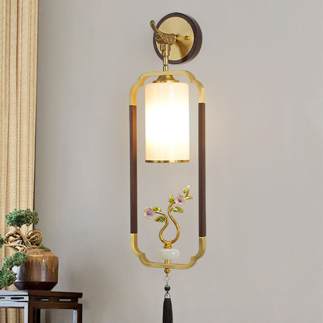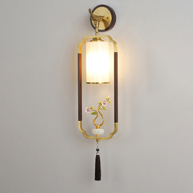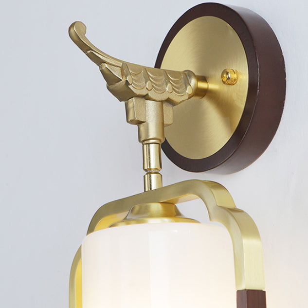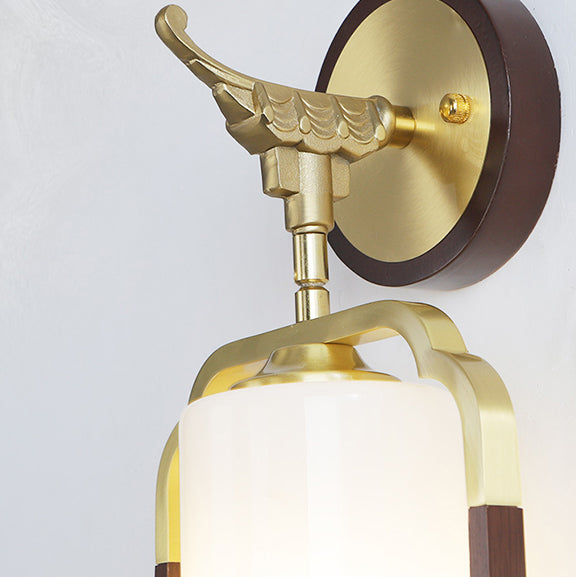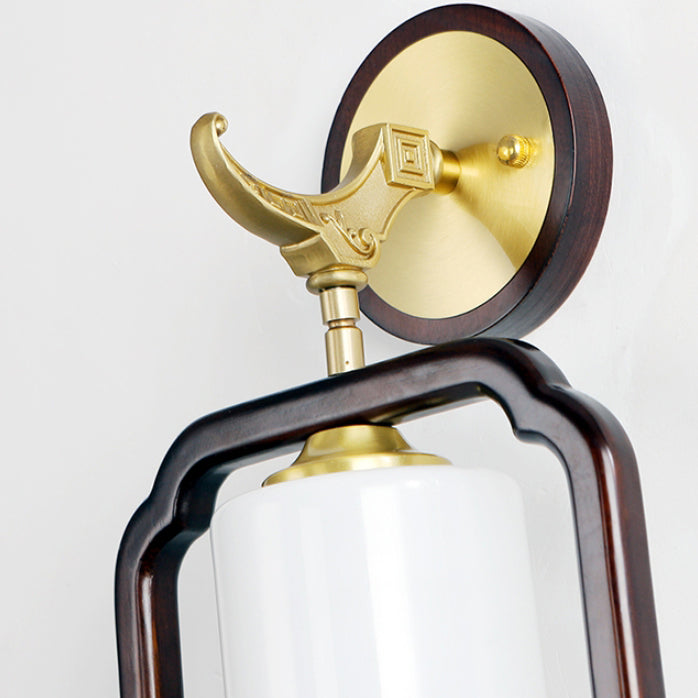 伝統的な中国製多角形銅フレーム円筒ガラスランプシェードウォールナット1灯リビングルーム用壁取り付け用燭台ランプ