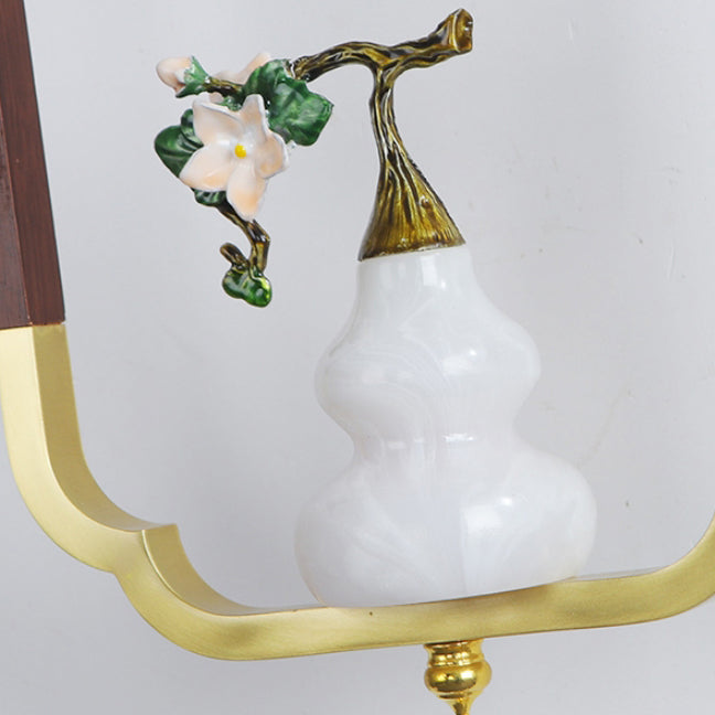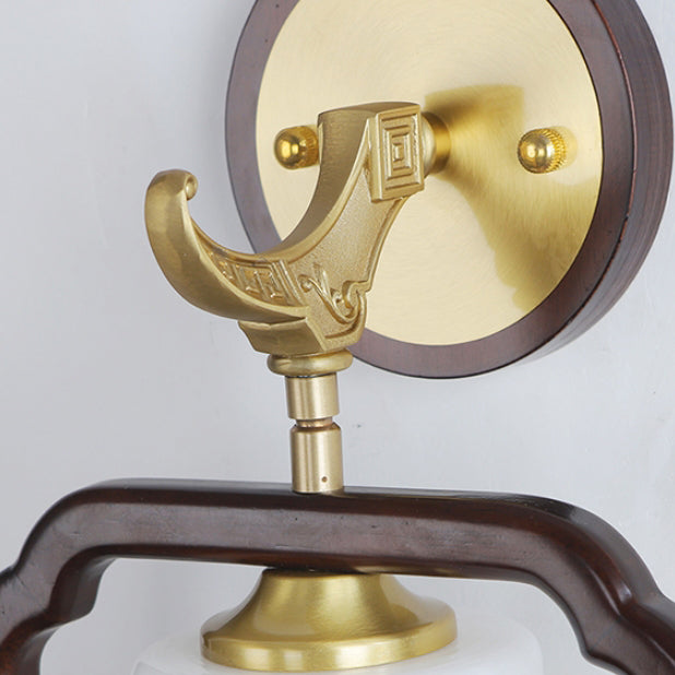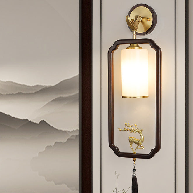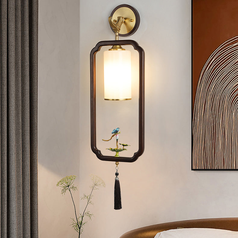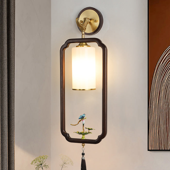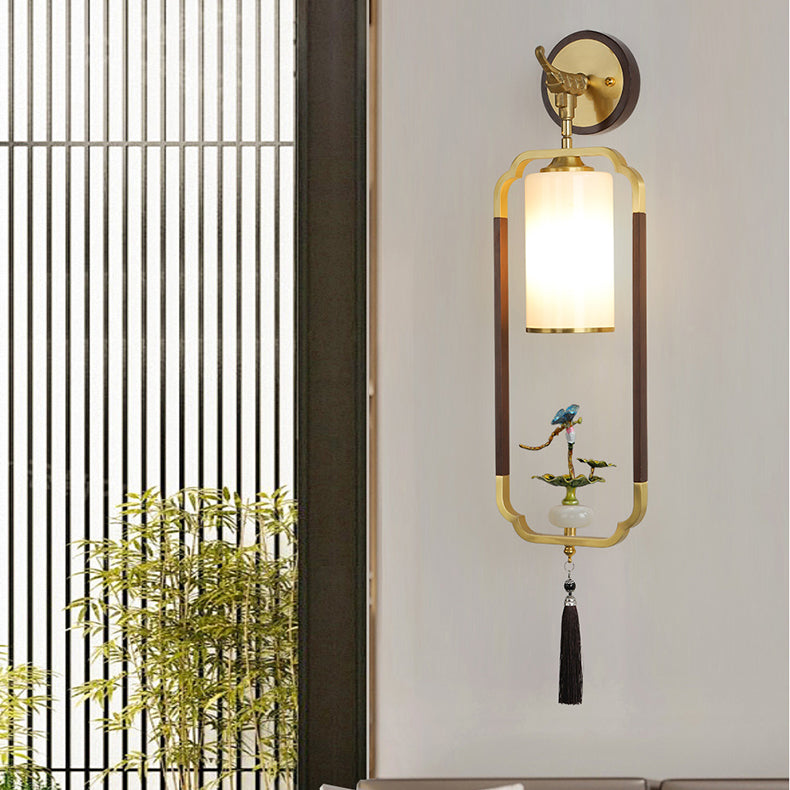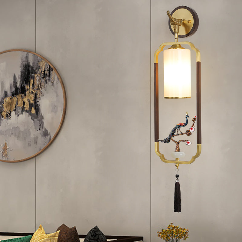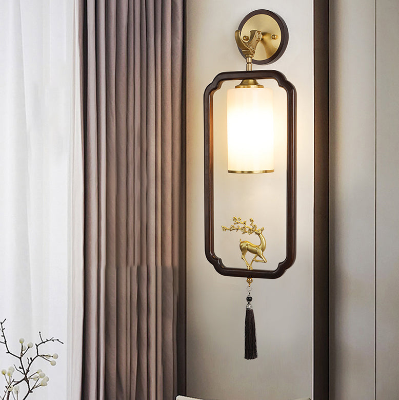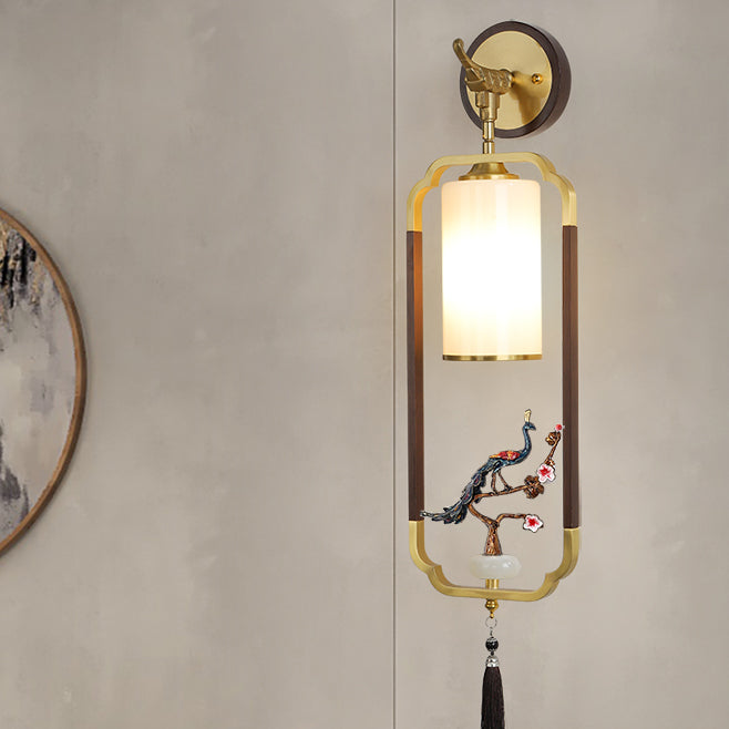 伝統的な中国製多角形銅フレーム円筒ガラスランプシェードウォールナット1灯リビングルーム用壁取り付け用燭台ランプ