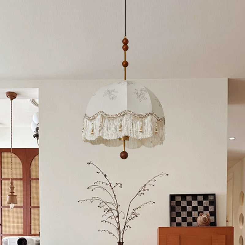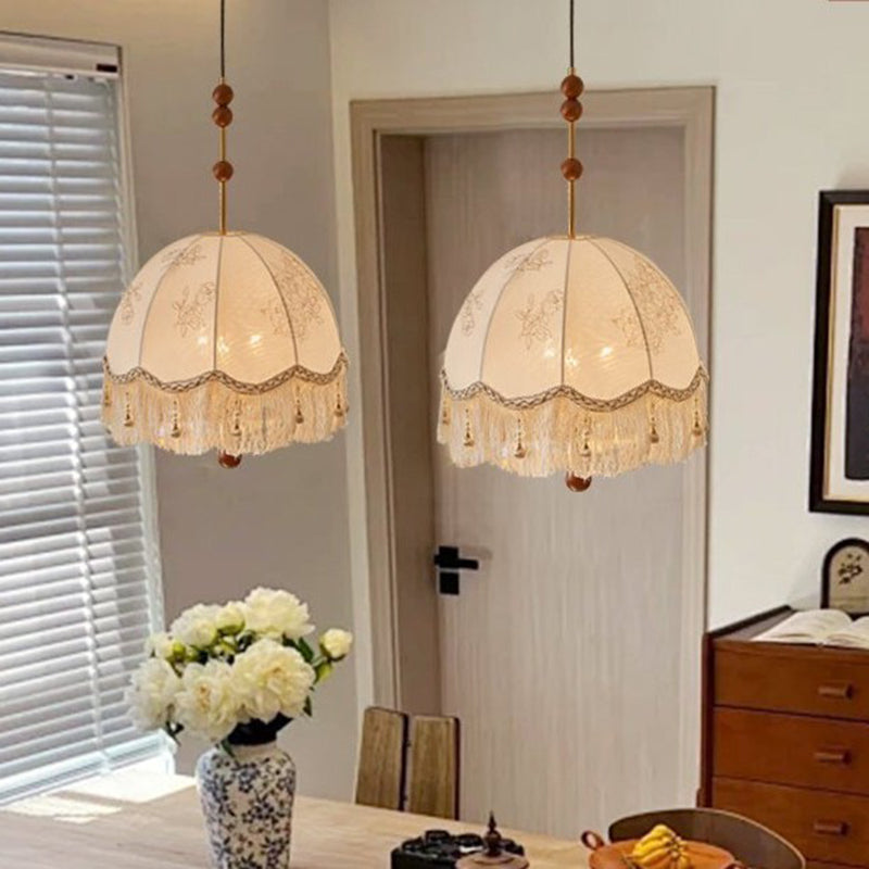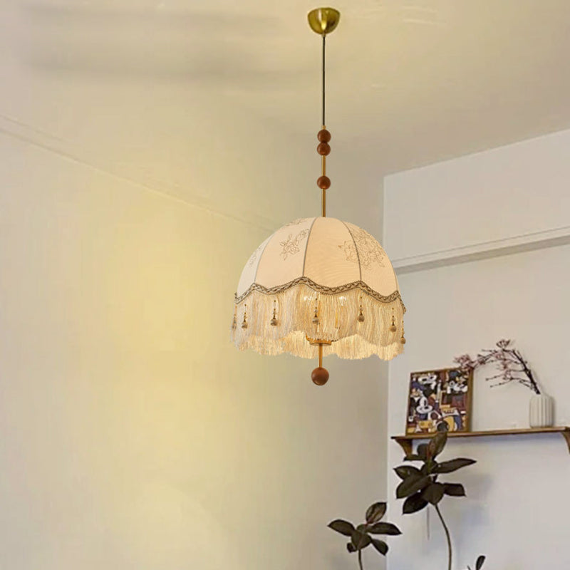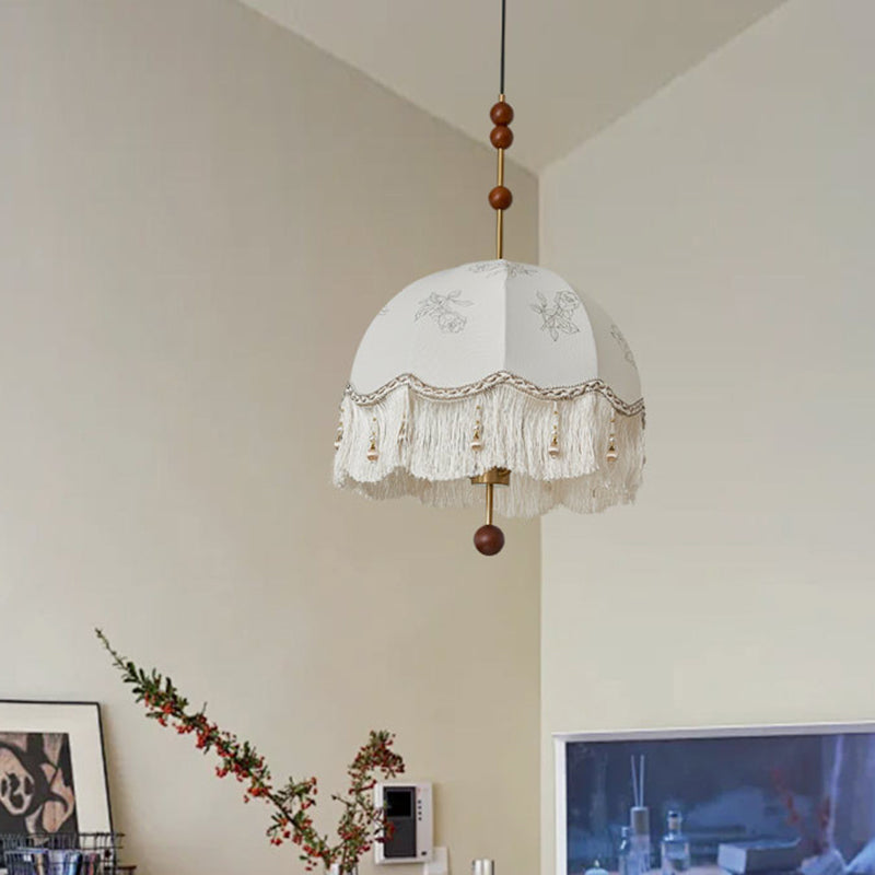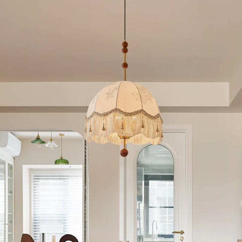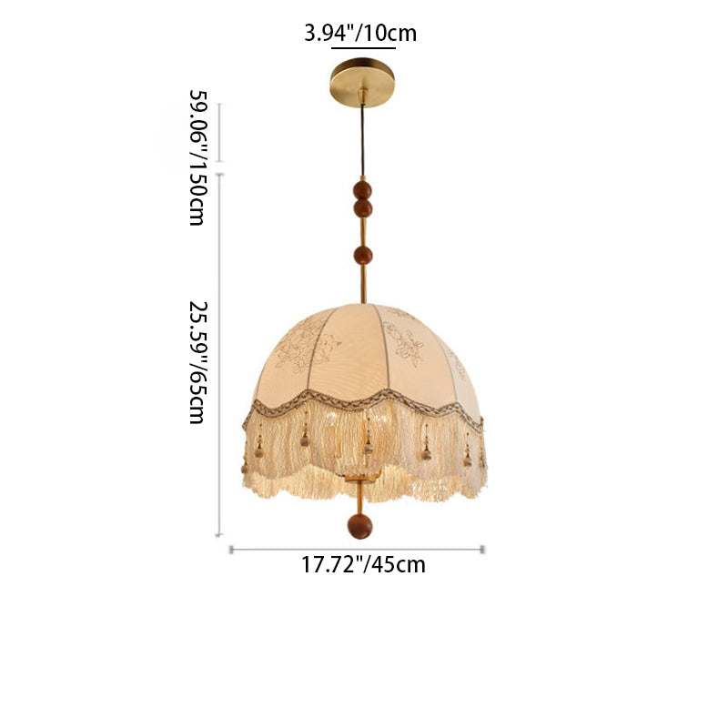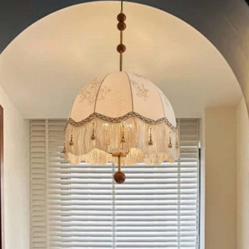 伝統的なフレンチドーム型ラウンドタッセルフローラルプリントファブリックシェード木製アイアンフレーム3灯ペンダントライトリビングルーム用