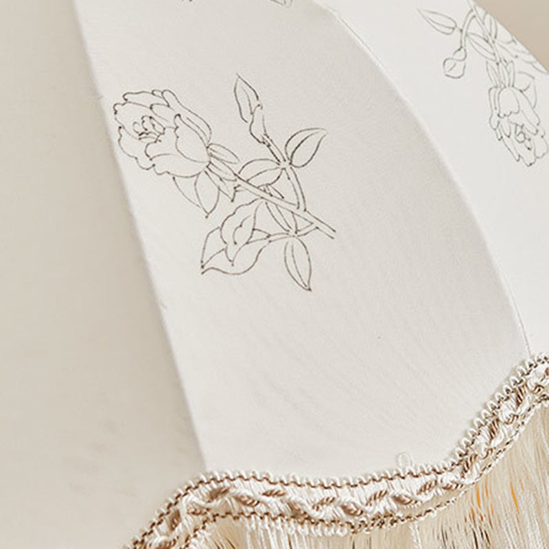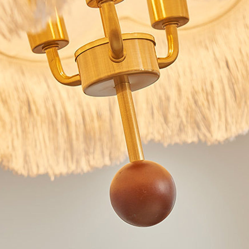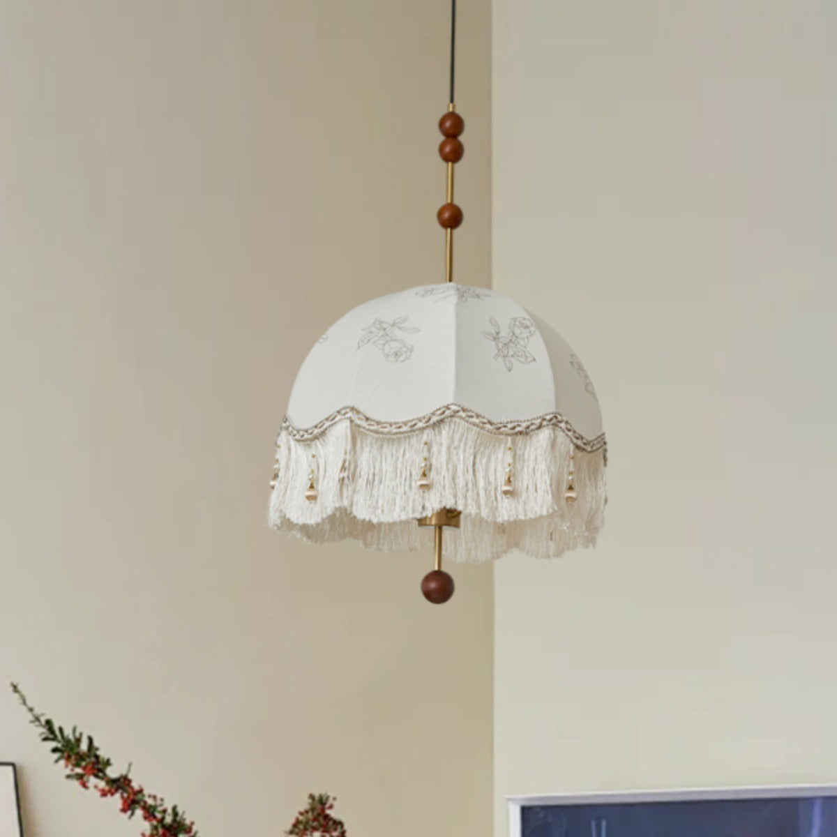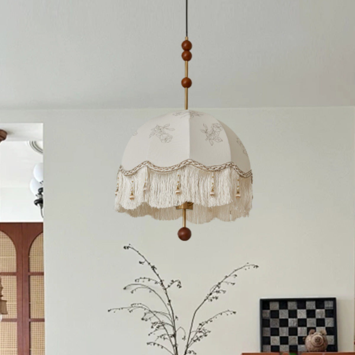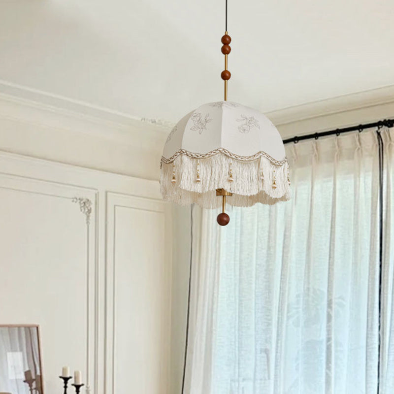 伝統的なフレンチドーム型ラウンドタッセルフローラルプリントファブリックシェード木製アイアンフレーム3灯ペンダントライトリビングルーム用