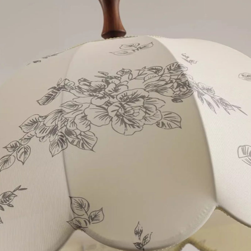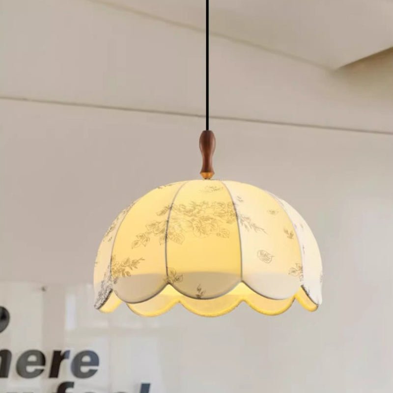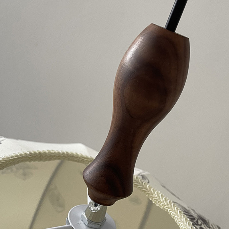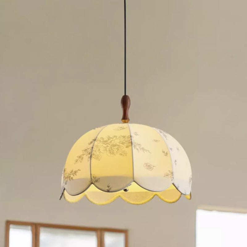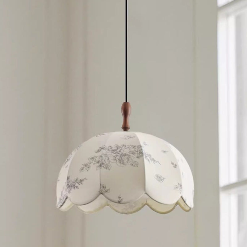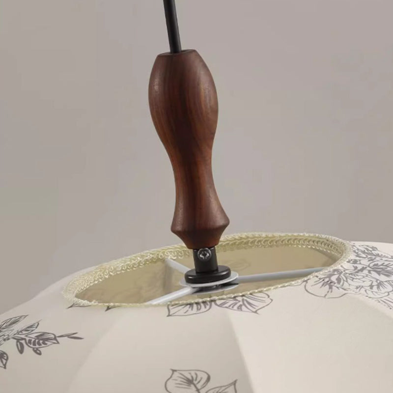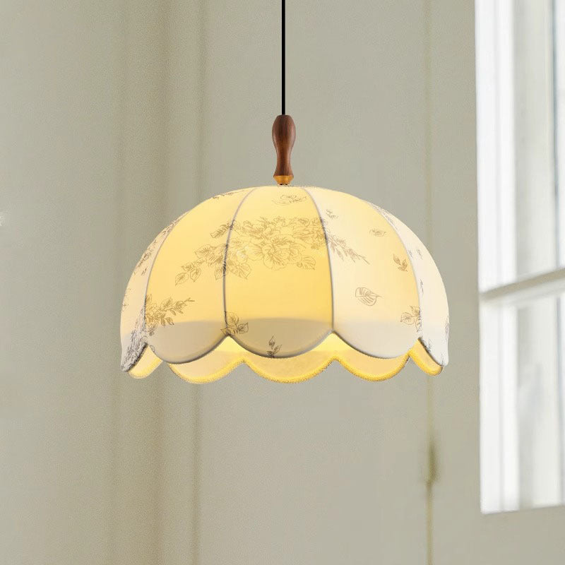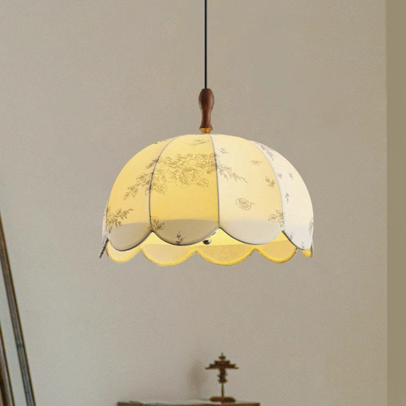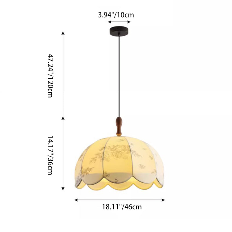 伝統的なフレンチドーム型ラウンドウェーブ無垢材アイアンフレームファブリックシェード3灯ペンダントライト(リビングルーム用)