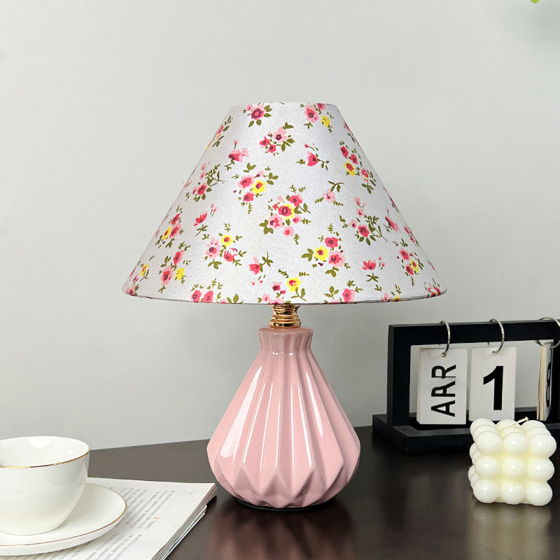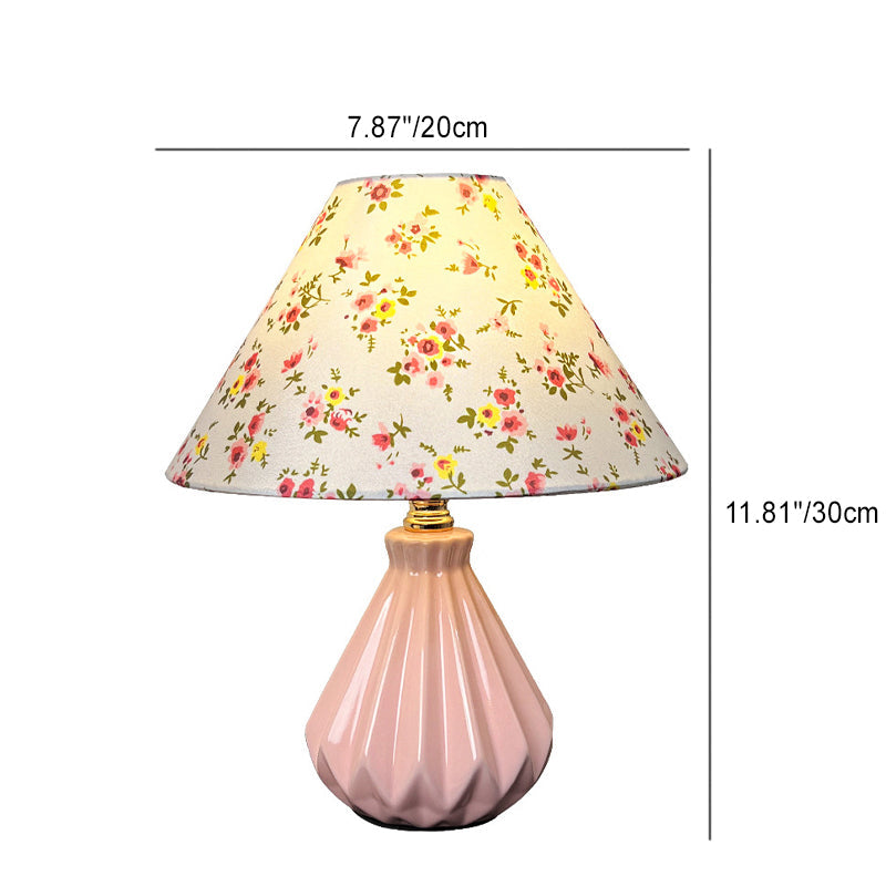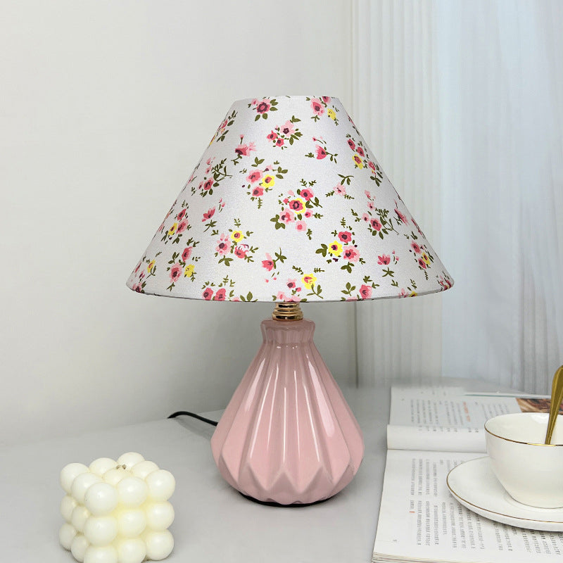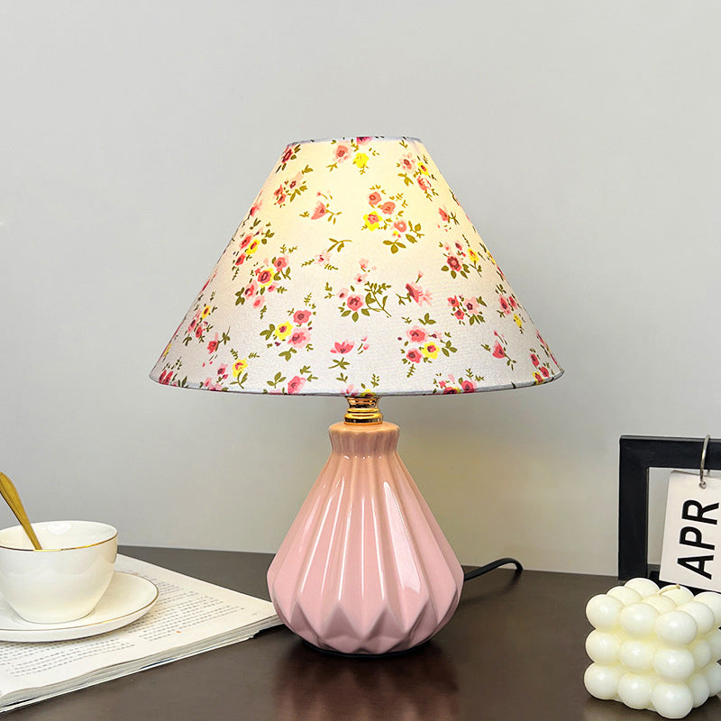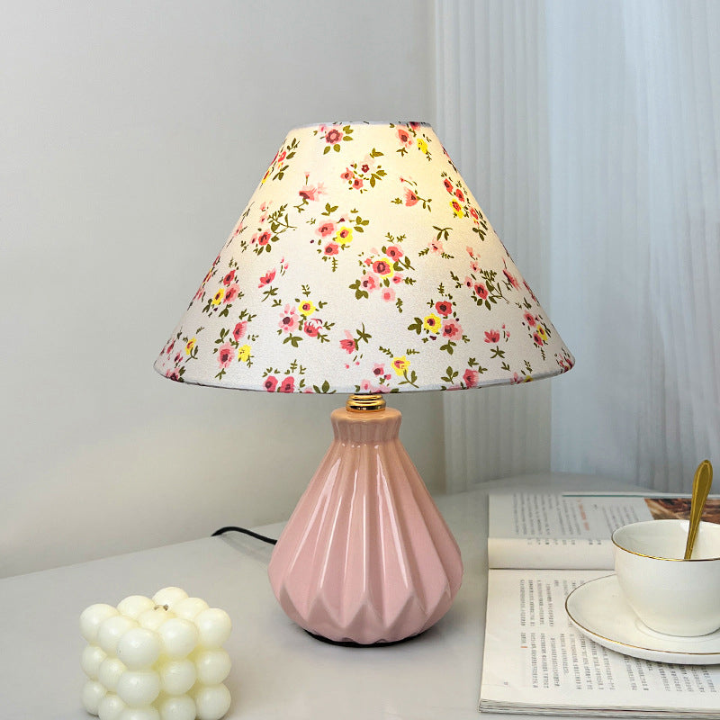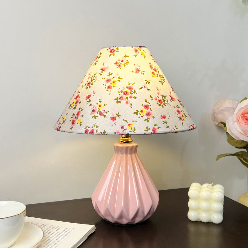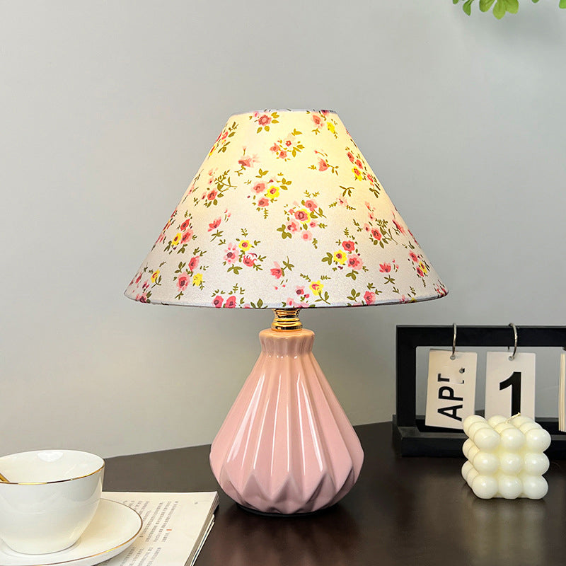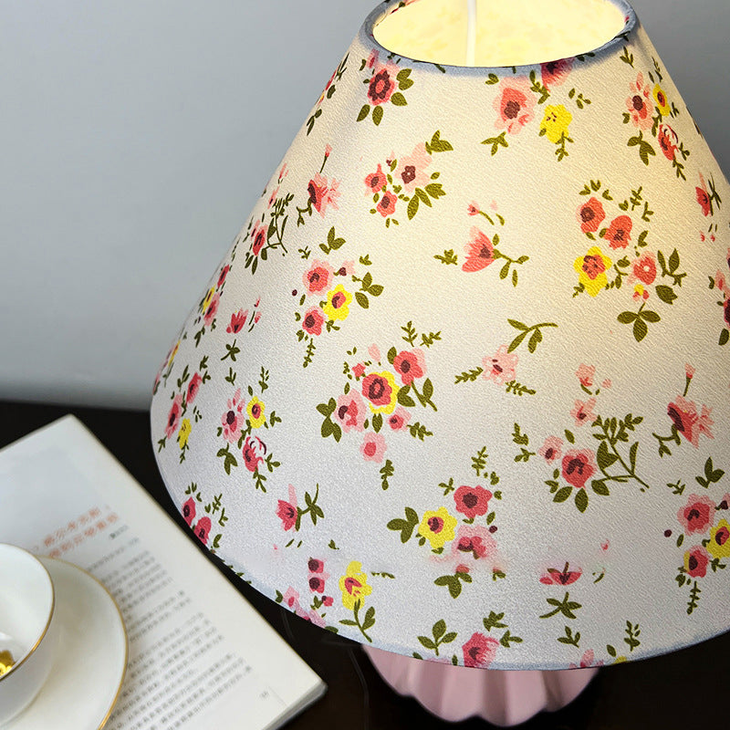 Traditional French Fabric Ceramic Flower Conic 1-Light Table Lamp For Bedside