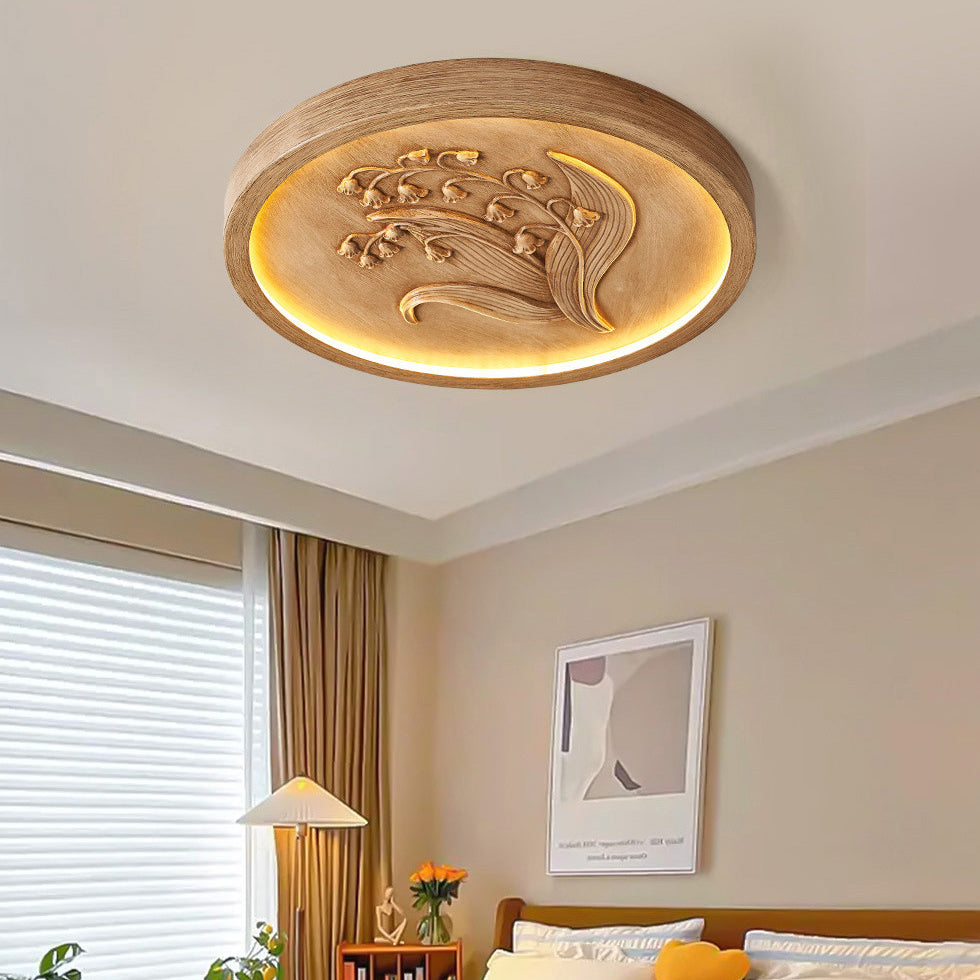 伝統的なフランス製樹脂製鉄製アクリル製ラウンド型彫刻入りすずらんLEDフラッシュマウントシーリングライト寝室用