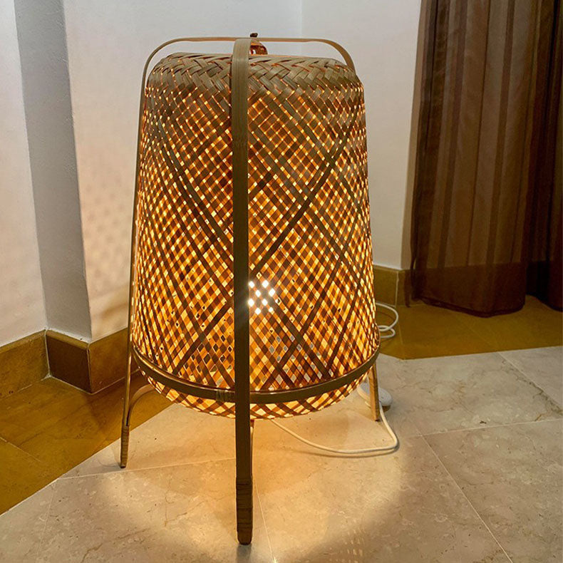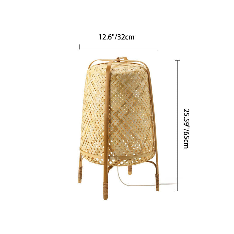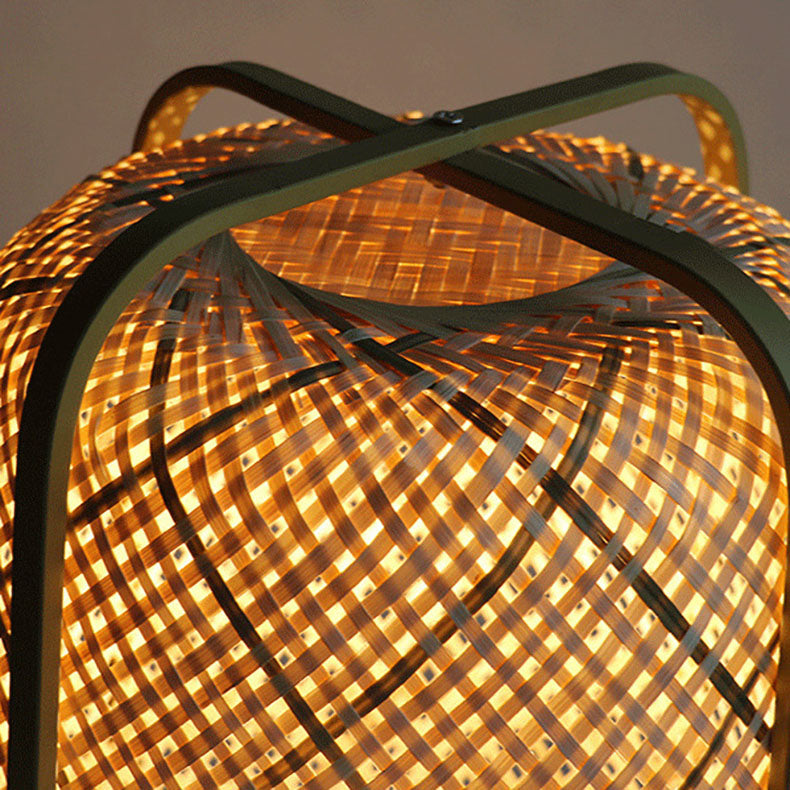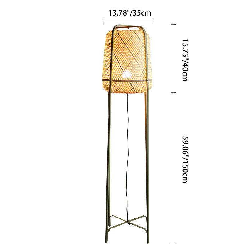 Traditional Japanese Cylindrical Hand-Woven Bamboo 1-Light Standing Floor Lamp For Bedroom