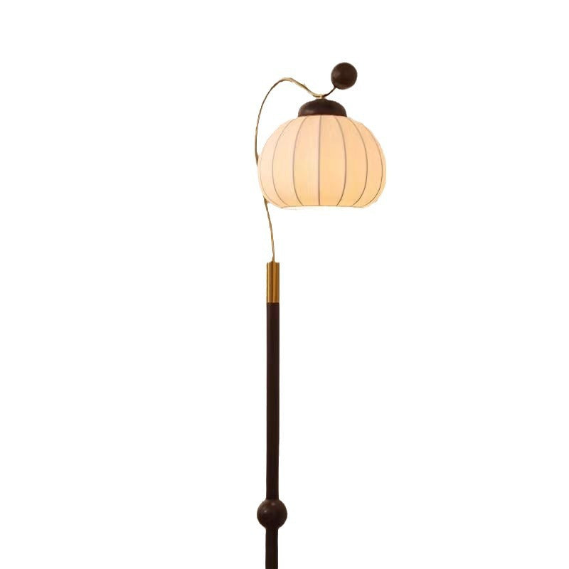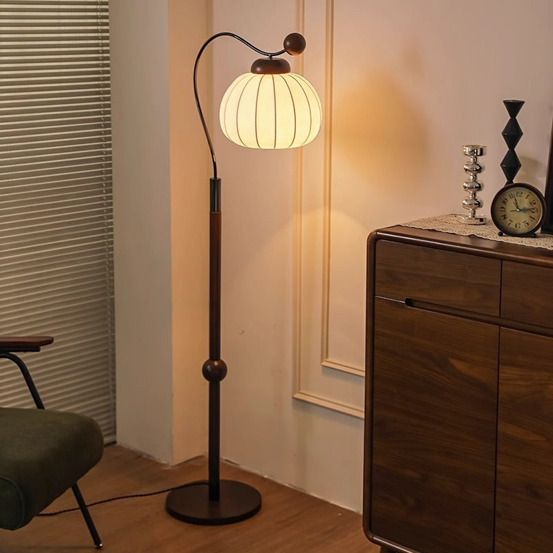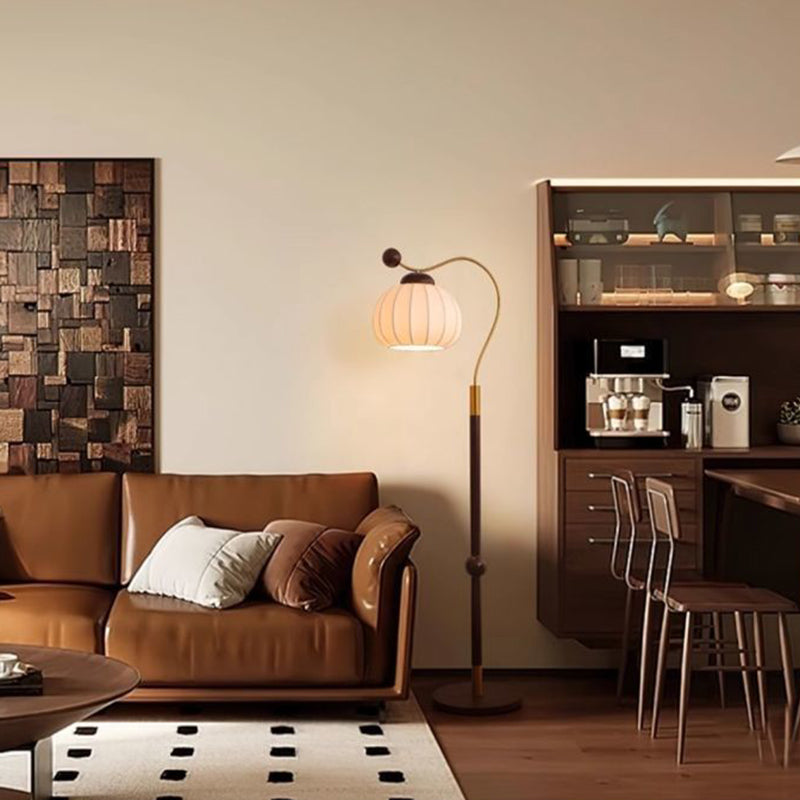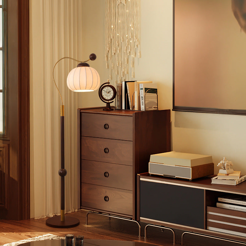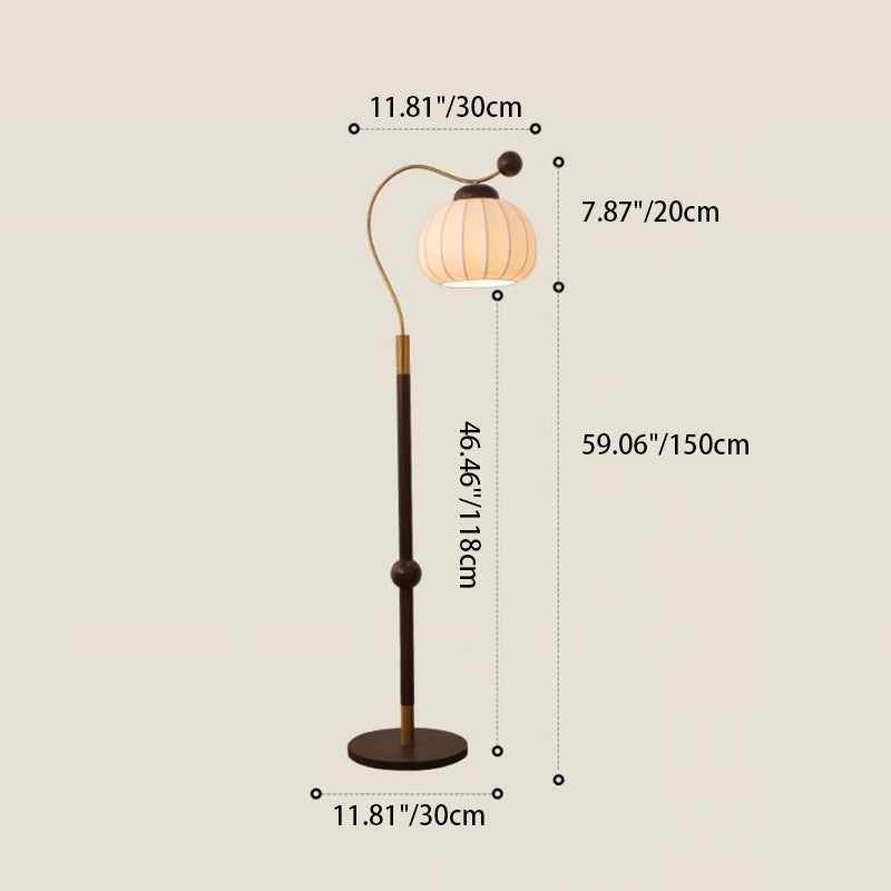 Traditional Japanese Silk Round Shade Wood Aluminum Pole 1-Light Standing Floor Lamp For Living Room