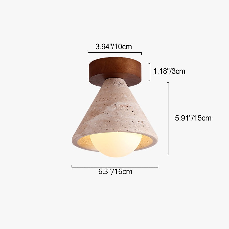 手作業で磨き上げられたナチュラルイエローのトラバーチンシェードとウォールナット材のベースが特徴の、1灯のセミフラッシュマウント型。丸みを帯びた円錐形のシルエットが、柔らかくアースカラーの雰囲気を醸し出します。リビングルームに最適な、ミッドセンチュリースタイルと落ち着いたナチュラルな質感が融合した照明です。