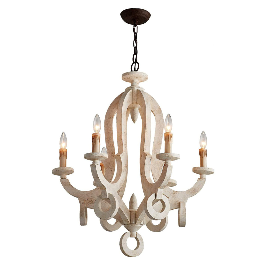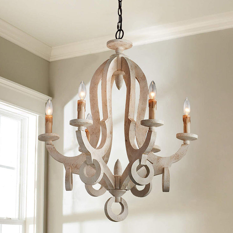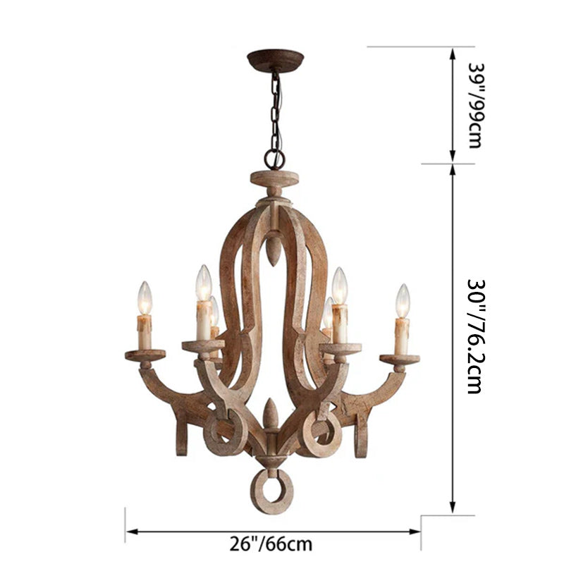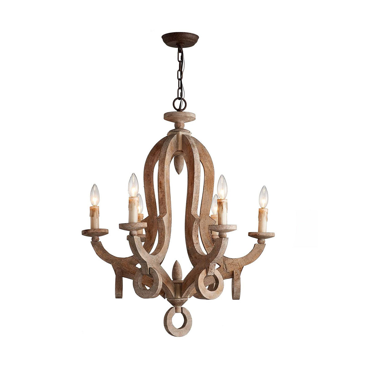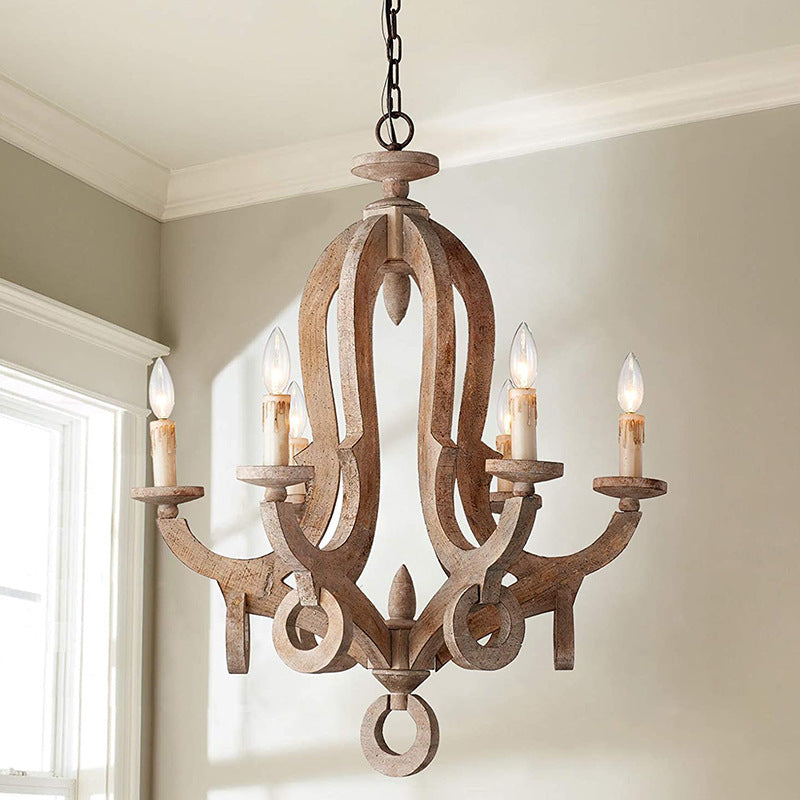 伝統的な素朴なキャンドルスティック木製ガラス6灯シャンデリア(リビングルーム用)