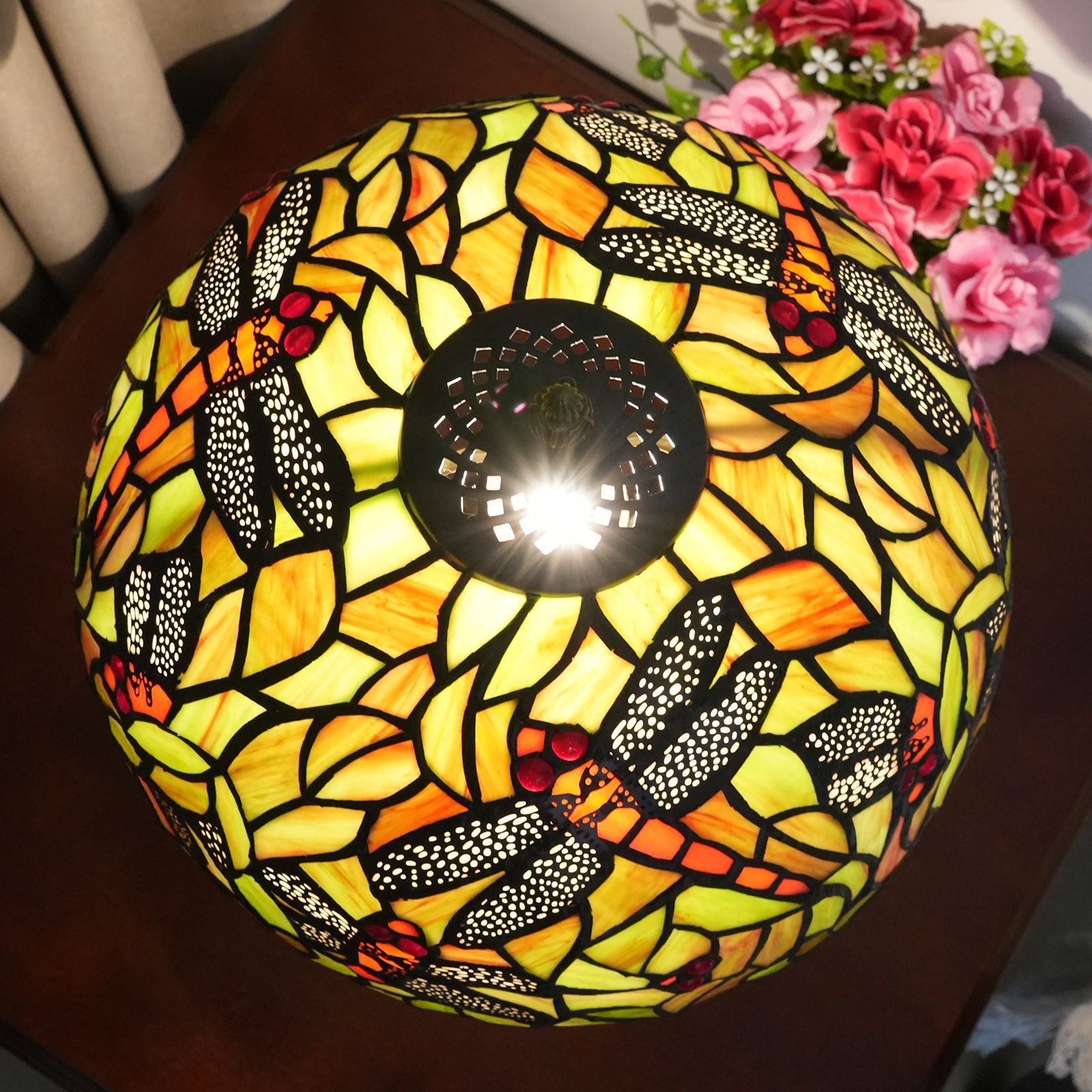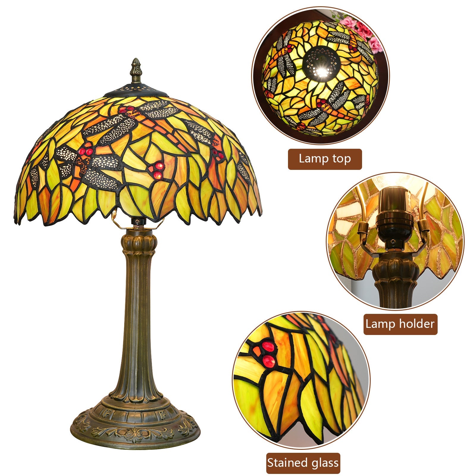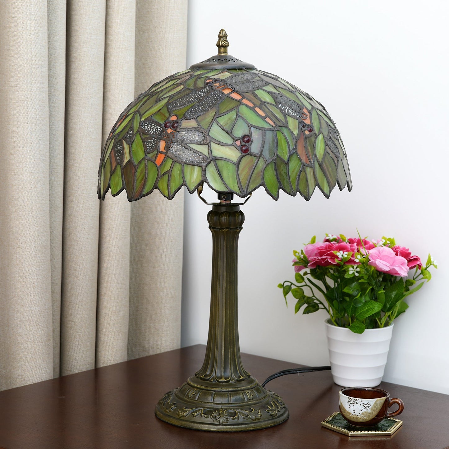 Traditional Tiffany Cylinder Half Round Disc Base Dragonfly Leaf Aluminum Glass 1-Light Table Lamp For Bedroom