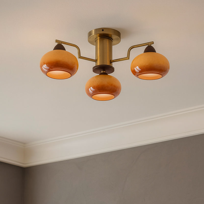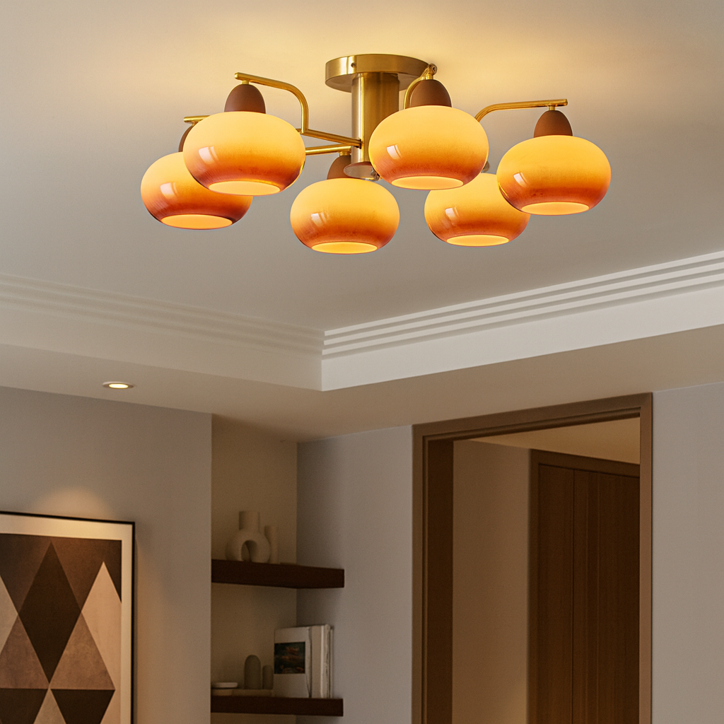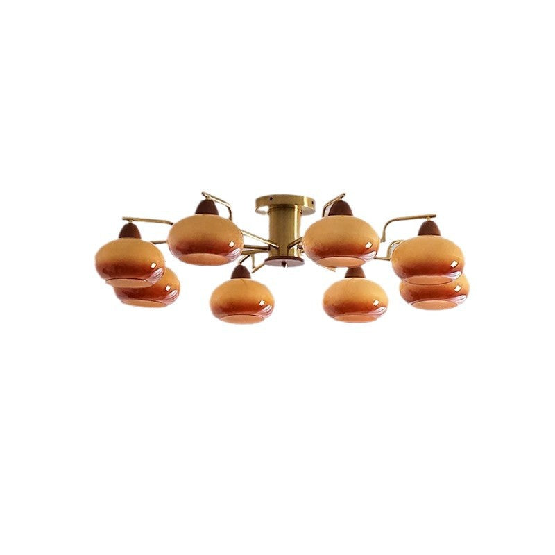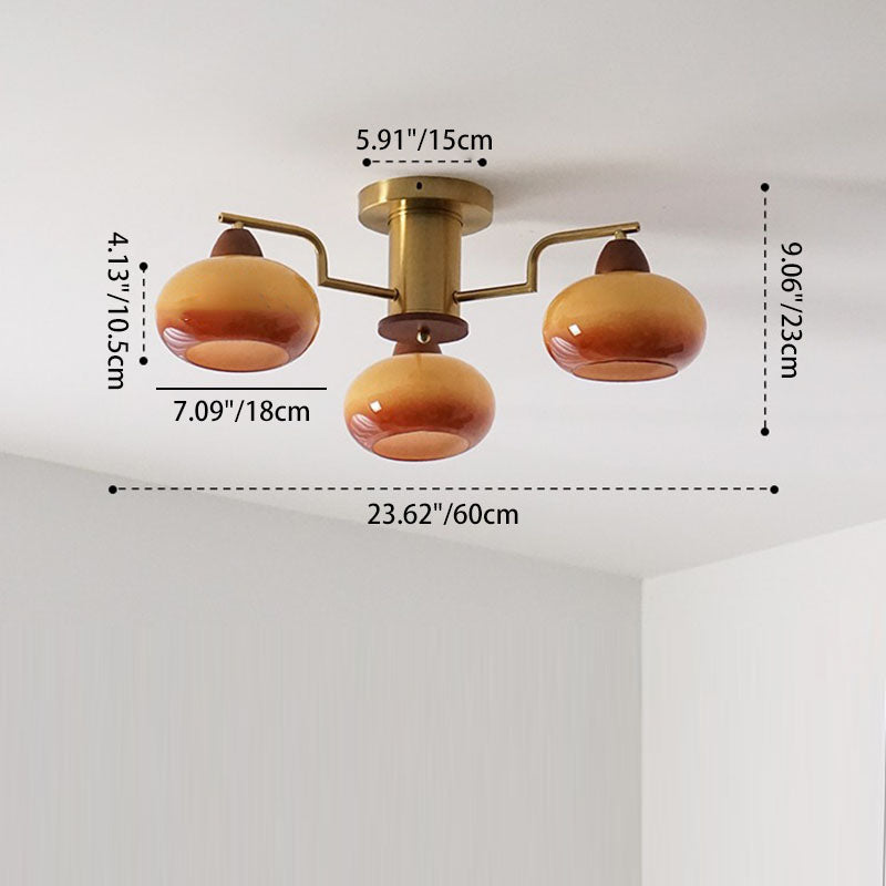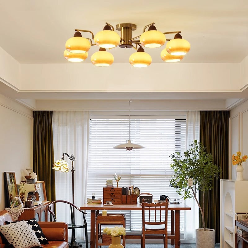 伝統的なヴィンテージアイアンガラスウッドパーシモンラウンド3/6/8ライトセミフラッシュマウントシーリングライトリビングルーム用
