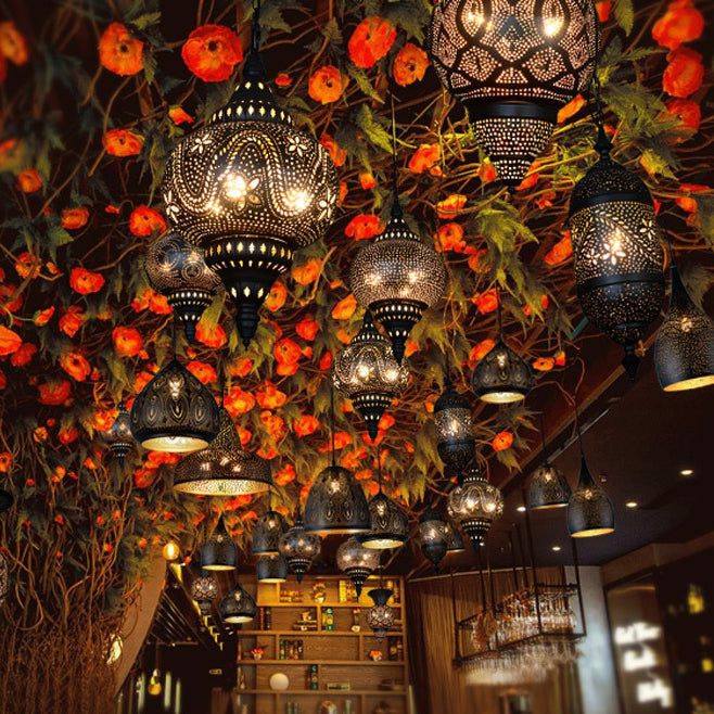伝統的なヴィンテージオーバルドロップ中空パターンアイアン1ライトペンダントライトリビングルーム用