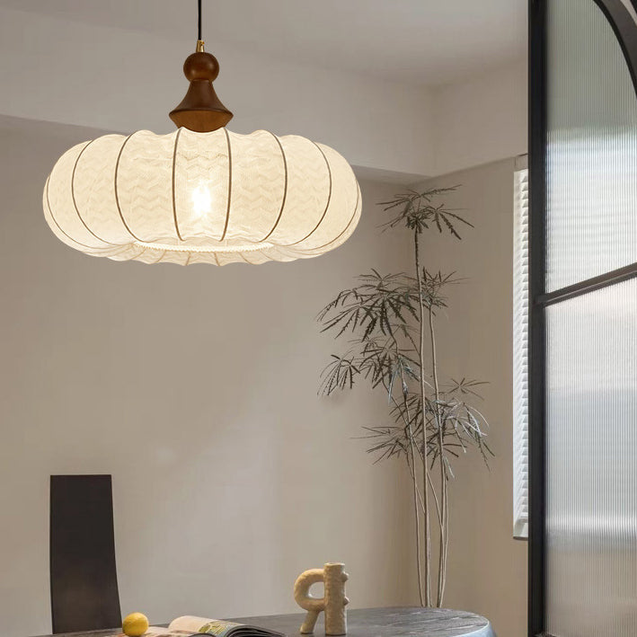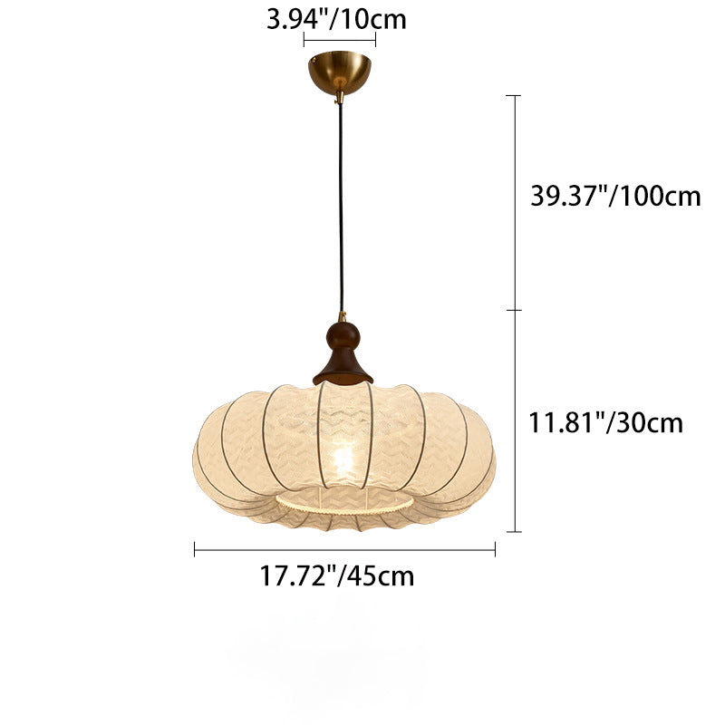 この1灯シャンデリアは、天然シルク、ウォールナット材、金属を用いてランタンをイメージした丸型デザインで、伝統的なヴィンテージの魅力とモダンなミニマリズムが融合しています。目に優しく、ブルーライトの心配もありません。温かみのある間接照明を求める寝室やリビングルームに最適です。