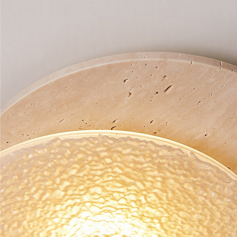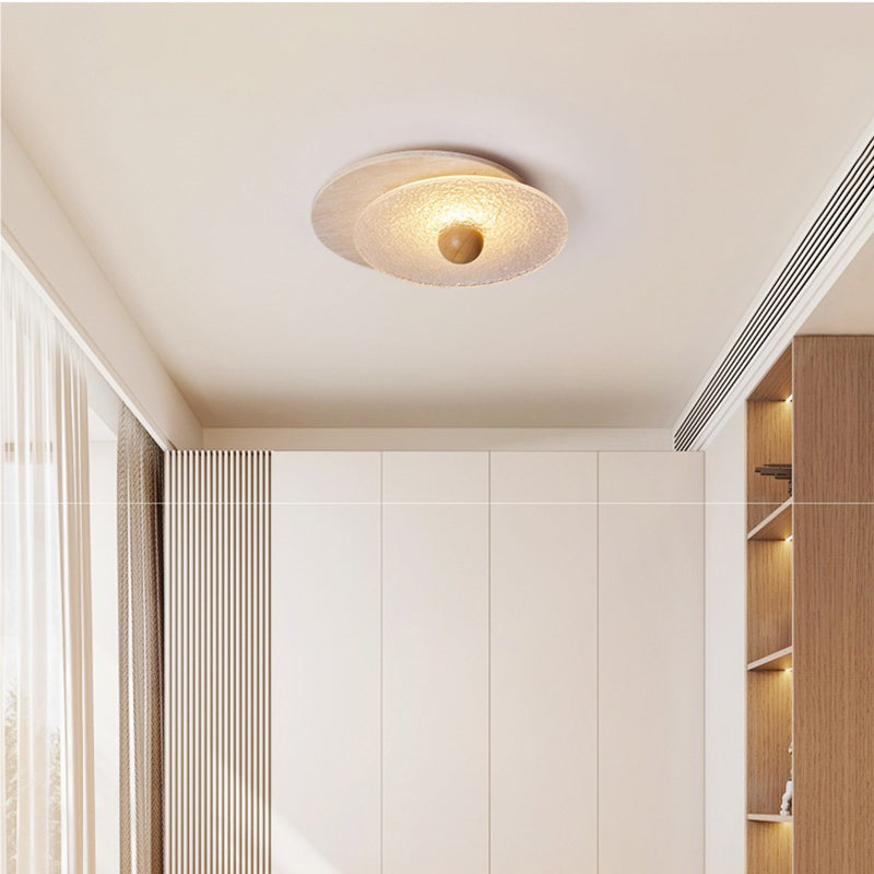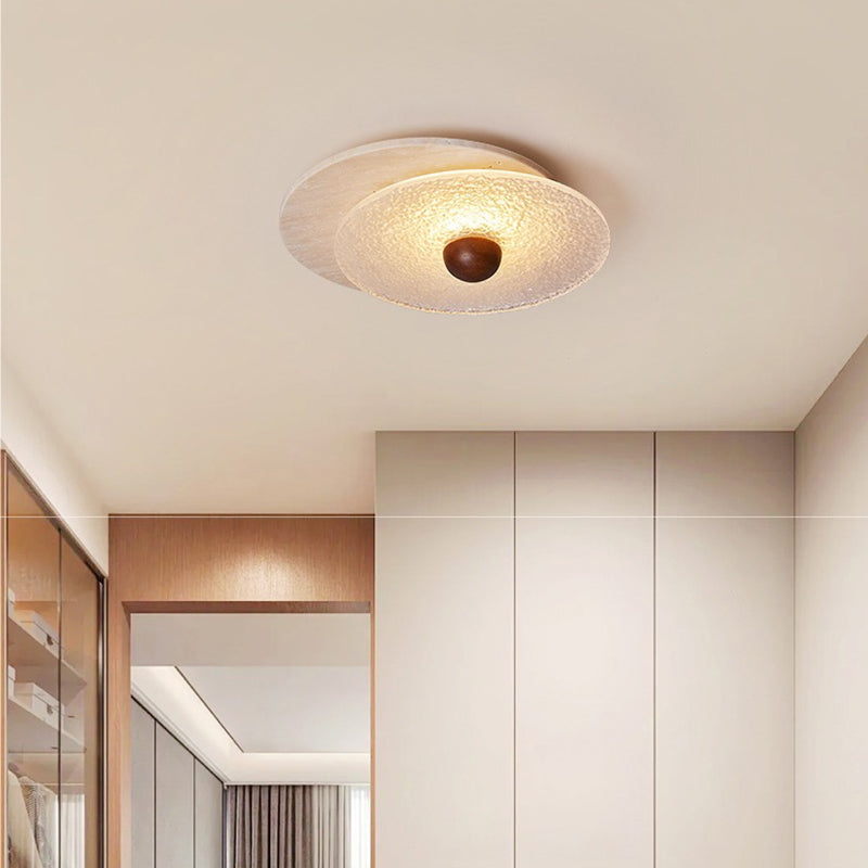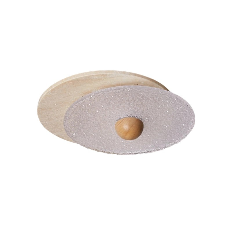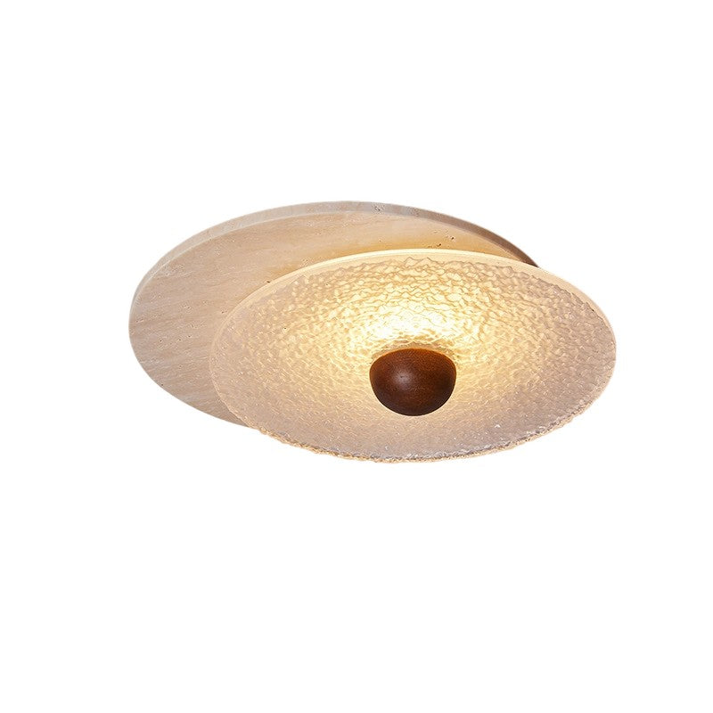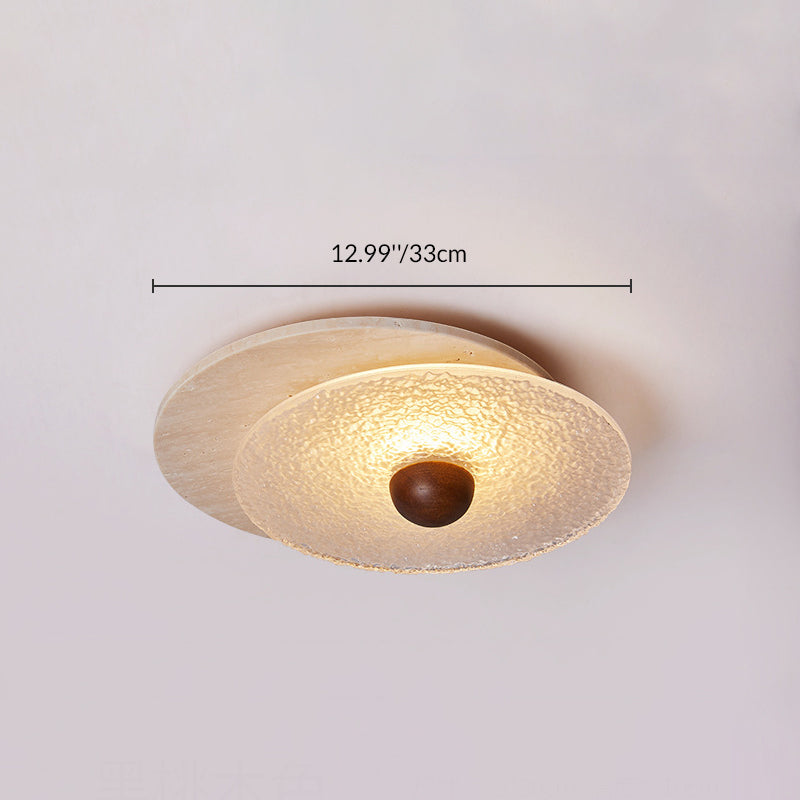 伝統的なヴィンテージトラバーチンウッドガラススタックラウンドLEDフラッシュマウントシーリングライト寝室用