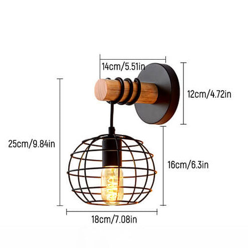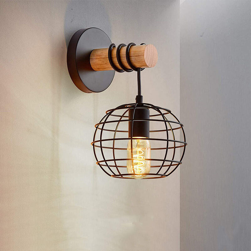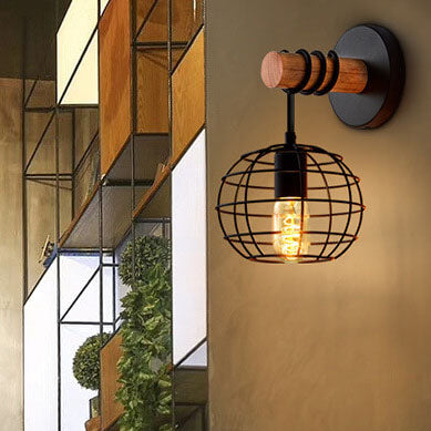 ヴィンテージ錬鉄製ブラックラウンドアイアンシェード1灯壁付け照明