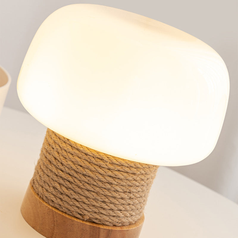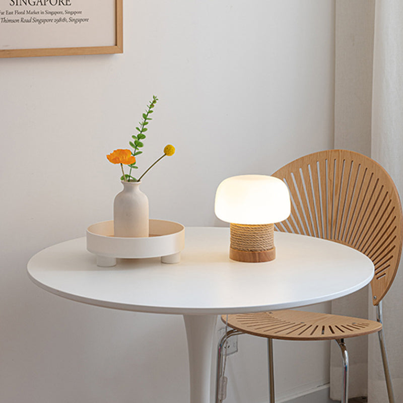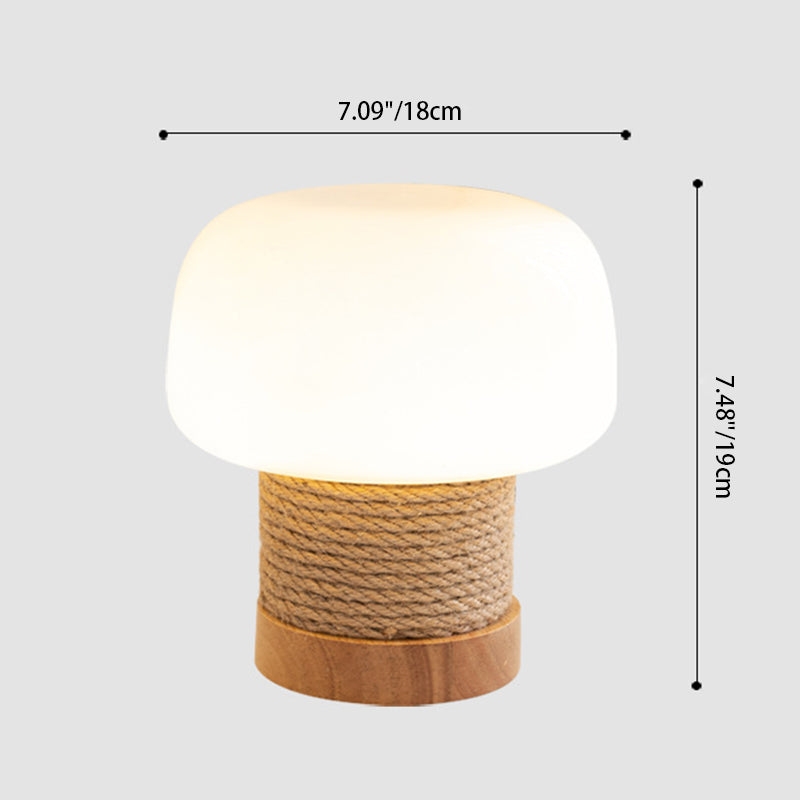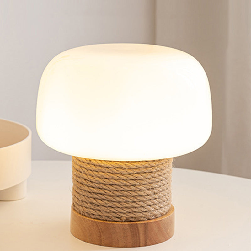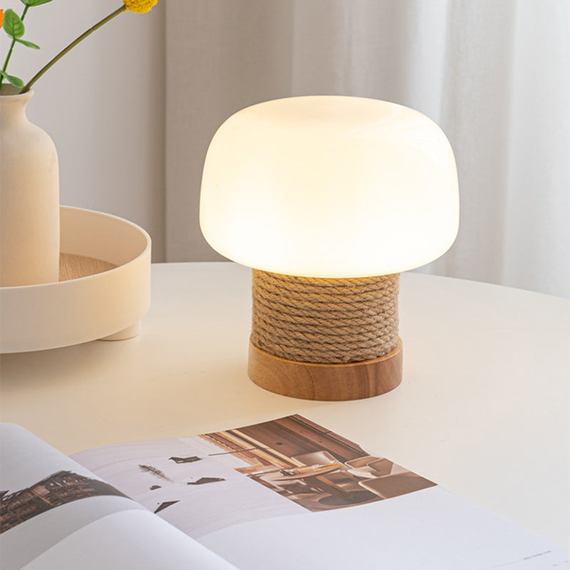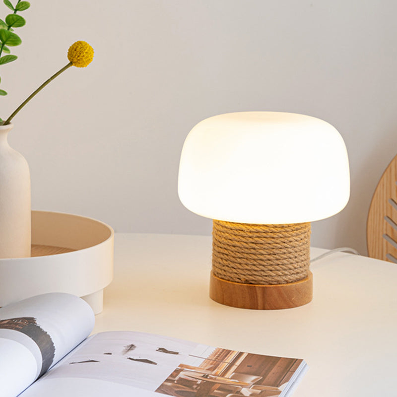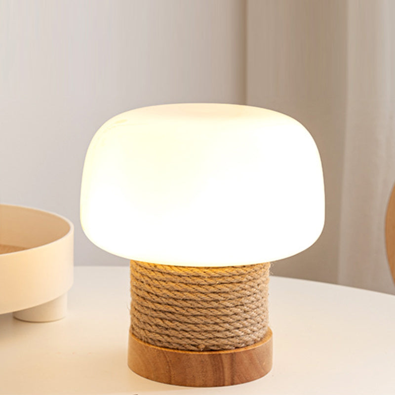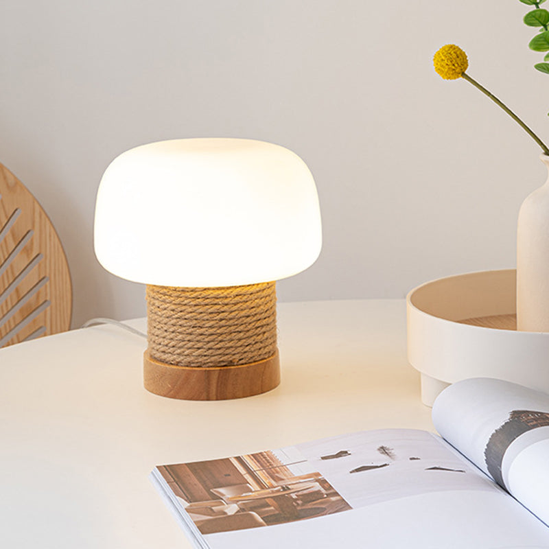 Contemporary Creative Cream Mushroom Round Cylinder Wood Hemp Rope Glass 1-Light Table Lamp For Bedroom
