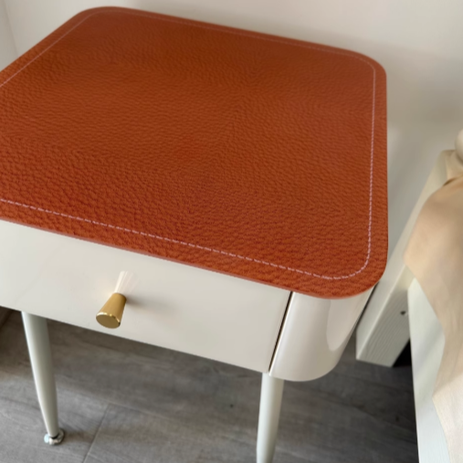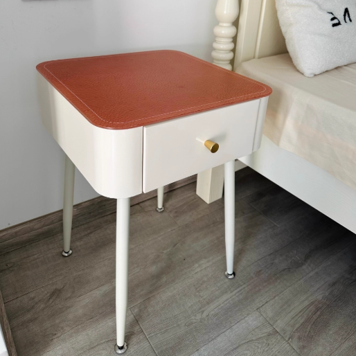 このコンパクトなナイトスタンドは、スクエア型のシルエットに、レザーのような風合いと質感を再現した独自のナノグレーズ加工強化ガラス天板を採用しています。ブラウンとホワイトを基調としたモダンな北欧スタイルで、ベッドサイドの収納に便利な引き出しが1つ付いています。狭い寝室やミニマルなインテリアに最適です。