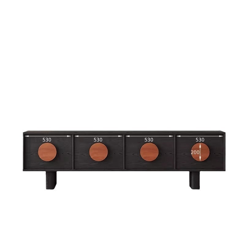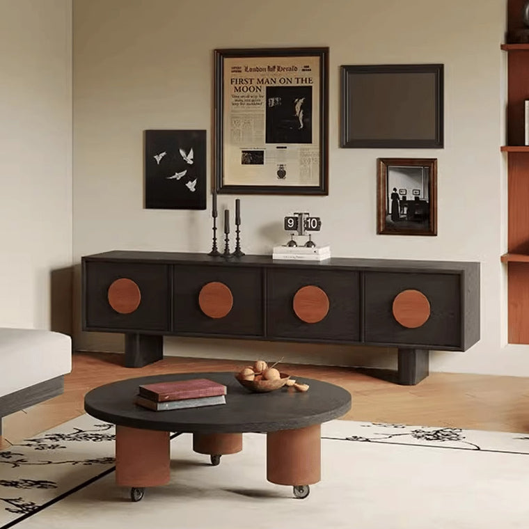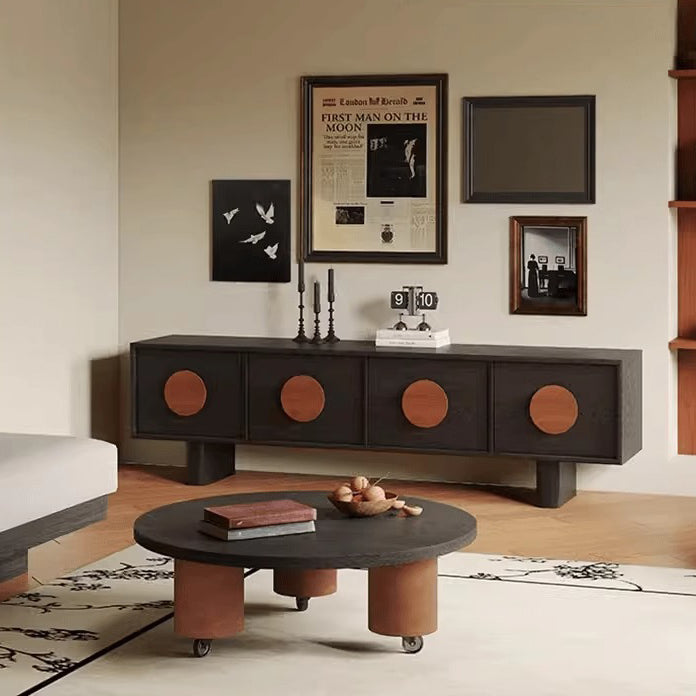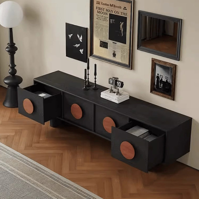 This stylish contemporary retro TV cabinet in black features a spacious rectangular design with 4 drawers for organized storage. Crafted from durable pine or waxed wood, it adds a touch of classic French elegance to your living room or bedroom, combining beauty with functionality. Perfect for modern and retro home décor styles.
